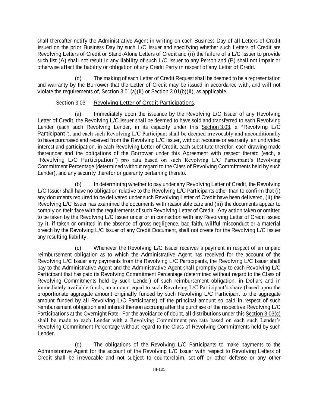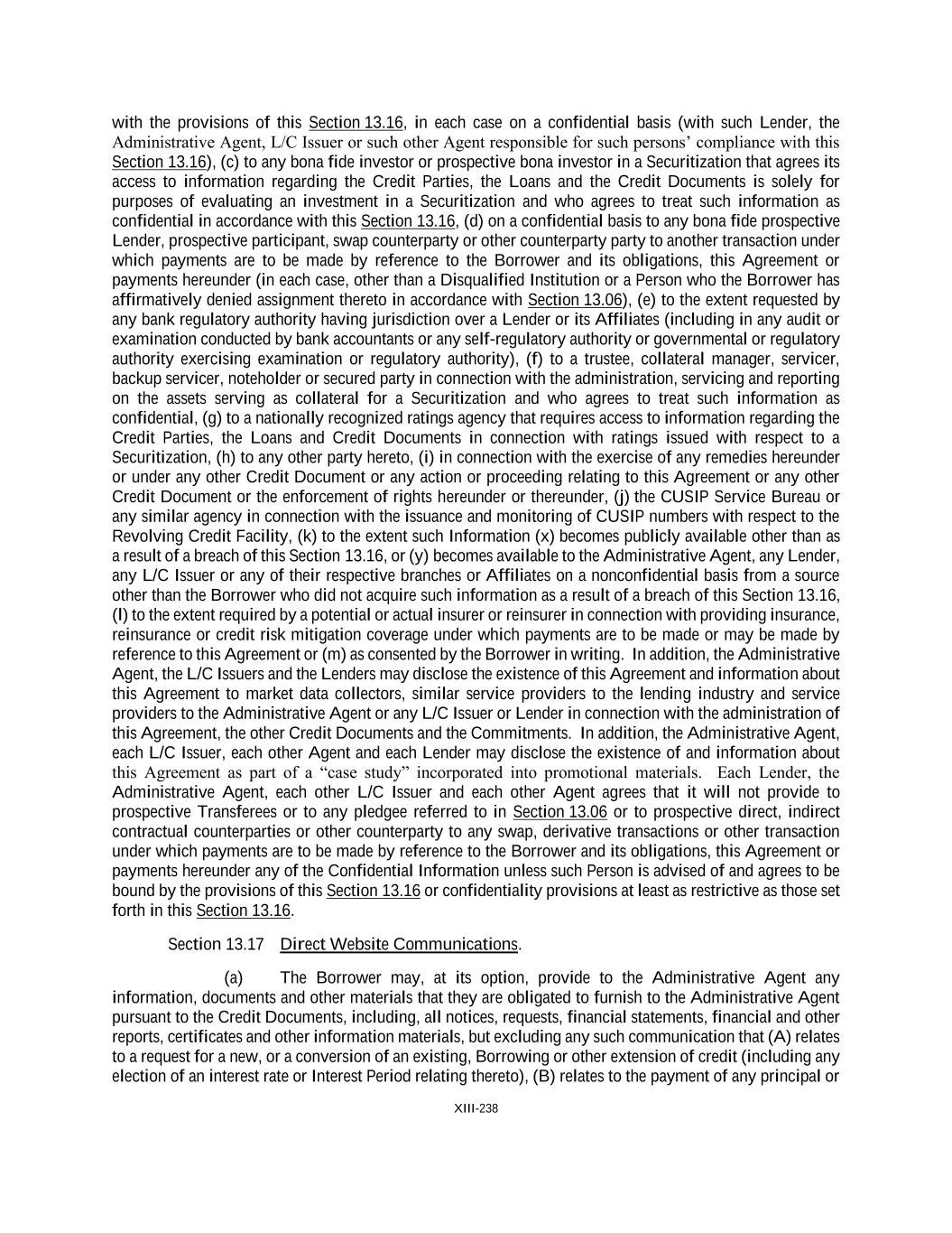XIII-238 with the provisions of this Section 13.16, in each case on a confidential basis (with such Lender, the Administrative Agent, L/C Issuer or such other Agent responsible for such persons’ compliance with this Section 13.16), (c) to any bona fide investor or prospective bona investor in a Securitization that agrees its access to information regarding the Credit Parties, the Loans and the Credit Documents is solely for purposes of evaluating an investment in a Securitization and who agrees to treat such information as confidential in accordance with this Section 13.16, (d) on a confidential basis to any bona fide prospective Lender, prospective participant, swap counterparty or other counterparty party to another transaction under which payments are to be made by reference to the Borrower and its obligations, this Agreement or payments hereunder (in each case, other than a Disqualified Institution or a Person who the Borrower has affirmatively denied assignment thereto in accordance with Section 13.06), (e) to the extent requested by any bank regulatory authority having jurisdiction over a Lender or its Affiliates (including in any audit or examination conducted by bank accountants or any self-regulatory authority or governmental or regulatory authority exercising examination or regulatory authority), (f) to a trustee, collateral manager, servicer, backup servicer, noteholder or secured party in connection with the administration, servicing and reporting on the assets serving as collateral for a Securitization and who agrees to treat such information as confidential, (g) to a nationally recognized ratings agency that requires access to information regarding the Credit Parties, the Loans and Credit Documents in connection with ratings issued with respect to a Securitization, (h) to any other party hereto, (i) in connection with the exercise of any remedies hereunder or under any other Credit Document or any action or proceeding relating to this Agreement or any other Credit Document or the enforcement of rights hereunder or thereunder, (j) the CUSIP Service Bureau or any similar agency in connection with the issuance and monitoring of CUSIP numbers with respect to the Revolving Credit Facility, (k) to the extent such Information (x) becomes publicly available other than as a result of a breach of this Section 13.16, or (y) becomes available to the Administrative Agent, any Lender, any L/C Issuer or any of their respective branches or Affiliates on a nonconfidential basis from a source other than the Borrower who did not acquire such information as a result of a breach of this Section 13.16, (l) to the extent required by a potential or actual insurer or reinsurer in connection with providing insurance, reinsurance or credit risk mitigation coverage under which payments are to be made or may be made by reference to this Agreement or (m) as consented by the Borrower in writing. In addition, the Administrative Agent, the L/C Issuers and the Lenders may disclose the existence of this Agreement and information about this Agreement to market data collectors, similar service providers to the lending industry and service providers to the Administrative Agent or any L/C Issuer or Lender in connection with the administration of this Agreement, the other Credit Documents and the Commitments. In addition, the Administrative Agent, each L/C Issuer, each other Agent and each Lender may disclose the existence of and information about this Agreement as part of a “case study” incorporated into promotional materials. Each Lender, the Administrative Agent, each other L/C Issuer and each other Agent agrees that it will not provide to prospective Transferees or to any pledgee referred to in Section 13.06 or to prospective direct, indirect contractual counterparties or other counterparty to any swap, derivative transactions or other transaction under which payments are to be made by reference to the Borrower and its obligations, this Agreement or payments hereunder any of the Confidential Information unless such Person is advised of and agrees to be bound by the provisions of this Section 13.16 or confidentiality provisions at least as restrictive as those set forth in this Section 13.16. Section 13.17 Direct Website Communications. (a) The Borrower may, at its option, provide to the Administrative Agent any information, documents and other materials that they are obligated to furnish to the Administrative Agent pursuant to the Credit Documents, including, all notices, requests, financial statements, financial and other reports, certificates and other information materials, but excluding any such communication that (A) relates to a request for a new, or a conversion of an existing, Borrowing or other extension of credit (including any election of an interest rate or Interest Period relating thereto), (B) relates to the payment of any principal or