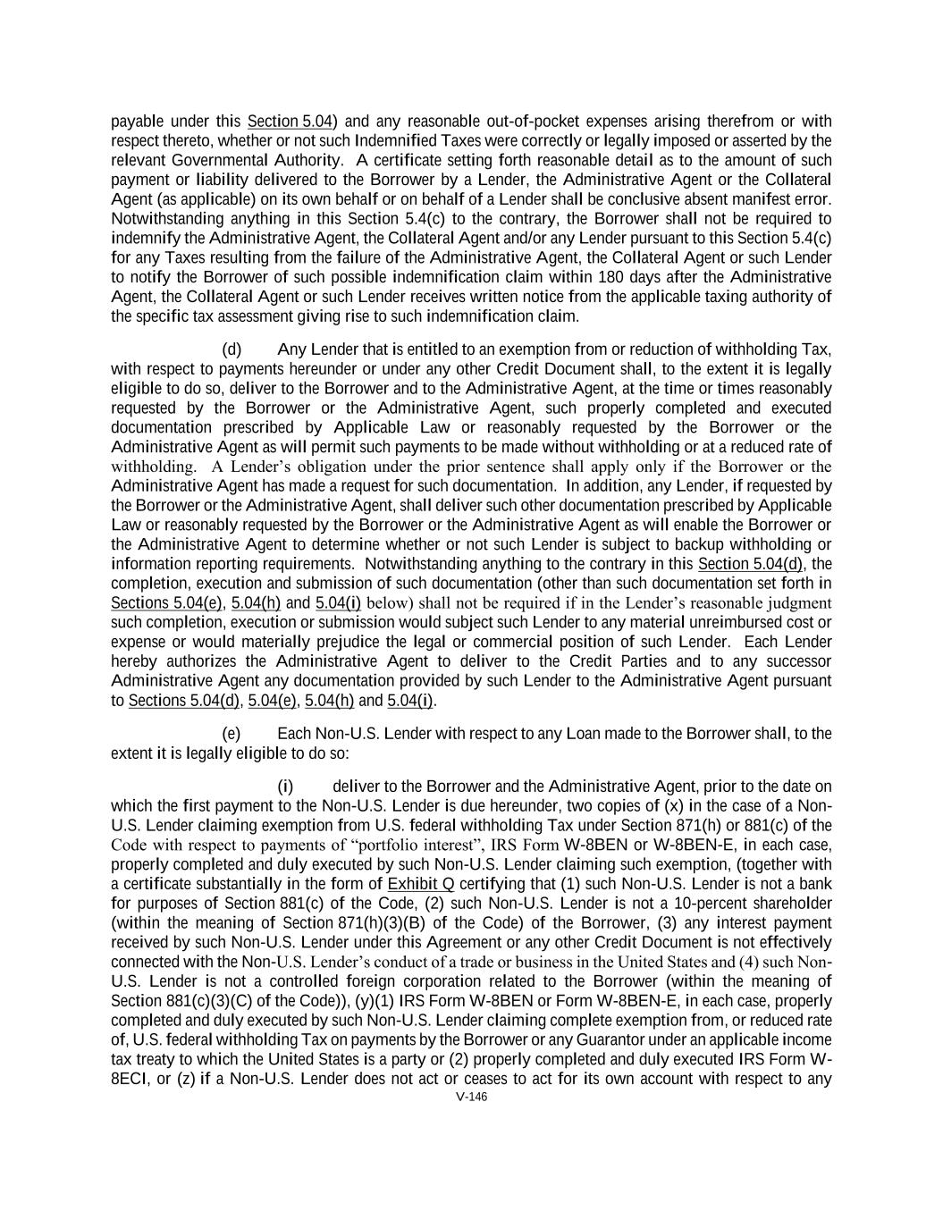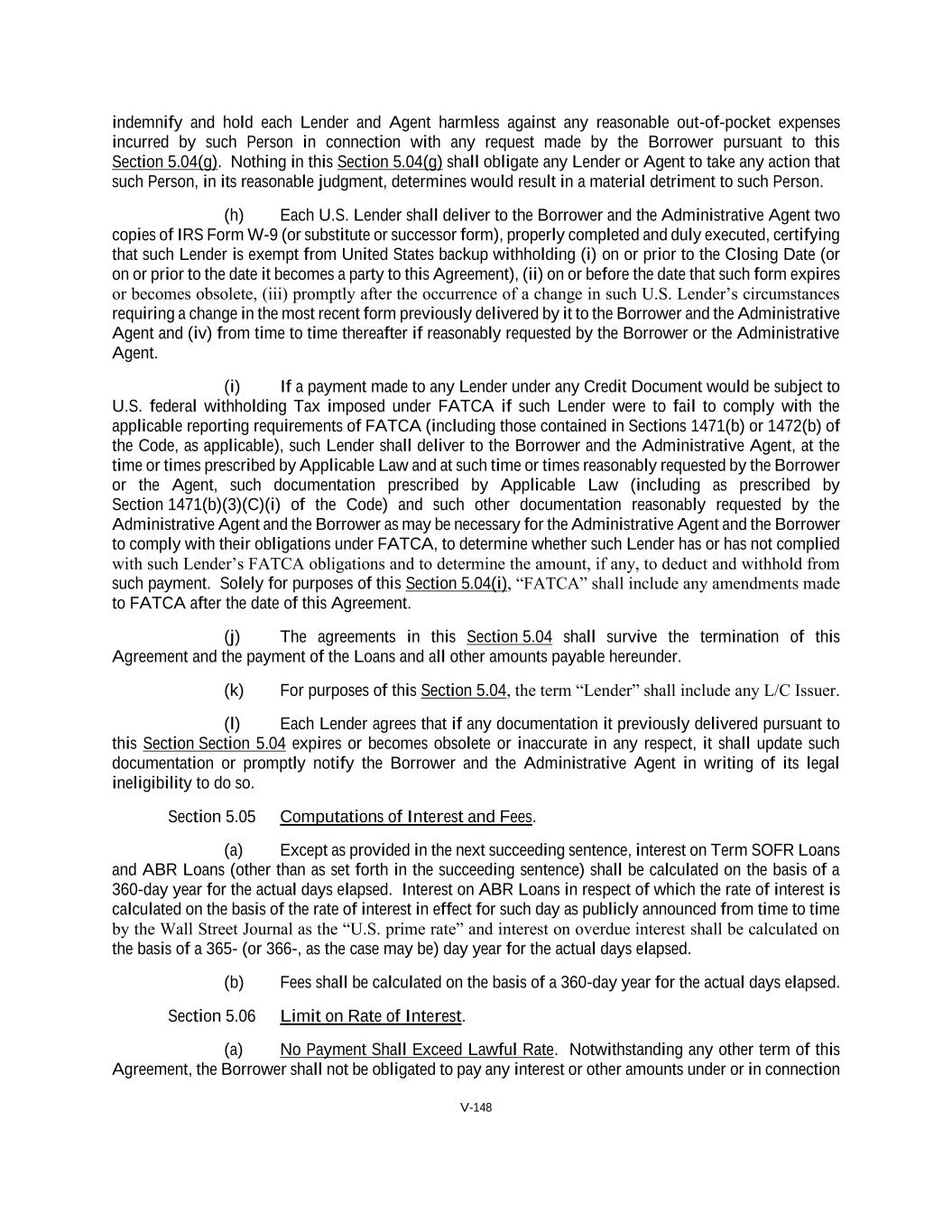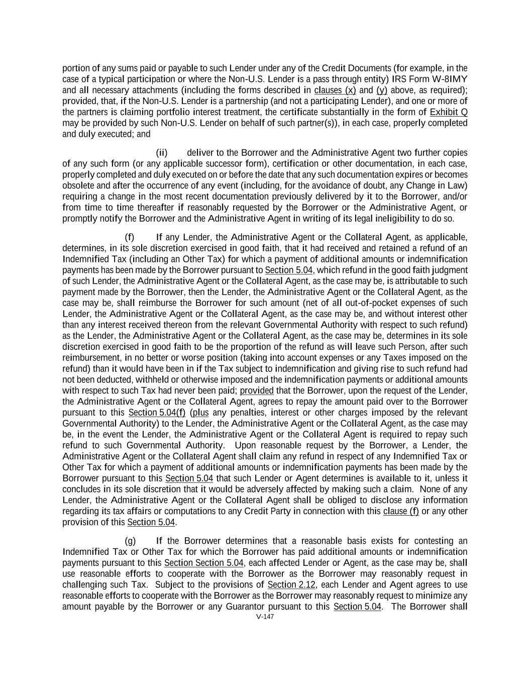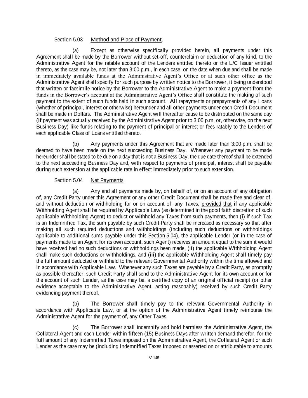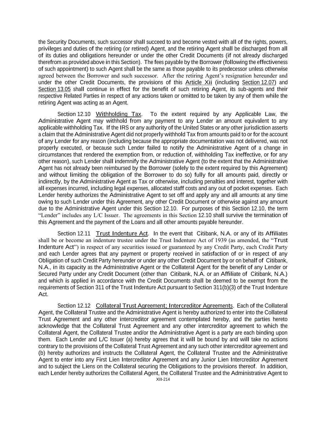 XII-214 the Security Documents, such successor shall succeed to and become vested with all of the rights, powers, privileges and duties of the retiring (or retired) Agent, and the retiring Agent shall be discharged from all of its duties and obligations hereunder or under the other Credit Documents (if not already discharged therefrom as provided above in this Section). The fees payable by the Borrower (following the effectiveness of such appointment) to such Agent shall be the same as those payable to its predecessor unless otherwise agreed between the Borrower and such successor. After the retiring Agent’s resignation hereunder and under the other Credit Documents, the provisions of this Article Xii (including Section 12.07) and Section 13.05 shall continue in effect for the benefit of such retiring Agent, its sub-agents and their respective Related Parties in respect of any actions taken or omitted to be taken by any of them while the retiring Agent was acting as an Agent. Section 12.10 Withholding Tax. To the extent required by any Applicable Law, the Administrative Agent may withhold from any payment to any Lender an amount equivalent to any applicable withholding Tax. If the IRS or any authority of the United States or any other jurisdiction asserts a claim that the Administrative Agent did not properly withhold Tax from amounts paid to or for the account of any Lender for any reason (including because the appropriate documentation was not delivered, was not properly executed, or because such Lender failed to notify the Administrative Agent of a change in circumstances that rendered the exemption from, or reduction of, withholding Tax ineffective, or for any other reason), such Lender shall indemnify the Administrative Agent (to the extent that the Administrative Agent has not already been reimbursed by the Borrower (solely to the extent required by this Agreement) and without limiting the obligation of the Borrower to do so) fully for all amounts paid, directly or indirectly, by the Administrative Agent as Tax or otherwise, including penalties and interest, together with all expenses incurred, including legal expenses, allocated staff costs and any out of pocket expenses. Each Lender hereby authorizes the Administrative Agent to set off and apply any and all amounts at any time owing to such Lender under this Agreement, any other Credit Document or otherwise against any amount due to the Administrative Agent under this Section 12.10. For purposes of this Section 12.10, the term “Lender” includes any L/C Issuer. The agreements in this Section 12.10 shall survive the termination of this Agreement and the payment of the Loans and all other amounts payable hereunder. Section 12.11 Trust Indenture Act. In the event that Citibank, N.A. or any of its Affiliates shall be or become an indenture trustee under the Trust Indenture Act of 1939 (as amended, the “Trust Indenture Act”) in respect of any securities issued or guaranteed by any Credit Party, each Credit Party and each Lender agrees that any payment or property received in satisfaction of or in respect of any Obligation of such Credit Party hereunder or under any other Credit Document by or on behalf of Citibank, N.A., in its capacity as the Administrative Agent or the Collateral Agent for the benefit of any Lender or Secured Party under any Credit Document (other than Citibank, N.A. or an Affiliate of Citibank, N.A.) and which is applied in accordance with the Credit Documents shall be deemed to be exempt from the requirements of Section 311 of the Trust Indenture Act pursuant to Section 311(b)(3) of the Trust Indenture Act. Section 12.12 Collateral Trust Agreement; Intercreditor Agreements. Each of the Collateral Agent, the Collateral Trustee and the Administrative Agent is hereby authorized to enter into the Collateral Trust Agreement and any other intercreditor agreement contemplated hereby, and the parties hereto acknowledge that the Collateral Trust Agreement and any other intercreditor agreement to which the Collateral Agent, the Collateral Trustee and/or the Administrative Agent is a party are each binding upon them. Each Lender and L/C Issuer (a) hereby agrees that it will be bound by and will take no actions contrary to the provisions of the Collateral Trust Agreement and any such other intercreditor agreement and (b) hereby authorizes and instructs the Collateral Agent, the Collateral Trustee and the Administrative Agent to enter into any First Lien Intercreditor Agreement and any Junior Lien Intercreditor Agreement and to subject the Liens on the Collateral securing the Obligations to the provisions thereof. In addition, each Lender hereby authorizes the Collateral Agent, the Collateral Trustee and the Administrative Agent to