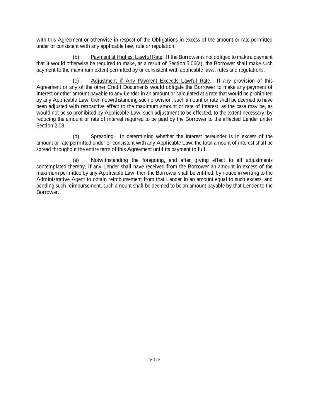 V-149 with this Agreement or otherwise in respect of the Obligations in excess of the amount or rate permitted under or consistent with any applicable law, rule or regulation. (b) Payment at Highest Lawful Rate. If the Borrower is not obliged to make a payment that it would otherwise be required to make, as a result of Section 5.06(a), the Borrower shall make such payment to the maximum extent permitted by or consistent with applicable laws, rules and regulations. (c) Adjustment if Any Payment Exceeds Lawful Rate. If any provision of this Agreement or any of the other Credit Documents would obligate the Borrower to make any payment of interest or other amount payable to any Lender in an amount or calculated at a rate that would be prohibited by any Applicable Law, then notwithstanding such provision, such amount or rate shall be deemed to have been adjusted with retroactive effect to the maximum amount or rate of interest, as the case may be, as would not be so prohibited by Applicable Law, such adjustment to be effected, to the extent necessary, by reducing the amount or rate of interest required to be paid by the Borrower to the affected Lender under Section 2.08. (d) Spreading. In determining whether the interest hereunder is in excess of the amount or rate permitted under or consistent with any Applicable Law, the total amount of interest shall be spread throughout the entire term of this Agreement until its payment in full. (e) Notwithstanding the foregoing, and after giving effect to all adjustments contemplated thereby, if any Lender shall have received from the Borrower an amount in excess of the maximum permitted by any Applicable Law, then the Borrower shall be entitled, by notice in writing to the Administrative Agent to obtain reimbursement from that Lender in an amount equal to such excess, and pending such reimbursement, such amount shall be deemed to be an amount payable by that Lender to the Borrower.