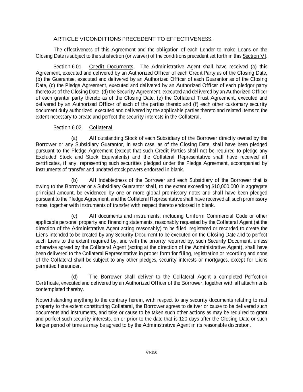 VI-150 ARTICLE VICONDITIONS PRECEDENT TO EFFECTIVENESS. The effectiveness of this Agreement and the obligation of each Lender to make Loans on the Closing Date is subject to the satisfaction (or waiver) of the conditions precedent set forth in this Section VI. Section 6.01 Credit Documents. The Administrative Agent shall have received (a) this Agreement, executed and delivered by an Authorized Officer of each Credit Party as of the Closing Date, (b) the Guarantee, executed and delivered by an Authorized Officer of each Guarantor as of the Closing Date, (c) the Pledge Agreement, executed and delivered by an Authorized Officer of each pledgor party thereto as of the Closing Date, (d) the Security Agreement, executed and delivered by an Authorized Officer of each grantor party thereto as of the Closing Date, (e) the Collateral Trust Agreement, executed and delivered by an Authorized Officer of each of the parties thereto and (f) each other customary security document duly authorized, executed and delivered by the applicable parties thereto and related items to the extent necessary to create and perfect the security interests in the Collateral. Section 6.02 Collateral. (a) All outstanding Stock of each Subsidiary of the Borrower directly owned by the Borrower or any Subsidiary Guarantor, in each case, as of the Closing Date, shall have been pledged pursuant to the Pledge Agreement (except that such Credit Parties shall not be required to pledge any Excluded Stock and Stock Equivalents) and the Collateral Representative shall have received all certificates, if any, representing such securities pledged under the Pledge Agreement, accompanied by instruments of transfer and undated stock powers endorsed in blank. (b) All Indebtedness of the Borrower and each Subsidiary of the Borrower that is owing to the Borrower or a Subsidiary Guarantor shall, to the extent exceeding $10,000,000 in aggregate principal amount, be evidenced by one or more global promissory notes and shall have been pledged pursuant to the Pledge Agreement, and the Collateral Representative shall have received all such promissory notes, together with instruments of transfer with respect thereto endorsed in blank. (c) All documents and instruments, including Uniform Commercial Code or other applicable personal property and financing statements, reasonably requested by the Collateral Agent (at the direction of the Administrative Agent acting reasonably) to be filed, registered or recorded to create the Liens intended to be created by any Security Document to be executed on the Closing Date and to perfect such Liens to the extent required by, and with the priority required by, such Security Document, unless otherwise agreed by the Collateral Agent (acting at the direction of the Administrative Agent), shall have been delivered to the Collateral Representative in proper form for filing, registration or recording and none of the Collateral shall be subject to any other pledges, security interests or mortgages, except for Liens permitted hereunder. (d) The Borrower shall deliver to the Collateral Agent a completed Perfection Certificate, executed and delivered by an Authorized Officer of the Borrower, together with all attachments contemplated thereby. Notwithstanding anything to the contrary herein, with respect to any security documents relating to real property to the extent constituting Collateral, the Borrower agrees to deliver or cause to be delivered such documents and instruments, and take or cause to be taken such other actions as may be required to grant and perfect such security interests, on or prior to the date that is 120 days after the Closing Date or such longer period of time as may be agreed to by the Administrative Agent in its reasonable discretion.