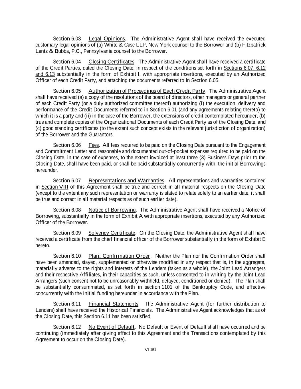 VI-151 Section 6.03 Legal Opinions. The Administrative Agent shall have received the executed customary legal opinions of (a) White & Case LLP, New York counsel to the Borrower and (b) Fitzpatrick Lentz & Bubba, P.C., Pennsylvania counsel to the Borrower. Section 6.04 Closing Certificates. The Administrative Agent shall have received a certificate of the Credit Parties, dated the Closing Date, in respect of the conditions set forth in Sections 6.07, 6.12 and 6.13 substantially in the form of Exhibit I, with appropriate insertions, executed by an Authorized Officer of each Credit Party, and attaching the documents referred to in Section 6.05. Section 6.05 Authorization of Proceedings of Each Credit Party. The Administrative Agent shall have received (a) a copy of the resolutions of the board of directors, other managers or general partner of each Credit Party (or a duly authorized committee thereof) authorizing (i) the execution, delivery and performance of the Credit Documents referred to in Section 6.01 (and any agreements relating thereto) to which it is a party and (ii) in the case of the Borrower, the extensions of credit contemplated hereunder, (b) true and complete copies of the Organizational Documents of each Credit Party as of the Closing Date, and (c) good standing certificates (to the extent such concept exists in the relevant jurisdiction of organization) of the Borrower and the Guarantors. Section 6.06 Fees. All fees required to be paid on the Closing Date pursuant to the Engagement and Commitment Letter and reasonable and documented out-of-pocket expenses required to be paid on the Closing Date, in the case of expenses, to the extent invoiced at least three (3) Business Days prior to the Closing Date, shall have been paid, or shall be paid substantially concurrently with, the initial Borrowings hereunder. Section 6.07 Representations and Warranties. All representations and warranties contained in Section VIII of this Agreement shall be true and correct in all material respects on the Closing Date (except to the extent any such representation or warranty is stated to relate solely to an earlier date, it shall be true and correct in all material respects as of such earlier date). Section 6.08 Notice of Borrowing. The Administrative Agent shall have received a Notice of Borrowing, substantially in the form of Exhibit A with appropriate insertions, executed by any Authorized Officer of the Borrower. Section 6.09 Solvency Certificate. On the Closing Date, the Administrative Agent shall have received a certificate from the chief financial officer of the Borrower substantially in the form of Exhibit E hereto. Section 6.10 Plan; Confirmation Order. Neither the Plan nor the Confirmation Order shall have been amended, stayed, supplemented or otherwise modified in any respect that is, in the aggregate, materially adverse to the rights and interests of the Lenders (taken as a whole), the Joint Lead Arrangers and their respective Affiliates, in their capacities as such, unless consented to in writing by the Joint Lead Arrangers (such consent not to be unreasonably withheld, delayed, conditioned or denied). The Plan shall be substantially consummated, as set forth in section 1101 of the Bankruptcy Code, and effective concurrently with the initial funding hereunder in accordance with the Plan. Section 6.11 Financial Statements. The Administrative Agent (for further distribution to Lenders) shall have received the Historical Financials. The Administrative Agent acknowledges that as of the Closing Date, this Section 6.11 has been satisfied. Section 6.12 No Event of Default. No Default or Event of Default shall have occurred and be continuing (immediately after giving effect to this Agreement and the Transactions contemplated by this Agreement to occur on the Closing Date).