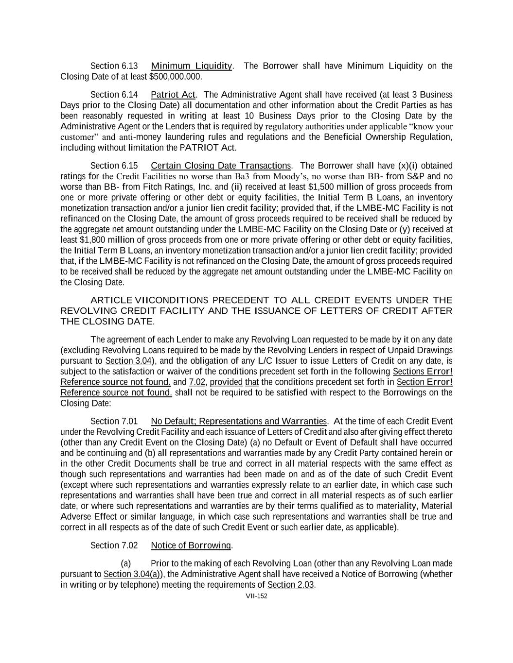 VII-152 Section 6.13 Minimum Liquidity. The Borrower shall have Minimum Liquidity on the Closing Date of at least $500,000,000. Section 6.14 Patriot Act. The Administrative Agent shall have received (at least 3 Business Days prior to the Closing Date) all documentation and other information about the Credit Parties as has been reasonably requested in writing at least 10 Business Days prior to the Closing Date by the Administrative Agent or the Lenders that is required by regulatory authorities under applicable “know your customer” and anti-money laundering rules and regulations and the Beneficial Ownership Regulation, including without limitation the PATRIOT Act. Section 6.15 Certain Closing Date Transactions. The Borrower shall have (x)(i) obtained ratings for the Credit Facilities no worse than Ba3 from Moody’s, no worse than BB- from S&P and no worse than BB- from Fitch Ratings, Inc. and (ii) received at least $1,500 million of gross proceeds from one or more private offering or other debt or equity facilities, the Initial Term B Loans, an inventory monetization transaction and/or a junior lien credit facility; provided that, if the LMBE-MC Facility is not refinanced on the Closing Date, the amount of gross proceeds required to be received shall be reduced by the aggregate net amount outstanding under the LMBE-MC Facility on the Closing Date or (y) received at least $1,800 million of gross proceeds from one or more private offering or other debt or equity facilities, the Initial Term B Loans, an inventory monetization transaction and/or a junior lien credit facility; provided that, if the LMBE-MC Facility is not refinanced on the Closing Date, the amount of gross proceeds required to be received shall be reduced by the aggregate net amount outstanding under the LMBE-MC Facility on the Closing Date. ARTICLE VIICONDITIONS PRECEDENT TO ALL CREDIT EVENTS UNDER THE REVOLVING CREDIT FACILITY AND THE ISSUANCE OF LETTERS OF CREDIT AFTER THE CLOSING DATE. The agreement of each Lender to make any Revolving Loan requested to be made by it on any date (excluding Revolving Loans required to be made by the Revolving Lenders in respect of Unpaid Drawings pursuant to Section 3.04), and the obligation of any L/C Issuer to issue Letters of Credit on any date, is subject to the satisfaction or waiver of the conditions precedent set forth in the following Sections Error! Reference source not found. and 7.02, provided that the conditions precedent set forth in Section Error! Reference source not found. shall not be required to be satisfied with respect to the Borrowings on the Closing Date: Section 7.01 No Default; Representations and Warranties. At the time of each Credit Event under the Revolving Credit Facility and each issuance of Letters of Credit and also after giving effect thereto (other than any Credit Event on the Closing Date) (a) no Default or Event of Default shall have occurred and be continuing and (b) all representations and warranties made by any Credit Party contained herein or in the other Credit Documents shall be true and correct in all material respects with the same effect as though such representations and warranties had been made on and as of the date of such Credit Event (except where such representations and warranties expressly relate to an earlier date, in which case such representations and warranties shall have been true and correct in all material respects as of such earlier date, or where such representations and warranties are by their terms qualified as to materiality, Material Adverse Effect or similar language, in which case such representations and warranties shall be true and correct in all respects as of the date of such Credit Event or such earlier date, as applicable). Section 7.02 Notice of Borrowing. (a) Prior to the making of each Revolving Loan (other than any Revolving Loan made pursuant to Section 3.04(a)), the Administrative Agent shall have received a Notice of Borrowing (whether in writing or by telephone) meeting the requirements of Section 2.03.