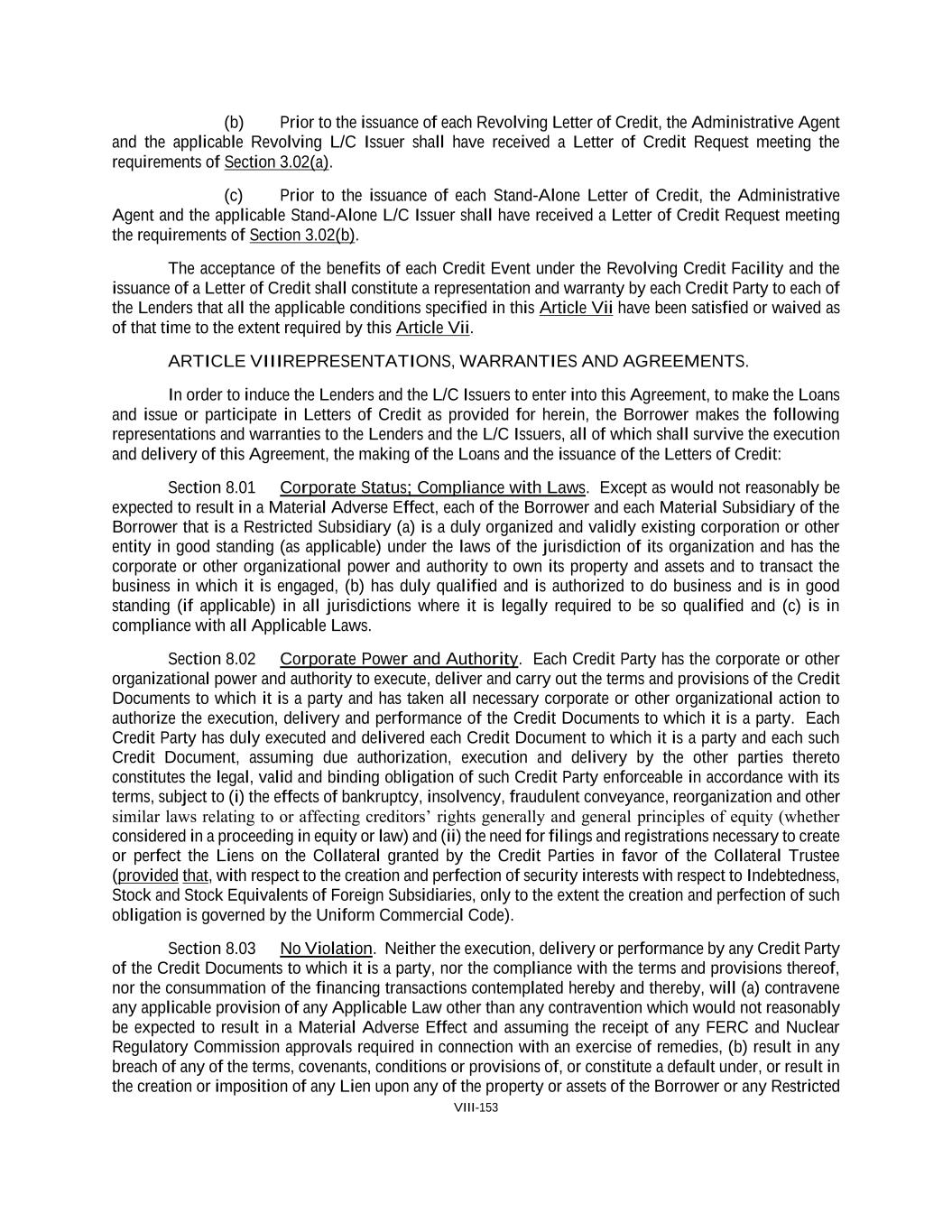 VIII-153 (b) Prior to the issuance of each Revolving Letter of Credit, the Administrative Agent and the applicable Revolving L/C Issuer shall have received a Letter of Credit Request meeting the requirements of Section 3.02(a). (c) Prior to the issuance of each Stand-Alone Letter of Credit, the Administrative Agent and the applicable Stand-Alone L/C Issuer shall have received a Letter of Credit Request meeting the requirements of Section 3.02(b). The acceptance of the benefits of each Credit Event under the Revolving Credit Facility and the issuance of a Letter of Credit shall constitute a representation and warranty by each Credit Party to each of the Lenders that all the applicable conditions specified in this Article Vii have been satisfied or waived as of that time to the extent required by this Article Vii. ARTICLE VIIIREPRESENTATIONS, WARRANTIES AND AGREEMENTS. In order to induce the Lenders and the L/C Issuers to enter into this Agreement, to make the Loans and issue or participate in Letters of Credit as provided for herein, the Borrower makes the following representations and warranties to the Lenders and the L/C Issuers, all of which shall survive the execution and delivery of this Agreement, the making of the Loans and the issuance of the Letters of Credit: Section 8.01 Corporate Status; Compliance with Laws. Except as would not reasonably be expected to result in a Material Adverse Effect, each of the Borrower and each Material Subsidiary of the Borrower that is a Restricted Subsidiary (a) is a duly organized and validly existing corporation or other entity in good standing (as applicable) under the laws of the jurisdiction of its organization and has the corporate or other organizational power and authority to own its property and assets and to transact the business in which it is engaged, (b) has duly qualified and is authorized to do business and is in good standing (if applicable) in all jurisdictions where it is legally required to be so qualified and (c) is in compliance with all Applicable Laws. Section 8.02 Corporate Power and Authority. Each Credit Party has the corporate or other organizational power and authority to execute, deliver and carry out the terms and provisions of the Credit Documents to which it is a party and has taken all necessary corporate or other organizational action to authorize the execution, delivery and performance of the Credit Documents to which it is a party. Each Credit Party has duly executed and delivered each Credit Document to which it is a party and each such Credit Document, assuming due authorization, execution and delivery by the other parties thereto constitutes the legal, valid and binding obligation of such Credit Party enforceable in accordance with its terms, subject to (i) the effects of bankruptcy, insolvency, fraudulent conveyance, reorganization and other similar laws relating to or affecting creditors’ rights generally and general principles of equity (whether considered in a proceeding in equity or law) and (ii) the need for filings and registrations necessary to create or perfect the Liens on the Collateral granted by the Credit Parties in favor of the Collateral Trustee (provided that, with respect to the creation and perfection of security interests with respect to Indebtedness, Stock and Stock Equivalents of Foreign Subsidiaries, only to the extent the creation and perfection of such obligation is governed by the Uniform Commercial Code). Section 8.03 No Violation. Neither the execution, delivery or performance by any Credit Party of the Credit Documents to which it is a party, nor the compliance with the terms and provisions thereof, nor the consummation of the financing transactions contemplated hereby and thereby, will (a) contravene any applicable provision of any Applicable Law other than any contravention which would not reasonably be expected to result in a Material Adverse Effect and assuming the receipt of any FERC and Nuclear Regulatory Commission approvals required in connection with an exercise of remedies, (b) result in any breach of any of the terms, covenants, conditions or provisions of, or constitute a default under, or result in the creation or imposition of any Lien upon any of the property or assets of the Borrower or any Restricted