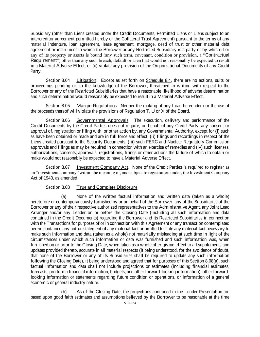 VIII-154 Subsidiary (other than Liens created under the Credit Documents, Permitted Liens or Liens subject to an intercreditor agreement permitted hereby or the Collateral Trust Agreement) pursuant to the terms of any material indenture, loan agreement, lease agreement, mortgage, deed of trust or other material debt agreement or instrument to which the Borrower or any Restricted Subsidiary is a party or by which it or any of its property or assets is bound (any such term, covenant, condition or provision, a “Contractual Requirement”) other than any such breach, default or Lien that would not reasonably be expected to result in a Material Adverse Effect, or (c) violate any provision of the Organizational Documents of any Credit Party. Section 8.04 Litigation. Except as set forth on Schedule 8.4, there are no actions, suits or proceedings pending or, to the knowledge of the Borrower, threatened in writing with respect to the Borrower or any of the Restricted Subsidiaries that have a reasonable likelihood of adverse determination and such determination would reasonably be expected to result in a Material Adverse Effect. Section 8.05 Margin Regulations. Neither the making of any Loan hereunder nor the use of the proceeds thereof will violate the provisions of Regulation T, U or X of the Board. Section 8.06 Governmental Approvals. The execution, delivery and performance of the Credit Documents by the Credit Parties does not require, on behalf of any Credit Party, any consent or approval of, registration or filing with, or other action by, any Governmental Authority, except for (i) such as have been obtained or made and are in full force and effect, (ii) filings and recordings in respect of the Liens created pursuant to the Security Documents, (iii) such FERC and Nuclear Regulatory Commission approvals and filings as may be required in connection with an exercise of remedies and (iv) such licenses, authorizations, consents, approvals, registrations, filings or other actions the failure of which to obtain or make would not reasonably be expected to have a Material Adverse Effect. Section 8.07 Investment Company Act. None of the Credit Parties is required to register as an “investment company” within the meaning of, and subject to registration under, the Investment Company Act of 1940, as amended. Section 8.08 True and Complete Disclosure. (a) None of the written factual information and written data (taken as a whole) heretofore or contemporaneously furnished by or on behalf of the Borrower, any of the Subsidiaries of the Borrower or any of their respective authorized representatives to the Administrative Agent, any Joint Lead Arranger and/or any Lender on or before the Closing Date (including all such information and data contained in the Credit Documents) regarding the Borrower and its Restricted Subsidiaries in connection with the Transactions for purposes of or in connection with this Agreement or any transaction contemplated herein contained any untrue statement of any material fact or omitted to state any material fact necessary to make such information and data (taken as a whole) not materially misleading at such time in light of the circumstances under which such information or data was furnished and such information was, when furnished on or prior to the Closing Date, when taken as a whole after giving effect to all supplements and updates provided thereto, accurate in all material respects (it being understood, for the avoidance of doubt, that none of the Borrower or any of its Subsidiaries shall be required to update any such information following the Closing Date), it being understood and agreed that for purposes of this Section 8.08(a), such factual information and data shall not include projections or estimates (including financial estimates, forecasts, pro forma financial information, budgets, and other forward-looking information), other forward- looking information or statements regarding future condition or operations, or information of a general economic or general industry nature. (b) As of the Closing Date, the projections contained in the Lender Presentation are based upon good faith estimates and assumptions believed by the Borrower to be reasonable at the time