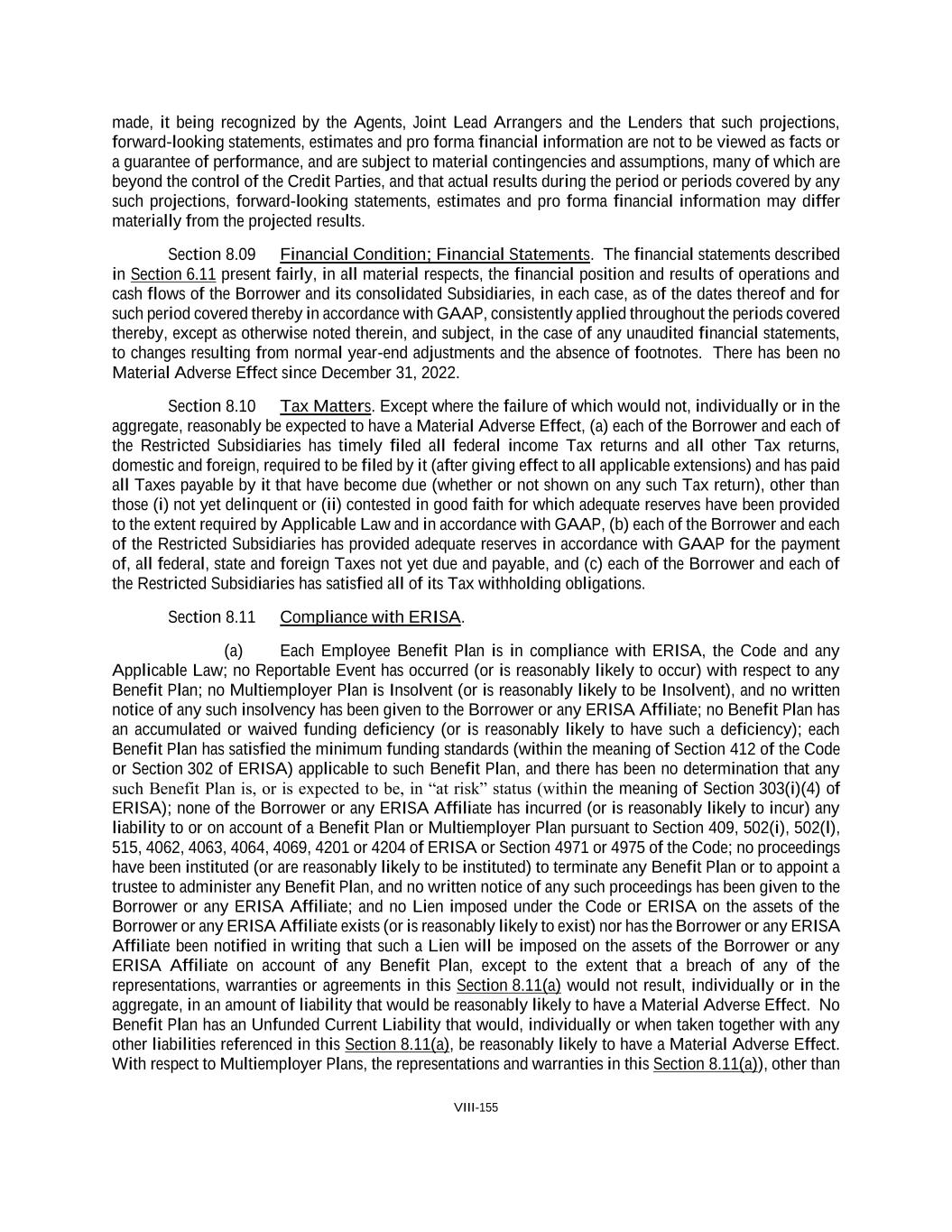 VIII-155 made, it being recognized by the Agents, Joint Lead Arrangers and the Lenders that such projections, forward-looking statements, estimates and pro forma financial information are not to be viewed as facts or a guarantee of performance, and are subject to material contingencies and assumptions, many of which are beyond the control of the Credit Parties, and that actual results during the period or periods covered by any such projections, forward-looking statements, estimates and pro forma financial information may differ materially from the projected results. Section 8.09 Financial Condition; Financial Statements. The financial statements described in Section 6.11 present fairly, in all material respects, the financial position and results of operations and cash flows of the Borrower and its consolidated Subsidiaries, in each case, as of the dates thereof and for such period covered thereby in accordance with GAAP, consistently applied throughout the periods covered thereby, except as otherwise noted therein, and subject, in the case of any unaudited financial statements, to changes resulting from normal year-end adjustments and the absence of footnotes. There has been no Material Adverse Effect since December 31, 2022. Section 8.10 Tax Matters. Except where the failure of which would not, individually or in the aggregate, reasonably be expected to have a Material Adverse Effect, (a) each of the Borrower and each of the Restricted Subsidiaries has timely filed all federal income Tax returns and all other Tax returns, domestic and foreign, required to be filed by it (after giving effect to all applicable extensions) and has paid all Taxes payable by it that have become due (whether or not shown on any such Tax return), other than those (i) not yet delinquent or (ii) contested in good faith for which adequate reserves have been provided to the extent required by Applicable Law and in accordance with GAAP, (b) each of the Borrower and each of the Restricted Subsidiaries has provided adequate reserves in accordance with GAAP for the payment of, all federal, state and foreign Taxes not yet due and payable, and (c) each of the Borrower and each of the Restricted Subsidiaries has satisfied all of its Tax withholding obligations. Section 8.11 Compliance with ERISA. (a) Each Employee Benefit Plan is in compliance with ERISA, the Code and any Applicable Law; no Reportable Event has occurred (or is reasonably likely to occur) with respect to any Benefit Plan; no Multiemployer Plan is Insolvent (or is reasonably likely to be Insolvent), and no written notice of any such insolvency has been given to the Borrower or any ERISA Affiliate; no Benefit Plan has an accumulated or waived funding deficiency (or is reasonably likely to have such a deficiency); each Benefit Plan has satisfied the minimum funding standards (within the meaning of Section 412 of the Code or Section 302 of ERISA) applicable to such Benefit Plan, and there has been no determination that any such Benefit Plan is, or is expected to be, in “at risk” status (within the meaning of Section 303(i)(4) of ERISA); none of the Borrower or any ERISA Affiliate has incurred (or is reasonably likely to incur) any liability to or on account of a Benefit Plan or Multiemployer Plan pursuant to Section 409, 502(i), 502(l), 515, 4062, 4063, 4064, 4069, 4201 or 4204 of ERISA or Section 4971 or 4975 of the Code; no proceedings have been instituted (or are reasonably likely to be instituted) to terminate any Benefit Plan or to appoint a trustee to administer any Benefit Plan, and no written notice of any such proceedings has been given to the Borrower or any ERISA Affiliate; and no Lien imposed under the Code or ERISA on the assets of the Borrower or any ERISA Affiliate exists (or is reasonably likely to exist) nor has the Borrower or any ERISA Affiliate been notified in writing that such a Lien will be imposed on the assets of the Borrower or any ERISA Affiliate on account of any Benefit Plan, except to the extent that a breach of any of the representations, warranties or agreements in this Section 8.11(a) would not result, individually or in the aggregate, in an amount of liability that would be reasonably likely to have a Material Adverse Effect. No Benefit Plan has an Unfunded Current Liability that would, individually or when taken together with any other liabilities referenced in this Section 8.11(a), be reasonably likely to have a Material Adverse Effect. With respect to Multiemployer Plans, the representations and warranties in this Section 8.11(a)), other than