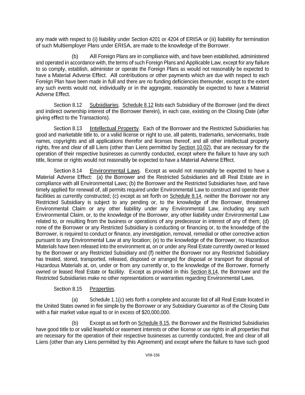 VIII-156 any made with respect to (i) liability under Section 4201 or 4204 of ERISA or (ii) liability for termination of such Multiemployer Plans under ERISA, are made to the knowledge of the Borrower. (b) All Foreign Plans are in compliance with, and have been established, administered and operated in accordance with, the terms of such Foreign Plans and Applicable Law, except for any failure to so comply, establish, administer or operate the Foreign Plans as would not reasonably be expected to have a Material Adverse Effect. All contributions or other payments which are due with respect to each Foreign Plan have been made in full and there are no funding deficiencies thereunder, except to the extent any such events would not, individually or in the aggregate, reasonably be expected to have a Material Adverse Effect. Section 8.12 Subsidiaries. Schedule 8.12 lists each Subsidiary of the Borrower (and the direct and indirect ownership interest of the Borrower therein), in each case, existing on the Closing Date (after giving effect to the Transactions). Section 8.13 Intellectual Property. Each of the Borrower and the Restricted Subsidiaries has good and marketable title to, or a valid license or right to use, all patents, trademarks, servicemarks, trade names, copyrights and all applications therefor and licenses thereof, and all other intellectual property rights, free and clear of all Liens (other than Liens permitted by Section 10.02), that are necessary for the operation of their respective businesses as currently conducted, except where the failure to have any such title, license or rights would not reasonably be expected to have a Material Adverse Effect. Section 8.14 Environmental Laws. Except as would not reasonably be expected to have a Material Adverse Effect: (a) the Borrower and the Restricted Subsidiaries and all Real Estate are in compliance with all Environmental Laws; (b) the Borrower and the Restricted Subsidiaries have, and have timely applied for renewal of, all permits required under Environmental Law to construct and operate their facilities as currently constructed; (c) except as set forth on Schedule 8.14, neither the Borrower nor any Restricted Subsidiary is subject to any pending or, to the knowledge of the Borrower, threatened Environmental Claim or any other liability under any Environmental Law, including any such Environmental Claim, or, to the knowledge of the Borrower, any other liability under Environmental Law related to, or resulting from the business or operations of any predecessor in interest of any of them; (d) none of the Borrower or any Restricted Subsidiary is conducting or financing or, to the knowledge of the Borrower, is required to conduct or finance, any investigation, removal, remedial or other corrective action pursuant to any Environmental Law at any location; (e) to the knowledge of the Borrower, no Hazardous Materials have been released into the environment at, on or under any Real Estate currently owned or leased by the Borrower or any Restricted Subsidiary and (f) neither the Borrower nor any Restricted Subsidiary has treated, stored, transported, released, disposed or arranged for disposal or transport for disposal of Hazardous Materials at, on, under or from any currently or, to the knowledge of the Borrower, formerly owned or leased Real Estate or facility. Except as provided in this Section 8.14, the Borrower and the Restricted Subsidiaries make no other representations or warranties regarding Environmental Laws. Section 8.15 Properties. (a) Schedule 1.1(c) sets forth a complete and accurate list of all Real Estate located in the United States owned in fee simple by the Borrower or any Subsidiary Guarantor as of the Closing Date with a fair market value equal to or in excess of $20,000,000. (b) Except as set forth on Schedule 8.15, the Borrower and the Restricted Subsidiaries have good title to or valid leasehold or easement interests or other license or use rights in all properties that are necessary for the operation of their respective businesses as currently conducted, free and clear of all Liens (other than any Liens permitted by this Agreement) and except where the failure to have such good