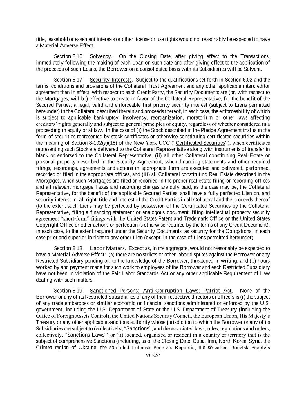 VIII-157 title, leasehold or easement interests or other license or use rights would not reasonably be expected to have a Material Adverse Effect. Section 8.16 Solvency. On the Closing Date, after giving effect to the Transactions, immediately following the making of each Loan on such date and after giving effect to the application of the proceeds of such Loans, the Borrower on a consolidated basis with its Subsidiaries will be Solvent. Section 8.17 Security Interests. Subject to the qualifications set forth in Section 6.02 and the terms, conditions and provisions of the Collateral Trust Agreement and any other applicable intercreditor agreement then in effect, with respect to each Credit Party, the Security Documents are (or, with respect to the Mortgages, will be) effective to create in favor of the Collateral Representative, for the benefit of the Secured Parties, a legal, valid and enforceable first priority security interest (subject to Liens permitted hereunder) in the Collateral described therein and proceeds thereof, in each case, the enforceability of which is subject to applicable bankruptcy, insolvency, reorganization, moratorium or other laws affecting creditors’ rights generally and subject to general principles of equity, regardless of whether considered in a proceeding in equity or at law. In the case of (i) the Stock described in the Pledge Agreement that is in the form of securities represented by stock certificates or otherwise constituting certificated securities within the meaning of Section 8-102(a)(15) of the New York UCC (“Certificated Securities”), when certificates representing such Stock are delivered to the Collateral Representative along with instruments of transfer in blank or endorsed to the Collateral Representative, (ii) all other Collateral constituting Real Estate or personal property described in the Security Agreement, when financing statements and other required filings, recordings, agreements and actions in appropriate form are executed and delivered, performed, recorded or filed in the appropriate offices, and (iii) all Collateral constituting Real Estate described in the Mortgages, when such Mortgages are filed or recorded in the proper real estate filing or recording offices and all relevant mortgage Taxes and recording charges are duly paid, as the case may be, the Collateral Representative, for the benefit of the applicable Secured Parties, shall have a fully perfected Lien on, and security interest in, all right, title and interest of the Credit Parties in all Collateral and the proceeds thereof (to the extent such Liens may be perfected by possession of the Certificated Securities by the Collateral Representative, filing a financing statement or analogous document, filing intellectual property security agreement “short-form” filings with the United States Patent and Trademark Office or the United States Copyright Office or other actions or perfection is otherwise required by the terms of any Credit Document), in each case, to the extent required under the Security Documents, as security for the Obligations, in each case prior and superior in right to any other Lien (except, in the case of Liens permitted hereunder). Section 8.18 Labor Matters. Except as, in the aggregate, would not reasonably be expected to have a Material Adverse Effect: (a) there are no strikes or other labor disputes against the Borrower or any Restricted Subsidiary pending or, to the knowledge of the Borrower, threatened in writing; and (b) hours worked by and payment made for such work to employees of the Borrower and each Restricted Subsidiary have not been in violation of the Fair Labor Standards Act or any other applicable Requirement of Law dealing with such matters. Section 8.19 Sanctioned Persons; Anti-Corruption Laws; Patriot Act. None of the Borrower or any of its Restricted Subsidiaries or any of their respective directors or officers is (i) the subject of any trade embargoes or similar economic or financial sanctions administered or enforced by the U.S. government, including the U.S. Department of State or the U.S. Department of Treasury (including the Office of Foreign Assets Control), the United Nations Security Council, the European Union, His Majesty’s Treasury or any other applicable sanctions authority whose jurisdiction to which the Borrower or any of its Subsidiaries are subject to (collectively, “Sanctions”, and the associated laws, rules, regulations and orders, collectively, “Sanctions Laws”) or (ii) located, organized or resident in a country or territory that is the subject of comprehensive Sanctions (including, as of the Closing Date, Cuba, Iran, North Korea, Syria, the Crimea region of Ukraine, the so-called Luhansk People’s Republic, the so-called Donetsk People’s
