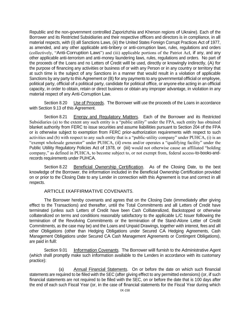 IX-158 Republic and the non-government controlled Zaporizhzhia and Kherson regions of Ukraine). Each of the Borrower and its Restricted Subsidiaries and their respective officers and directors is in compliance, in all material respects, with (i) all Sanctions Laws, (ii) the United States Foreign Corrupt Practices Act of 1977, as amended, and any other applicable anti-bribery or anti-corruption laws, rules, regulations and orders (collectively, “Anti-Corruption Laws”) and (iii) applicable portions of the Patriot Act, if any, and any other applicable anti-terrorism and anti-money laundering laws, rules, regulations and orders. No part of the proceeds of the Loans and no Letters of Credit will be used, directly or knowingly indirectly, (A) for the purpose of financing any activities or business of or with any Person or in any country or territory that at such time is the subject of any Sanctions in a manner that would result in a violation of applicable Sanctions by any party to this Agreement or (B) for any payments to any governmental official or employee, political party, official of a political party, candidate for political office, or anyone else acting in an official capacity, in order to obtain, retain or direct business or obtain any improper advantage, in violation in any material respect of any Anti-Corruption Law. Section 8.20 Use of Proceeds. The Borrower will use the proceeds of the Loans in accordance with Section 9.13 of this Agreement. Section 8.21 Energy and Regulatory Matters. Each of the Borrower and its Restricted Subsidiaries (a) to the extent any such entity is a “public utility” under the FPA, such entity has obtained blanket authority from FERC to issue securities and assume liabilities pursuant to Section 204 of the FPA or is otherwise subject to exemption from FERC prior-authorization requirements with respect to such activities and (b) with respect to any such entity that is a “public-utility company” under PUHCA, (i) is an “exempt wholesale generator” under PUHCA, (ii) owns and/or operates a “qualifying facility” under the Public Utility Regulatory Policies Act of 1978, or (iii) would not otherwise cause an affiliated “holding company,” as defined in PUHCA, to become subject to, or not exempt from, federal access-to-books-and- records requirements under PUHCA. Section 8.22 Beneficial Ownership Certification. As of the Closing Date, to the best knowledge of the Borrower, the information included in the Beneficial Ownership Certification provided on or prior to the Closing Date to any Lender in connection with this Agreement is true and correct in all respects. ARTICLE IXAFFIRMATIVE COVENANTS. The Borrower hereby covenants and agrees that on the Closing Date (immediately after giving effect to the Transactions) and thereafter, until the Total Commitments and all Letters of Credit have terminated (unless such Letters of Credit have been Cash Collateralized, Backstopped or otherwise collateralized on terms and conditions reasonably satisfactory to the applicable L/C Issuer following the termination of the Revolving Commitments or the termination of the Stand-Alone Letter of Credit Commitments, as the case may be) and the Loans and Unpaid Drawings, together with interest, fees and all other Obligations (other than Hedging Obligations under Secured CA Hedging Agreements, Cash Management Obligations under Secured CA Cash Management Agreements or Contingent Obligations), are paid in full: Section 9.01 Information Covenants. The Borrower will furnish to the Administrative Agent (which shall promptly make such information available to the Lenders in accordance with its customary practice): (a) Annual Financial Statements. On or before the date on which such financial statements are required to be filed with the SEC (after giving effect to any permitted extensions) (or, if such financial statements are not required to be filed with the SEC, on or before the date that is 100 days after the end of each such Fiscal Year (or, in the case of financial statements for the Fiscal Year during which