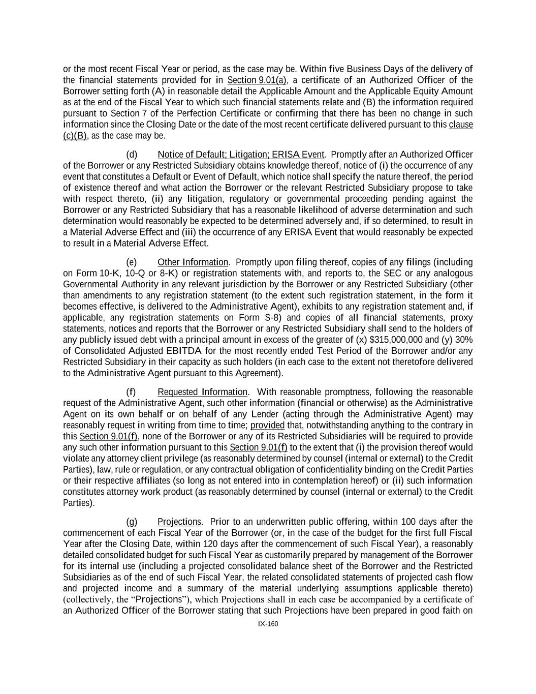 IX-160 or the most recent Fiscal Year or period, as the case may be. Within five Business Days of the delivery of the financial statements provided for in Section 9.01(a), a certificate of an Authorized Officer of the Borrower setting forth (A) in reasonable detail the Applicable Amount and the Applicable Equity Amount as at the end of the Fiscal Year to which such financial statements relate and (B) the information required pursuant to Section 7 of the Perfection Certificate or confirming that there has been no change in such information since the Closing Date or the date of the most recent certificate delivered pursuant to this clause (c)(B), as the case may be. (d) Notice of Default; Litigation; ERISA Event. Promptly after an Authorized Officer of the Borrower or any Restricted Subsidiary obtains knowledge thereof, notice of (i) the occurrence of any event that constitutes a Default or Event of Default, which notice shall specify the nature thereof, the period of existence thereof and what action the Borrower or the relevant Restricted Subsidiary propose to take with respect thereto, (ii) any litigation, regulatory or governmental proceeding pending against the Borrower or any Restricted Subsidiary that has a reasonable likelihood of adverse determination and such determination would reasonably be expected to be determined adversely and, if so determined, to result in a Material Adverse Effect and (iii) the occurrence of any ERISA Event that would reasonably be expected to result in a Material Adverse Effect. (e) Other Information. Promptly upon filing thereof, copies of any filings (including on Form 10-K, 10-Q or 8-K) or registration statements with, and reports to, the SEC or any analogous Governmental Authority in any relevant jurisdiction by the Borrower or any Restricted Subsidiary (other than amendments to any registration statement (to the extent such registration statement, in the form it becomes effective, is delivered to the Administrative Agent), exhibits to any registration statement and, if applicable, any registration statements on Form S-8) and copies of all financial statements, proxy statements, notices and reports that the Borrower or any Restricted Subsidiary shall send to the holders of any publicly issued debt with a principal amount in excess of the greater of (x) $315,000,000 and (y) 30% of Consolidated Adjusted EBITDA for the most recently ended Test Period of the Borrower and/or any Restricted Subsidiary in their capacity as such holders (in each case to the extent not theretofore delivered to the Administrative Agent pursuant to this Agreement). (f) Requested Information. With reasonable promptness, following the reasonable request of the Administrative Agent, such other information (financial or otherwise) as the Administrative Agent on its own behalf or on behalf of any Lender (acting through the Administrative Agent) may reasonably request in writing from time to time; provided that, notwithstanding anything to the contrary in this Section 9.01(f), none of the Borrower or any of its Restricted Subsidiaries will be required to provide any such other information pursuant to this Section 9.01(f) to the extent that (i) the provision thereof would violate any attorney client privilege (as reasonably determined by counsel (internal or external) to the Credit Parties), law, rule or regulation, or any contractual obligation of confidentiality binding on the Credit Parties or their respective affiliates (so long as not entered into in contemplation hereof) or (ii) such information constitutes attorney work product (as reasonably determined by counsel (internal or external) to the Credit Parties). (g) Projections. Prior to an underwritten public offering, within 100 days after the commencement of each Fiscal Year of the Borrower (or, in the case of the budget for the first full Fiscal Year after the Closing Date, within 120 days after the commencement of such Fiscal Year), a reasonably detailed consolidated budget for such Fiscal Year as customarily prepared by management of the Borrower for its internal use (including a projected consolidated balance sheet of the Borrower and the Restricted Subsidiaries as of the end of such Fiscal Year, the related consolidated statements of projected cash flow and projected income and a summary of the material underlying assumptions applicable thereto) (collectively, the “Projections”), which Projections shall in each case be accompanied by a certificate of an Authorized Officer of the Borrower stating that such Projections have been prepared in good faith on