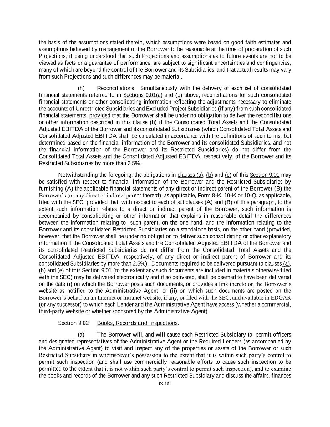 IX-161 the basis of the assumptions stated therein, which assumptions were based on good faith estimates and assumptions believed by management of the Borrower to be reasonable at the time of preparation of such Projections, it being understood that such Projections and assumptions as to future events are not to be viewed as facts or a guarantee of performance, are subject to significant uncertainties and contingencies, many of which are beyond the control of the Borrower and its Subsidiaries, and that actual results may vary from such Projections and such differences may be material. (h) Reconciliations. Simultaneously with the delivery of each set of consolidated financial statements referred to in Sections 9.01(a) and (b) above, reconciliations for such consolidated financial statements or other consolidating information reflecting the adjustments necessary to eliminate the accounts of Unrestricted Subsidiaries and Excluded Project Subsidiaries (if any) from such consolidated financial statements; provided that the Borrower shall be under no obligation to deliver the reconciliations or other information described in this clause (h) if the Consolidated Total Assets and the Consolidated Adjusted EBITDA of the Borrower and its consolidated Subsidiaries (which Consolidated Total Assets and Consolidated Adjusted EBITDA shall be calculated in accordance with the definitions of such terms, but determined based on the financial information of the Borrower and its consolidated Subsidiaries, and not the financial information of the Borrower and its Restricted Subsidiaries) do not differ from the Consolidated Total Assets and the Consolidated Adjusted EBITDA, respectively, of the Borrower and its Restricted Subsidiaries by more than 2.5%. Notwithstanding the foregoing, the obligations in clauses (a), (b) and (e) of this Section 9.01 may be satisfied with respect to financial information of the Borrower and the Restricted Subsidiaries by furnishing (A) the applicable financial statements of any direct or indirect parent of the Borrower (B) the Borrower’s (or any direct or indirect parent thereof), as applicable, Form 8-K, 10-K or 10-Q, as applicable, filed with the SEC; provided that, with respect to each of subclauses (A) and (B) of this paragraph, to the extent such information relates to a direct or indirect parent of the Borrower, such information is accompanied by consolidating or other information that explains in reasonable detail the differences between the information relating to such parent, on the one hand, and the information relating to the Borrower and its consolidated Restricted Subsidiaries on a standalone basis, on the other hand (provided, however, that the Borrower shall be under no obligation to deliver such consolidating or other explanatory information if the Consolidated Total Assets and the Consolidated Adjusted EBITDA of the Borrower and its consolidated Restricted Subsidiaries do not differ from the Consolidated Total Assets and the Consolidated Adjusted EBITDA, respectively, of any direct or indirect parent of Borrower and its consolidated Subsidiaries by more than 2.5%). Documents required to be delivered pursuant to clauses (a), (b) and (e) of this Section 9.01 (to the extent any such documents are included in materials otherwise filed with the SEC) may be delivered electronically and if so delivered, shall be deemed to have been delivered on the date (i) on which the Borrower posts such documents, or provides a link thereto on the Borrower’s website as notified to the Administrative Agent; or (ii) on which such documents are posted on the Borrower’s behalf on an Internet or intranet website, if any, or filed with the SEC, and available in EDGAR (or any successor) to which each Lender and the Administrative Agent have access (whether a commercial, third-party website or whether sponsored by the Administrative Agent). Section 9.02 Books, Records and Inspections. (a) The Borrower will, and will cause each Restricted Subsidiary to, permit officers and designated representatives of the Administrative Agent or the Required Lenders (as accompanied by the Administrative Agent) to visit and inspect any of the properties or assets of the Borrower or such Restricted Subsidiary in whomsoever’s possession to the extent that it is within such party’s control to permit such inspection (and shall use commercially reasonable efforts to cause such inspection to be permitted to the extent that it is not within such party’s control to permit such inspection), and to examine the books and records of the Borrower and any such Restricted Subsidiary and discuss the affairs, finances