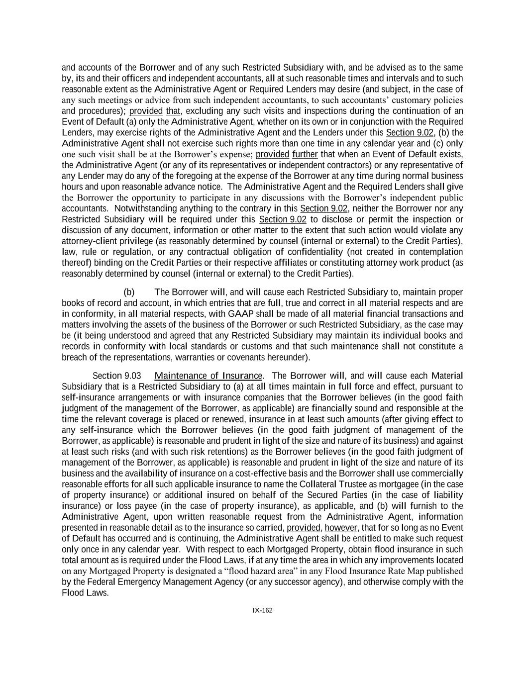 IX-162 and accounts of the Borrower and of any such Restricted Subsidiary with, and be advised as to the same by, its and their officers and independent accountants, all at such reasonable times and intervals and to such reasonable extent as the Administrative Agent or Required Lenders may desire (and subject, in the case of any such meetings or advice from such independent accountants, to such accountants’ customary policies and procedures); provided that, excluding any such visits and inspections during the continuation of an Event of Default (a) only the Administrative Agent, whether on its own or in conjunction with the Required Lenders, may exercise rights of the Administrative Agent and the Lenders under this Section 9.02, (b) the Administrative Agent shall not exercise such rights more than one time in any calendar year and (c) only one such visit shall be at the Borrower’s expense; provided further that when an Event of Default exists, the Administrative Agent (or any of its representatives or independent contractors) or any representative of any Lender may do any of the foregoing at the expense of the Borrower at any time during normal business hours and upon reasonable advance notice. The Administrative Agent and the Required Lenders shall give the Borrower the opportunity to participate in any discussions with the Borrower’s independent public accountants. Notwithstanding anything to the contrary in this Section 9.02, neither the Borrower nor any Restricted Subsidiary will be required under this Section 9.02 to disclose or permit the inspection or discussion of any document, information or other matter to the extent that such action would violate any attorney-client privilege (as reasonably determined by counsel (internal or external) to the Credit Parties), law, rule or regulation, or any contractual obligation of confidentiality (not created in contemplation thereof) binding on the Credit Parties or their respective affiliates or constituting attorney work product (as reasonably determined by counsel (internal or external) to the Credit Parties). (b) The Borrower will, and will cause each Restricted Subsidiary to, maintain proper books of record and account, in which entries that are full, true and correct in all material respects and are in conformity, in all material respects, with GAAP shall be made of all material financial transactions and matters involving the assets of the business of the Borrower or such Restricted Subsidiary, as the case may be (it being understood and agreed that any Restricted Subsidiary may maintain its individual books and records in conformity with local standards or customs and that such maintenance shall not constitute a breach of the representations, warranties or covenants hereunder). Section 9.03 Maintenance of Insurance. The Borrower will, and will cause each Material Subsidiary that is a Restricted Subsidiary to (a) at all times maintain in full force and effect, pursuant to self-insurance arrangements or with insurance companies that the Borrower believes (in the good faith judgment of the management of the Borrower, as applicable) are financially sound and responsible at the time the relevant coverage is placed or renewed, insurance in at least such amounts (after giving effect to any self-insurance which the Borrower believes (in the good faith judgment of management of the Borrower, as applicable) is reasonable and prudent in light of the size and nature of its business) and against at least such risks (and with such risk retentions) as the Borrower believes (in the good faith judgment of management of the Borrower, as applicable) is reasonable and prudent in light of the size and nature of its business and the availability of insurance on a cost-effective basis and the Borrower shall use commercially reasonable efforts for all such applicable insurance to name the Collateral Trustee as mortgagee (in the case of property insurance) or additional insured on behalf of the Secured Parties (in the case of liability insurance) or loss payee (in the case of property insurance), as applicable, and (b) will furnish to the Administrative Agent, upon written reasonable request from the Administrative Agent, information presented in reasonable detail as to the insurance so carried, provided, however, that for so long as no Event of Default has occurred and is continuing, the Administrative Agent shall be entitled to make such request only once in any calendar year. With respect to each Mortgaged Property, obtain flood insurance in such total amount as is required under the Flood Laws, if at any time the area in which any improvements located on any Mortgaged Property is designated a “flood hazard area” in any Flood Insurance Rate Map published by the Federal Emergency Management Agency (or any successor agency), and otherwise comply with the Flood Laws.