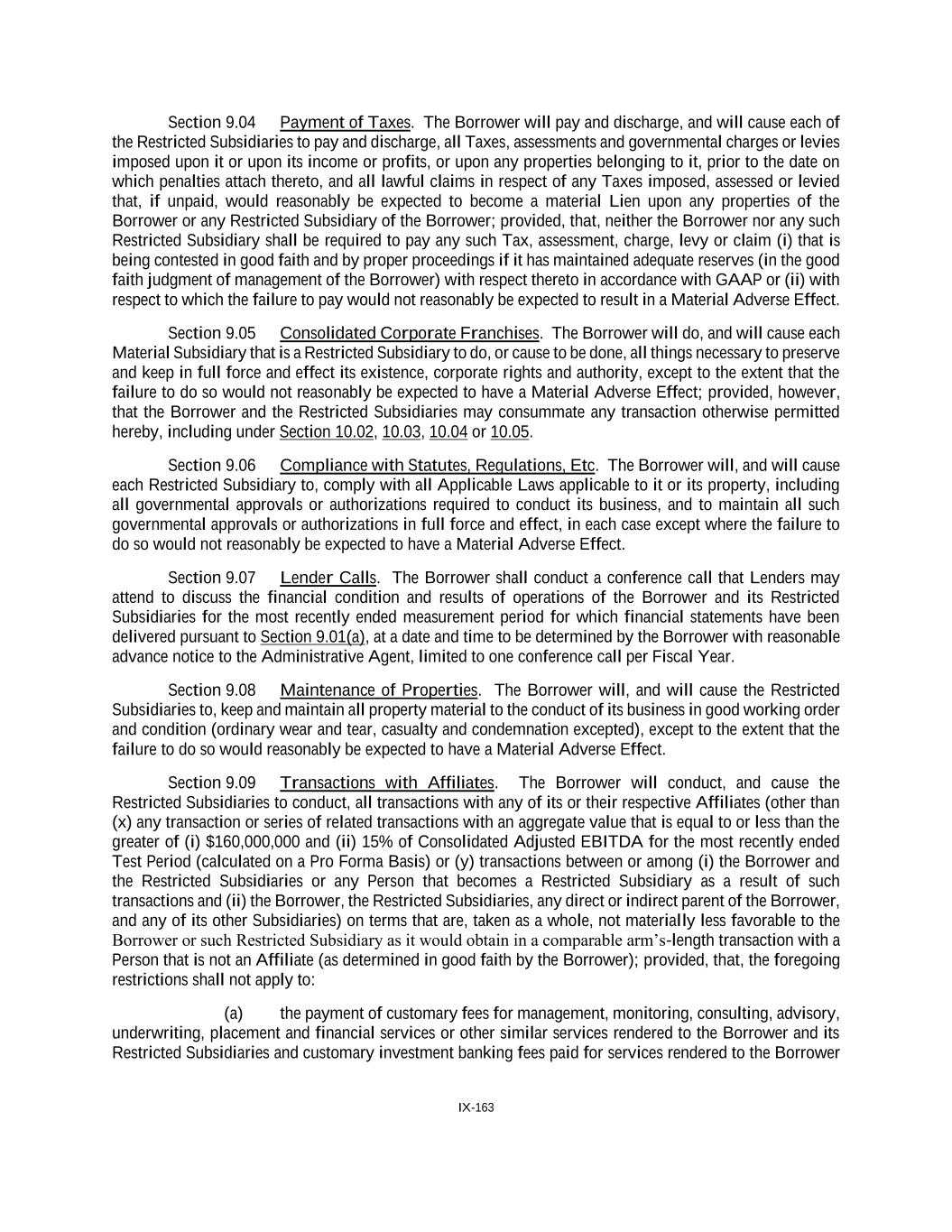 IX-163 Section 9.04 Payment of Taxes. The Borrower will pay and discharge, and will cause each of the Restricted Subsidiaries to pay and discharge, all Taxes, assessments and governmental charges or levies imposed upon it or upon its income or profits, or upon any properties belonging to it, prior to the date on which penalties attach thereto, and all lawful claims in respect of any Taxes imposed, assessed or levied that, if unpaid, would reasonably be expected to become a material Lien upon any properties of the Borrower or any Restricted Subsidiary of the Borrower; provided, that, neither the Borrower nor any such Restricted Subsidiary shall be required to pay any such Tax, assessment, charge, levy or claim (i) that is being contested in good faith and by proper proceedings if it has maintained adequate reserves (in the good faith judgment of management of the Borrower) with respect thereto in accordance with GAAP or (ii) with respect to which the failure to pay would not reasonably be expected to result in a Material Adverse Effect. Section 9.05 Consolidated Corporate Franchises. The Borrower will do, and will cause each Material Subsidiary that is a Restricted Subsidiary to do, or cause to be done, all things necessary to preserve and keep in full force and effect its existence, corporate rights and authority, except to the extent that the failure to do so would not reasonably be expected to have a Material Adverse Effect; provided, however, that the Borrower and the Restricted Subsidiaries may consummate any transaction otherwise permitted hereby, including under Section 10.02, 10.03, 10.04 or 10.05. Section 9.06 Compliance with Statutes, Regulations, Etc. The Borrower will, and will cause each Restricted Subsidiary to, comply with all Applicable Laws applicable to it or its property, including all governmental approvals or authorizations required to conduct its business, and to maintain all such governmental approvals or authorizations in full force and effect, in each case except where the failure to do so would not reasonably be expected to have a Material Adverse Effect. Section 9.07 Lender Calls. The Borrower shall conduct a conference call that Lenders may attend to discuss the financial condition and results of operations of the Borrower and its Restricted Subsidiaries for the most recently ended measurement period for which financial statements have been delivered pursuant to Section 9.01(a), at a date and time to be determined by the Borrower with reasonable advance notice to the Administrative Agent, limited to one conference call per Fiscal Year. Section 9.08 Maintenance of Properties. The Borrower will, and will cause the Restricted Subsidiaries to, keep and maintain all property material to the conduct of its business in good working order and condition (ordinary wear and tear, casualty and condemnation excepted), except to the extent that the failure to do so would reasonably be expected to have a Material Adverse Effect. Section 9.09 Transactions with Affiliates. The Borrower will conduct, and cause the Restricted Subsidiaries to conduct, all transactions with any of its or their respective Affiliates (other than (x) any transaction or series of related transactions with an aggregate value that is equal to or less than the greater of (i) $160,000,000 and (ii) 15% of Consolidated Adjusted EBITDA for the most recently ended Test Period (calculated on a Pro Forma Basis) or (y) transactions between or among (i) the Borrower and the Restricted Subsidiaries or any Person that becomes a Restricted Subsidiary as a result of such transactions and (ii) the Borrower, the Restricted Subsidiaries, any direct or indirect parent of the Borrower, and any of its other Subsidiaries) on terms that are, taken as a whole, not materially less favorable to the Borrower or such Restricted Subsidiary as it would obtain in a comparable arm’s-length transaction with a Person that is not an Affiliate (as determined in good faith by the Borrower); provided, that, the foregoing restrictions shall not apply to: (a) the payment of customary fees for management, monitoring, consulting, advisory, underwriting, placement and financial services or other similar services rendered to the Borrower and its Restricted Subsidiaries and customary investment banking fees paid for services rendered to the Borrower
