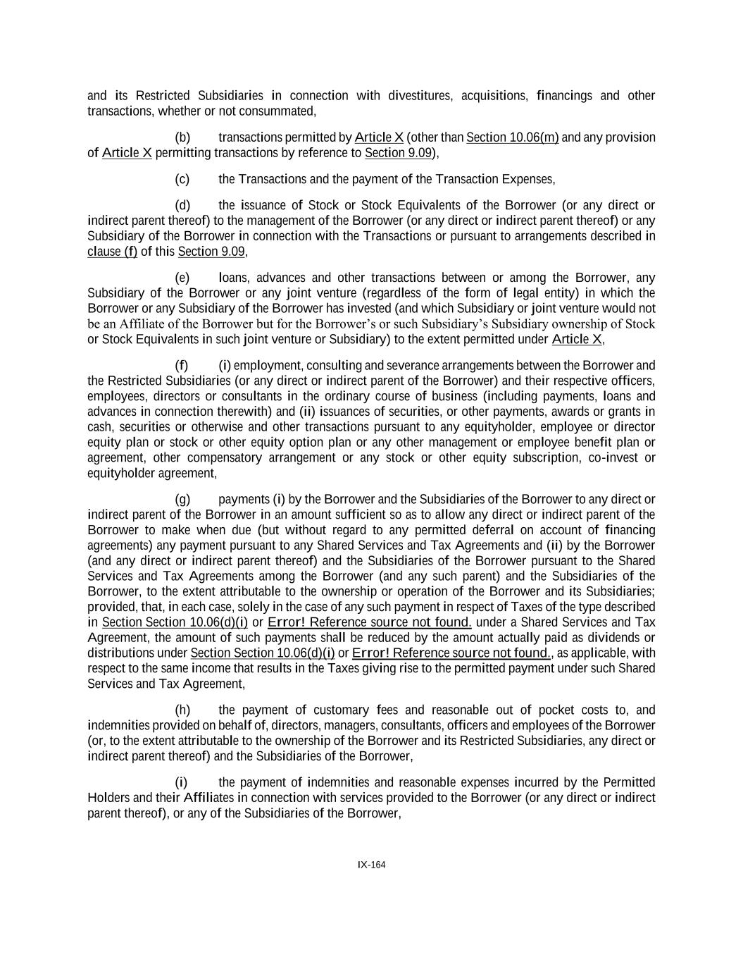 IX-164 and its Restricted Subsidiaries in connection with divestitures, acquisitions, financings and other transactions, whether or not consummated, (b) transactions permitted by Article X (other than Section 10.06(m) and any provision of Article X permitting transactions by reference to Section 9.09), (c) the Transactions and the payment of the Transaction Expenses, (d) the issuance of Stock or Stock Equivalents of the Borrower (or any direct or indirect parent thereof) to the management of the Borrower (or any direct or indirect parent thereof) or any Subsidiary of the Borrower in connection with the Transactions or pursuant to arrangements described in clause (f) of this Section 9.09, (e) loans, advances and other transactions between or among the Borrower, any Subsidiary of the Borrower or any joint venture (regardless of the form of legal entity) in which the Borrower or any Subsidiary of the Borrower has invested (and which Subsidiary or joint venture would not be an Affiliate of the Borrower but for the Borrower’s or such Subsidiary’s Subsidiary ownership of Stock or Stock Equivalents in such joint venture or Subsidiary) to the extent permitted under Article X, (f) (i) employment, consulting and severance arrangements between the Borrower and the Restricted Subsidiaries (or any direct or indirect parent of the Borrower) and their respective officers, employees, directors or consultants in the ordinary course of business (including payments, loans and advances in connection therewith) and (ii) issuances of securities, or other payments, awards or grants in cash, securities or otherwise and other transactions pursuant to any equityholder, employee or director equity plan or stock or other equity option plan or any other management or employee benefit plan or agreement, other compensatory arrangement or any stock or other equity subscription, co-invest or equityholder agreement, (g) payments (i) by the Borrower and the Subsidiaries of the Borrower to any direct or indirect parent of the Borrower in an amount sufficient so as to allow any direct or indirect parent of the Borrower to make when due (but without regard to any permitted deferral on account of financing agreements) any payment pursuant to any Shared Services and Tax Agreements and (ii) by the Borrower (and any direct or indirect parent thereof) and the Subsidiaries of the Borrower pursuant to the Shared Services and Tax Agreements among the Borrower (and any such parent) and the Subsidiaries of the Borrower, to the extent attributable to the ownership or operation of the Borrower and its Subsidiaries; provided, that, in each case, solely in the case of any such payment in respect of Taxes of the type described in Section Section 10.06(d)(i) or Error! Reference source not found. under a Shared Services and Tax Agreement, the amount of such payments shall be reduced by the amount actually paid as dividends or distributions under Section Section 10.06(d)(i) or Error! Reference source not found., as applicable, with respect to the same income that results in the Taxes giving rise to the permitted payment under such Shared Services and Tax Agreement, (h) the payment of customary fees and reasonable out of pocket costs to, and indemnities provided on behalf of, directors, managers, consultants, officers and employees of the Borrower (or, to the extent attributable to the ownership of the Borrower and its Restricted Subsidiaries, any direct or indirect parent thereof) and the Subsidiaries of the Borrower, (i) the payment of indemnities and reasonable expenses incurred by the Permitted Holders and their Affiliates in connection with services provided to the Borrower (or any direct or indirect parent thereof), or any of the Subsidiaries of the Borrower,