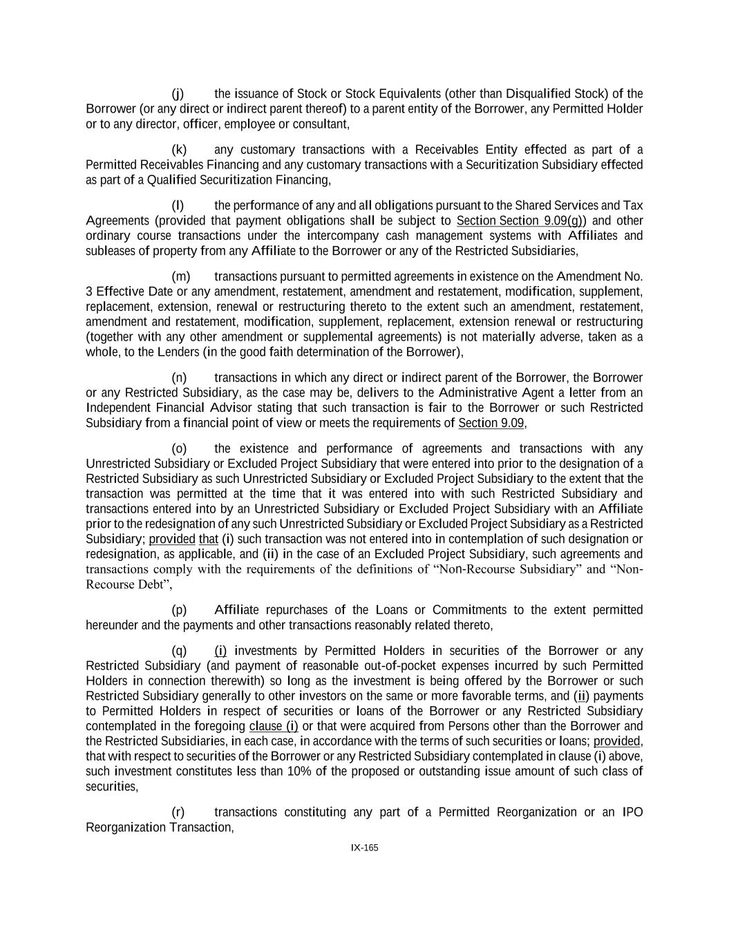 IX-165 (j) the issuance of Stock or Stock Equivalents (other than Disqualified Stock) of the Borrower (or any direct or indirect parent thereof) to a parent entity of the Borrower, any Permitted Holder or to any director, officer, employee or consultant, (k) any customary transactions with a Receivables Entity effected as part of a Permitted Receivables Financing and any customary transactions with a Securitization Subsidiary effected as part of a Qualified Securitization Financing, (l) the performance of any and all obligations pursuant to the Shared Services and Tax Agreements (provided that payment obligations shall be subject to Section Section 9.09(g)) and other ordinary course transactions under the intercompany cash management systems with Affiliates and subleases of property from any Affiliate to the Borrower or any of the Restricted Subsidiaries, (m) transactions pursuant to permitted agreements in existence on the Amendment No. 3 Effective Date or any amendment, restatement, amendment and restatement, modification, supplement, replacement, extension, renewal or restructuring thereto to the extent such an amendment, restatement, amendment and restatement, modification, supplement, replacement, extension renewal or restructuring (together with any other amendment or supplemental agreements) is not materially adverse, taken as a whole, to the Lenders (in the good faith determination of the Borrower), (n) transactions in which any direct or indirect parent of the Borrower, the Borrower or any Restricted Subsidiary, as the case may be, delivers to the Administrative Agent a letter from an Independent Financial Advisor stating that such transaction is fair to the Borrower or such Restricted Subsidiary from a financial point of view or meets the requirements of Section 9.09, (o) the existence and performance of agreements and transactions with any Unrestricted Subsidiary or Excluded Project Subsidiary that were entered into prior to the designation of a Restricted Subsidiary as such Unrestricted Subsidiary or Excluded Project Subsidiary to the extent that the transaction was permitted at the time that it was entered into with such Restricted Subsidiary and transactions entered into by an Unrestricted Subsidiary or Excluded Project Subsidiary with an Affiliate prior to the redesignation of any such Unrestricted Subsidiary or Excluded Project Subsidiary as a Restricted Subsidiary; provided that (i) such transaction was not entered into in contemplation of such designation or redesignation, as applicable, and (ii) in the case of an Excluded Project Subsidiary, such agreements and transactions comply with the requirements of the definitions of “Non-Recourse Subsidiary” and “Non- Recourse Debt”, (p) Affiliate repurchases of the Loans or Commitments to the extent permitted hereunder and the payments and other transactions reasonably related thereto, (q) (i) investments by Permitted Holders in securities of the Borrower or any Restricted Subsidiary (and payment of reasonable out-of-pocket expenses incurred by such Permitted Holders in connection therewith) so long as the investment is being offered by the Borrower or such Restricted Subsidiary generally to other investors on the same or more favorable terms, and (ii) payments to Permitted Holders in respect of securities or loans of the Borrower or any Restricted Subsidiary contemplated in the foregoing clause (i) or that were acquired from Persons other than the Borrower and the Restricted Subsidiaries, in each case, in accordance with the terms of such securities or loans; provided, that with respect to securities of the Borrower or any Restricted Subsidiary contemplated in clause (i) above, such investment constitutes less than 10% of the proposed or outstanding issue amount of such class of securities, (r) transactions constituting any part of a Permitted Reorganization or an IPO Reorganization Transaction,