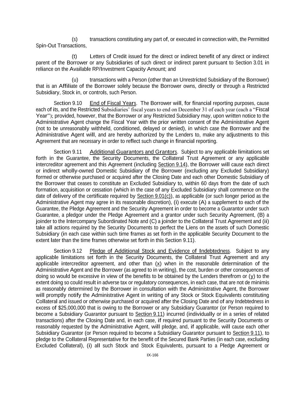 IX-166 (s) transactions constituting any part of, or executed in connection with, the Permitted Spin-Out Transactions, (t) Letters of Credit issued for the direct or indirect benefit of any direct or indirect parent of the Borrower or any Subsidiaries of such direct or indirect parent pursuant to Section 3.01 in reliance on the Available RP/Investment Capacity Amount; and (u) transactions with a Person (other than an Unrestricted Subsidiary of the Borrower) that is an Affiliate of the Borrower solely because the Borrower owns, directly or through a Restricted Subsidiary, Stock in, or controls, such Person. Section 9.10 End of Fiscal Years. The Borrower will, for financial reporting purposes, cause each of its, and the Restricted Subsidiaries’ fiscal years to end on December 31 of each year (each a “Fiscal Year”); provided, however, that the Borrower or any Restricted Subsidiary may, upon written notice to the Administrative Agent change the Fiscal Year with the prior written consent of the Administrative Agent (not to be unreasonably withheld, conditioned, delayed or denied), in which case the Borrower and the Administrative Agent will, and are hereby authorized by the Lenders to, make any adjustments to this Agreement that are necessary in order to reflect such change in financial reporting. Section 9.11 Additional Guarantors and Grantors. Subject to any applicable limitations set forth in the Guarantee, the Security Documents, the Collateral Trust Agreement or any applicable intercreditor agreement and this Agreement (including Section 9.14), the Borrower will cause each direct or indirect wholly-owned Domestic Subsidiary of the Borrower (excluding any Excluded Subsidiary) formed or otherwise purchased or acquired after the Closing Date and each other Domestic Subsidiary of the Borrower that ceases to constitute an Excluded Subsidiary to, within 60 days from the date of such formation, acquisition or cessation (which in the case of any Excluded Subsidiary shall commence on the date of delivery of the certificate required by Section 9.01(c)), as applicable (or such longer period as the Administrative Agent may agree in its reasonable discretion), (i) execute (A) a supplement to each of the Guarantee, the Pledge Agreement and the Security Agreement in order to become a Guarantor under such Guarantee, a pledgor under the Pledge Agreement and a grantor under such Security Agreement, (B) a joinder to the Intercompany Subordinated Note and (C) a joinder to the Collateral Trust Agreement and (ii) take all actions required by the Security Documents to perfect the Liens on the assets of such Domestic Subsidiary (in each case within such time frames as set forth in the applicable Security Document to the extent later than the time frames otherwise set forth in this Section 9.11). Section 9.12 Pledge of Additional Stock and Evidence of Indebtedness. Subject to any applicable limitations set forth in the Security Documents, the Collateral Trust Agreement and any applicable intercreditor agreement, and other than (x) when in the reasonable determination of the Administrative Agent and the Borrower (as agreed to in writing), the cost, burden or other consequences of doing so would be excessive in view of the benefits to be obtained by the Lenders therefrom or (y) to the extent doing so could result in adverse tax or regulatory consequences, in each case, that are not de minimis as reasonably determined by the Borrower in consultation with the Administrative Agent, the Borrower will promptly notify the Administrative Agent in writing of any Stock or Stock Equivalents constituting Collateral and issued or otherwise purchased or acquired after the Closing Date and of any Indebtedness in excess of $25,000,000 that is owing to the Borrower or any Subsidiary Guarantor (or Person required to become a Subsidiary Guarantor pursuant to Section 9.11) incurred (individually or in a series of related transactions) after the Closing Date and, in each case, if required pursuant to the Security Documents or reasonably requested by the Administrative Agent, will pledge, and, if applicable, will cause each other Subsidiary Guarantor (or Person required to become a Subsidiary Guarantor pursuant to Section 9.11), to pledge to the Collateral Representative for the benefit of the Secured Bank Parties (in each case, excluding Excluded Collateral), (i) all such Stock and Stock Equivalents, pursuant to a Pledge Agreement or