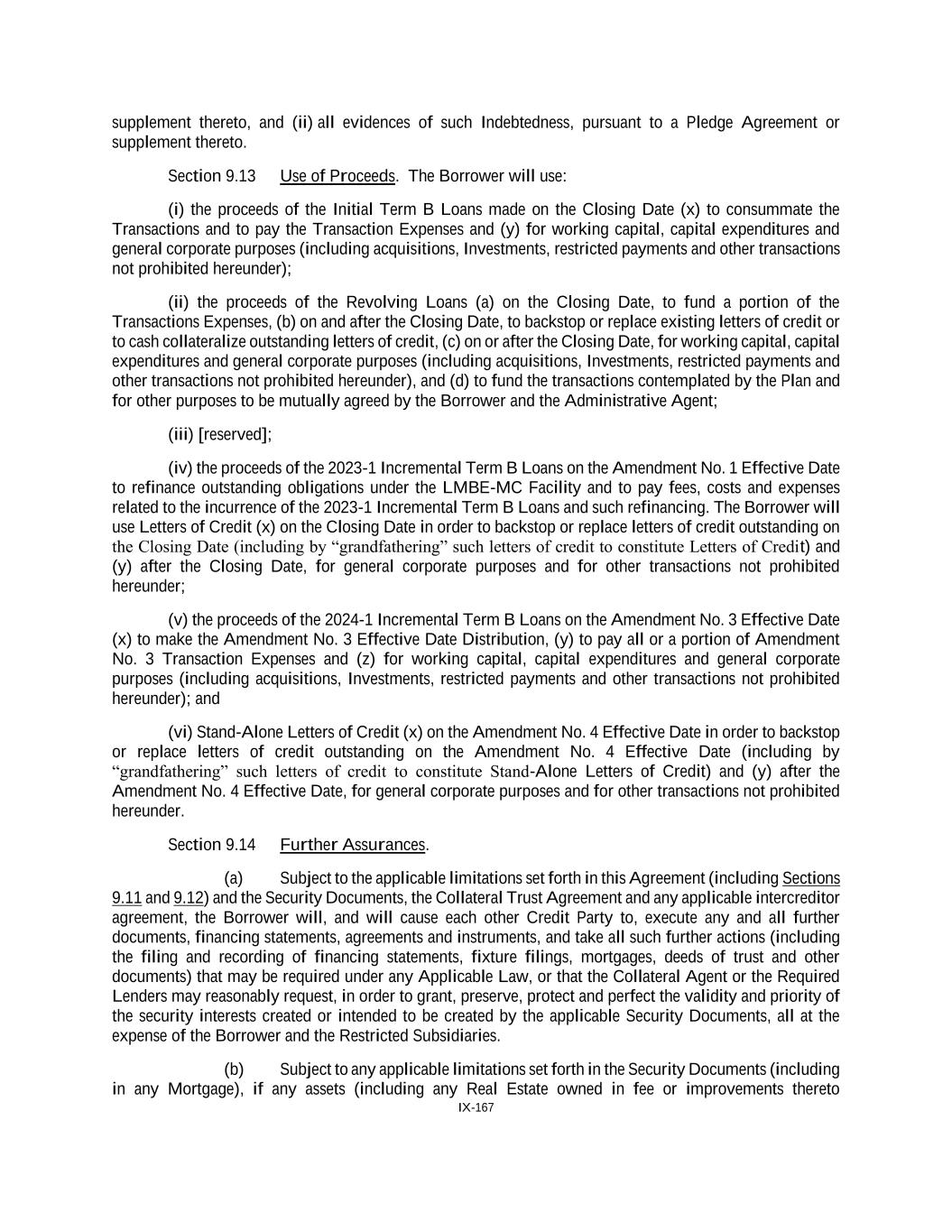 IX-167 supplement thereto, and (ii) all evidences of such Indebtedness, pursuant to a Pledge Agreement or supplement thereto. Section 9.13 Use of Proceeds. The Borrower will use: (i) the proceeds of the Initial Term B Loans made on the Closing Date (x) to consummate the Transactions and to pay the Transaction Expenses and (y) for working capital, capital expenditures and general corporate purposes (including acquisitions, Investments, restricted payments and other transactions not prohibited hereunder); (ii) the proceeds of the Revolving Loans (a) on the Closing Date, to fund a portion of the Transactions Expenses, (b) on and after the Closing Date, to backstop or replace existing letters of credit or to cash collateralize outstanding letters of credit, (c) on or after the Closing Date, for working capital, capital expenditures and general corporate purposes (including acquisitions, Investments, restricted payments and other transactions not prohibited hereunder), and (d) to fund the transactions contemplated by the Plan and for other purposes to be mutually agreed by the Borrower and the Administrative Agent; (iii) [reserved]; (iv) the proceeds of the 2023-1 Incremental Term B Loans on the Amendment No. 1 Effective Date to refinance outstanding obligations under the LMBE-MC Facility and to pay fees, costs and expenses related to the incurrence of the 2023-1 Incremental Term B Loans and such refinancing. The Borrower will use Letters of Credit (x) on the Closing Date in order to backstop or replace letters of credit outstanding on the Closing Date (including by “grandfathering” such letters of credit to constitute Letters of Credit) and (y) after the Closing Date, for general corporate purposes and for other transactions not prohibited hereunder; (v) the proceeds of the 2024-1 Incremental Term B Loans on the Amendment No. 3 Effective Date (x) to make the Amendment No. 3 Effective Date Distribution, (y) to pay all or a portion of Amendment No. 3 Transaction Expenses and (z) for working capital, capital expenditures and general corporate purposes (including acquisitions, Investments, restricted payments and other transactions not prohibited hereunder); and (vi) Stand-Alone Letters of Credit (x) on the Amendment No. 4 Effective Date in order to backstop or replace letters of credit outstanding on the Amendment No. 4 Effective Date (including by “grandfathering” such letters of credit to constitute Stand-Alone Letters of Credit) and (y) after the Amendment No. 4 Effective Date, for general corporate purposes and for other transactions not prohibited hereunder. Section 9.14 Further Assurances. (a) Subject to the applicable limitations set forth in this Agreement (including Sections 9.11 and 9.12) and the Security Documents, the Collateral Trust Agreement and any applicable intercreditor agreement, the Borrower will, and will cause each other Credit Party to, execute any and all further documents, financing statements, agreements and instruments, and take all such further actions (including the filing and recording of financing statements, fixture filings, mortgages, deeds of trust and other documents) that may be required under any Applicable Law, or that the Collateral Agent or the Required Lenders may reasonably request, in order to grant, preserve, protect and perfect the validity and priority of the security interests created or intended to be created by the applicable Security Documents, all at the expense of the Borrower and the Restricted Subsidiaries. (b) Subject to any applicable limitations set forth in the Security Documents (including in any Mortgage), if any assets (including any Real Estate owned in fee or improvements thereto