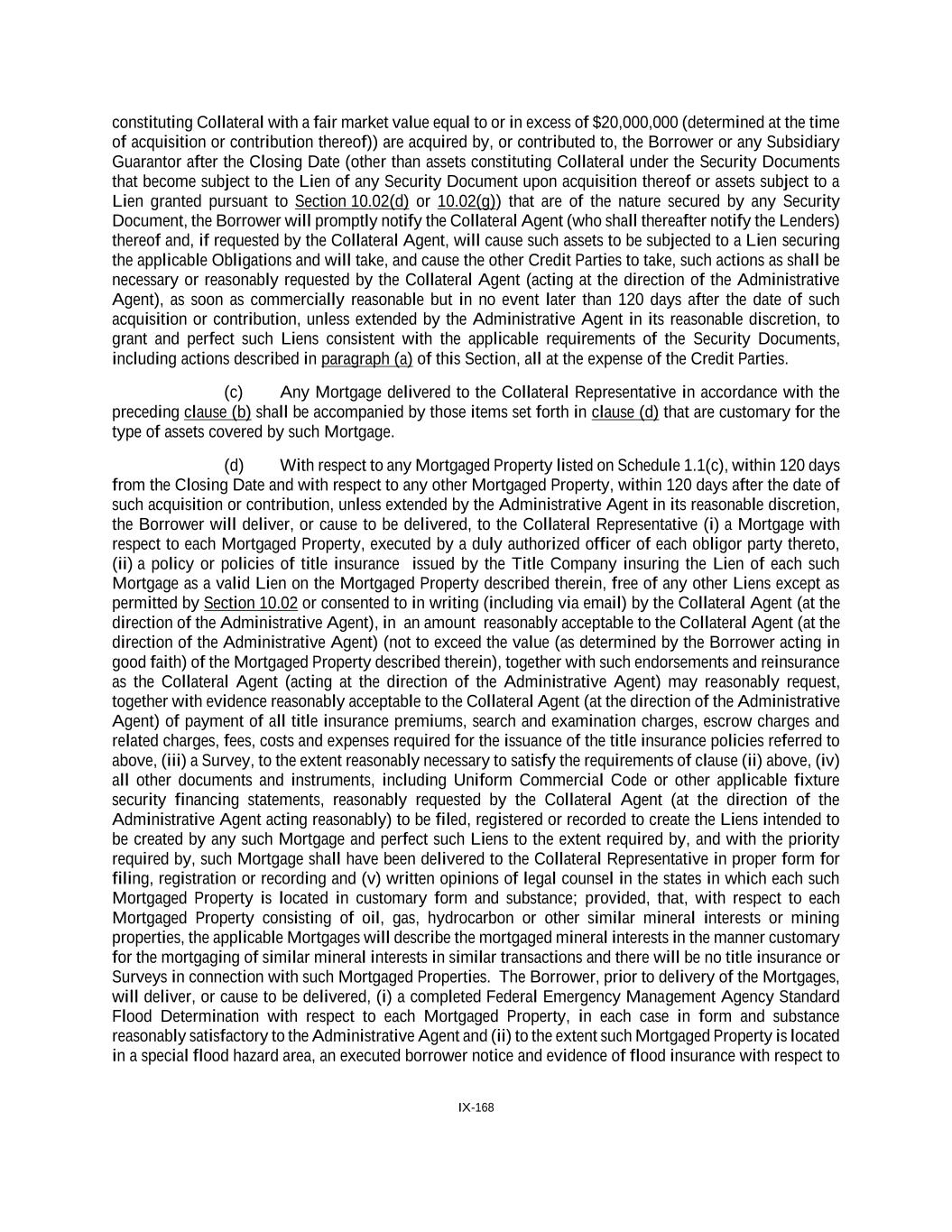 IX-168 constituting Collateral with a fair market value equal to or in excess of $20,000,000 (determined at the time of acquisition or contribution thereof)) are acquired by, or contributed to, the Borrower or any Subsidiary Guarantor after the Closing Date (other than assets constituting Collateral under the Security Documents that become subject to the Lien of any Security Document upon acquisition thereof or assets subject to a Lien granted pursuant to Section 10.02(d) or 10.02(g)) that are of the nature secured by any Security Document, the Borrower will promptly notify the Collateral Agent (who shall thereafter notify the Lenders) thereof and, if requested by the Collateral Agent, will cause such assets to be subjected to a Lien securing the applicable Obligations and will take, and cause the other Credit Parties to take, such actions as shall be necessary or reasonably requested by the Collateral Agent (acting at the direction of the Administrative Agent), as soon as commercially reasonable but in no event later than 120 days after the date of such acquisition or contribution, unless extended by the Administrative Agent in its reasonable discretion, to grant and perfect such Liens consistent with the applicable requirements of the Security Documents, including actions described in paragraph (a) of this Section, all at the expense of the Credit Parties. (c) Any Mortgage delivered to the Collateral Representative in accordance with the preceding clause (b) shall be accompanied by those items set forth in clause (d) that are customary for the type of assets covered by such Mortgage. (d) With respect to any Mortgaged Property listed on Schedule 1.1(c), within 120 days from the Closing Date and with respect to any other Mortgaged Property, within 120 days after the date of such acquisition or contribution, unless extended by the Administrative Agent in its reasonable discretion, the Borrower will deliver, or cause to be delivered, to the Collateral Representative (i) a Mortgage with respect to each Mortgaged Property, executed by a duly authorized officer of each obligor party thereto, (ii) a policy or policies of title insurance issued by the Title Company insuring the Lien of each such Mortgage as a valid Lien on the Mortgaged Property described therein, free of any other Liens except as permitted by Section 10.02 or consented to in writing (including via email) by the Collateral Agent (at the direction of the Administrative Agent), in an amount reasonably acceptable to the Collateral Agent (at the direction of the Administrative Agent) (not to exceed the value (as determined by the Borrower acting in good faith) of the Mortgaged Property described therein), together with such endorsements and reinsurance as the Collateral Agent (acting at the direction of the Administrative Agent) may reasonably request, together with evidence reasonably acceptable to the Collateral Agent (at the direction of the Administrative Agent) of payment of all title insurance premiums, search and examination charges, escrow charges and related charges, fees, costs and expenses required for the issuance of the title insurance policies referred to above, (iii) a Survey, to the extent reasonably necessary to satisfy the requirements of clause (ii) above, (iv) all other documents and instruments, including Uniform Commercial Code or other applicable fixture security financing statements, reasonably requested by the Collateral Agent (at the direction of the Administrative Agent acting reasonably) to be filed, registered or recorded to create the Liens intended to be created by any such Mortgage and perfect such Liens to the extent required by, and with the priority required by, such Mortgage shall have been delivered to the Collateral Representative in proper form for filing, registration or recording and (v) written opinions of legal counsel in the states in which each such Mortgaged Property is located in customary form and substance; provided, that, with respect to each Mortgaged Property consisting of oil, gas, hydrocarbon or other similar mineral interests or mining properties, the applicable Mortgages will describe the mortgaged mineral interests in the manner customary for the mortgaging of similar mineral interests in similar transactions and there will be no title insurance or Surveys in connection with such Mortgaged Properties. The Borrower, prior to delivery of the Mortgages, will deliver, or cause to be delivered, (i) a completed Federal Emergency Management Agency Standard Flood Determination with respect to each Mortgaged Property, in each case in form and substance reasonably satisfactory to the Administrative Agent and (ii) to the extent such Mortgaged Property is located in a special flood hazard area, an executed borrower notice and evidence of flood insurance with respect to