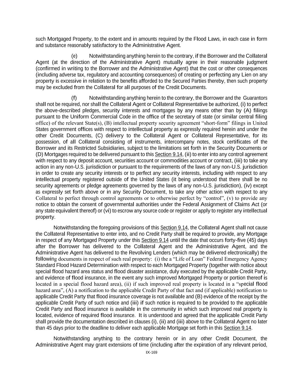 IX-169 such Mortgaged Property, to the extent and in amounts required by the Flood Laws, in each case in form and substance reasonably satisfactory to the Administrative Agent. (e) Notwithstanding anything herein to the contrary, if the Borrower and the Collateral Agent (at the direction of the Administrative Agent) mutually agree in their reasonable judgment (confirmed in writing to the Borrower and the Administrative Agent) that the cost or other consequences (including adverse tax, regulatory and accounting consequences) of creating or perfecting any Lien on any property is excessive in relation to the benefits afforded to the Secured Parties thereby, then such property may be excluded from the Collateral for all purposes of the Credit Documents. (f) Notwithstanding anything herein to the contrary, the Borrower and the Guarantors shall not be required, nor shall the Collateral Agent or Collateral Representative be authorized, (i) to perfect the above-described pledges, security interests and mortgages by any means other than by (A) filings pursuant to the Uniform Commercial Code in the office of the secretary of state (or similar central filing office) of the relevant State(s), (B) intellectual property security agreement “short-form” filings in United States government offices with respect to intellectual property as expressly required herein and under the other Credit Documents, (C) delivery to the Collateral Agent or Collateral Representative, for its possession, of all Collateral consisting of instruments, intercompany notes, stock certificates of the Borrower and its Restricted Subsidiaries, subject to the limitations set forth in the Security Documents or (D) Mortgages required to be delivered pursuant to this Section 9.14, (ii) to enter into any control agreement with respect to any deposit account, securities account or commodities account or contract, (iii) to take any action in any non-U.S. jurisdiction or pursuant to the requirements of the laws of any non-U.S. jurisdiction in order to create any security interests or to perfect any security interests, including with respect to any intellectual property registered outside of the United States (it being understood that there shall be no security agreements or pledge agreements governed by the laws of any non-U.S. jurisdiction), (iv) except as expressly set forth above or in any Security Document, to take any other action with respect to any Collateral to perfect through control agreements or to otherwise perfect by “control”, (v) to provide any notice to obtain the consent of governmental authorities under the Federal Assignment of Claims Act (or any state equivalent thereof) or (vi) to escrow any source code or register or apply to register any intellectual property. Notwithstanding the foregoing provisions of this Section 9.14, the Collateral Agent shall not cause the Collateral Representative to enter into, and no Credit Party shall be required to provide, any Mortgage in respect of any Mortgaged Property under this Section 9.14 until the date that occurs forty-five (45) days after the Borrower has delivered to the Collateral Agent and the Administrative Agent, and the Administrative Agent has delivered to the Revolving Lenders (which may be delivered electronically) the following documents in respect of such real property: (i) the a “Life of Loan” Federal Emergency Agency Standard Flood Hazard Determination with respect to each Mortgaged Property (together with notice about special flood hazard area status and flood disaster assistance, duly executed by the applicable Credit Party, and evidence of flood insurance, in the event any such improved Mortgaged Property or portion thereof is located in a special flood hazard area), (ii) if such improved real property is located in a “special flood hazard area”, (A) a notification to the applicable Credit Party of that fact and (if applicable) notification to applicable Credit Party that flood insurance coverage is not available and (B) evidence of the receipt by the applicable Credit Party of such notice and (iii) if such notice is required to be provided to the applicable Credit Party and flood insurance is available in the community in which such improved real property is located, evidence of required flood insurance. It is understood and agreed that the applicable Credit Party shall provide the documentation described in clauses (i), (ii) and (iii) above to the Collateral Agent no later than 45 days prior to the deadline to deliver each applicable Mortgage set forth in this Section 9.14. Notwithstanding anything to the contrary herein or in any other Credit Document, the Administrative Agent may grant extensions of time (including after the expiration of any relevant period,