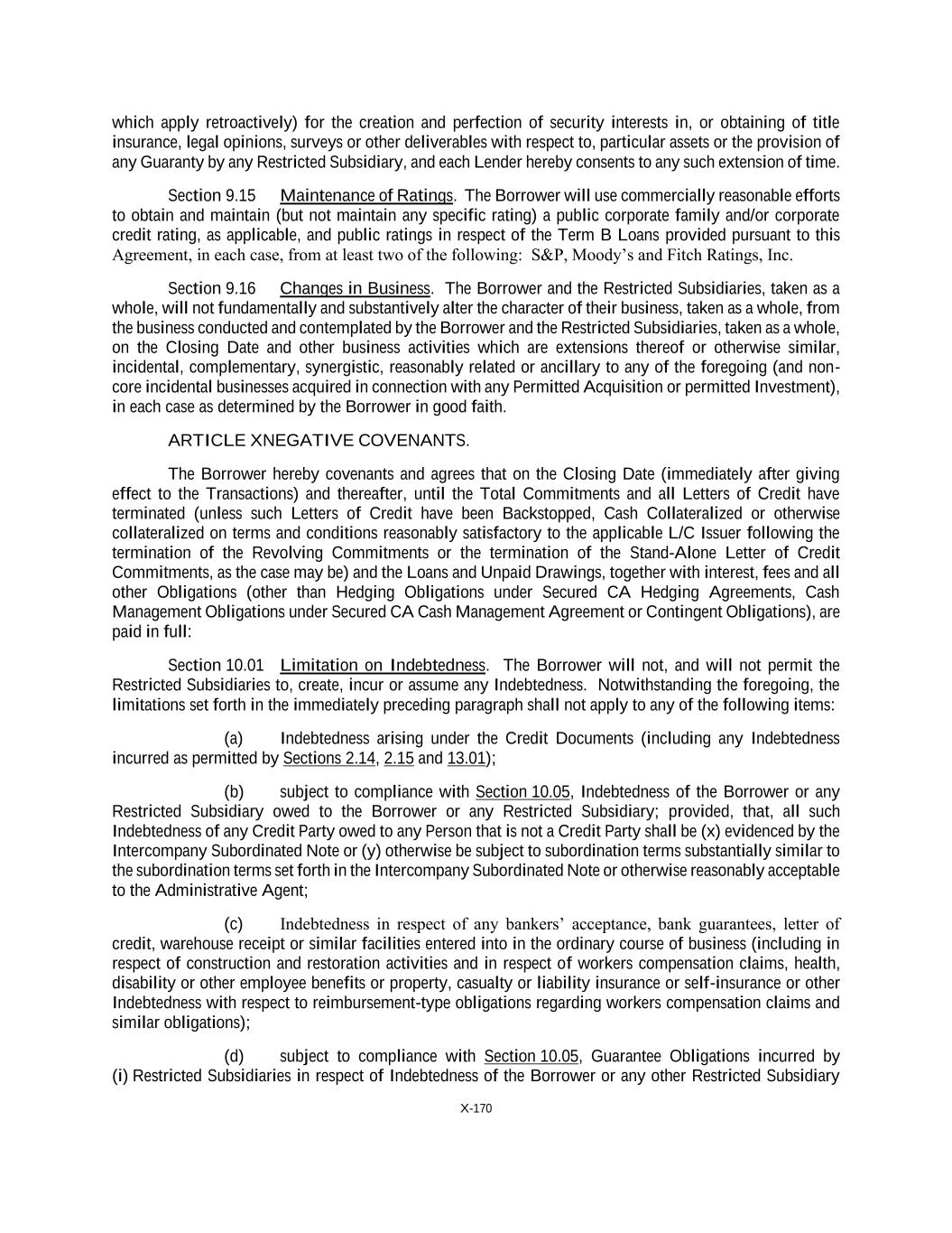 X-170 which apply retroactively) for the creation and perfection of security interests in, or obtaining of title insurance, legal opinions, surveys or other deliverables with respect to, particular assets or the provision of any Guaranty by any Restricted Subsidiary, and each Lender hereby consents to any such extension of time. Section 9.15 Maintenance of Ratings. The Borrower will use commercially reasonable efforts to obtain and maintain (but not maintain any specific rating) a public corporate family and/or corporate credit rating, as applicable, and public ratings in respect of the Term B Loans provided pursuant to this Agreement, in each case, from at least two of the following: S&P, Moody’s and Fitch Ratings, Inc. Section 9.16 Changes in Business. The Borrower and the Restricted Subsidiaries, taken as a whole, will not fundamentally and substantively alter the character of their business, taken as a whole, from the business conducted and contemplated by the Borrower and the Restricted Subsidiaries, taken as a whole, on the Closing Date and other business activities which are extensions thereof or otherwise similar, incidental, complementary, synergistic, reasonably related or ancillary to any of the foregoing (and non- core incidental businesses acquired in connection with any Permitted Acquisition or permitted Investment), in each case as determined by the Borrower in good faith. ARTICLE XNEGATIVE COVENANTS. The Borrower hereby covenants and agrees that on the Closing Date (immediately after giving effect to the Transactions) and thereafter, until the Total Commitments and all Letters of Credit have terminated (unless such Letters of Credit have been Backstopped, Cash Collateralized or otherwise collateralized on terms and conditions reasonably satisfactory to the applicable L/C Issuer following the termination of the Revolving Commitments or the termination of the Stand-Alone Letter of Credit Commitments, as the case may be) and the Loans and Unpaid Drawings, together with interest, fees and all other Obligations (other than Hedging Obligations under Secured CA Hedging Agreements, Cash Management Obligations under Secured CA Cash Management Agreement or Contingent Obligations), are paid in full: Section 10.01 Limitation on Indebtedness. The Borrower will not, and will not permit the Restricted Subsidiaries to, create, incur or assume any Indebtedness. Notwithstanding the foregoing, the limitations set forth in the immediately preceding paragraph shall not apply to any of the following items: (a) Indebtedness arising under the Credit Documents (including any Indebtedness incurred as permitted by Sections 2.14, 2.15 and 13.01); (b) subject to compliance with Section 10.05, Indebtedness of the Borrower or any Restricted Subsidiary owed to the Borrower or any Restricted Subsidiary; provided, that, all such Indebtedness of any Credit Party owed to any Person that is not a Credit Party shall be (x) evidenced by the Intercompany Subordinated Note or (y) otherwise be subject to subordination terms substantially similar to the subordination terms set forth in the Intercompany Subordinated Note or otherwise reasonably acceptable to the Administrative Agent; (c) Indebtedness in respect of any bankers’ acceptance, bank guarantees, letter of credit, warehouse receipt or similar facilities entered into in the ordinary course of business (including in respect of construction and restoration activities and in respect of workers compensation claims, health, disability or other employee benefits or property, casualty or liability insurance or self-insurance or other Indebtedness with respect to reimbursement-type obligations regarding workers compensation claims and similar obligations); (d) subject to compliance with Section 10.05, Guarantee Obligations incurred by (i) Restricted Subsidiaries in respect of Indebtedness of the Borrower or any other Restricted Subsidiary
