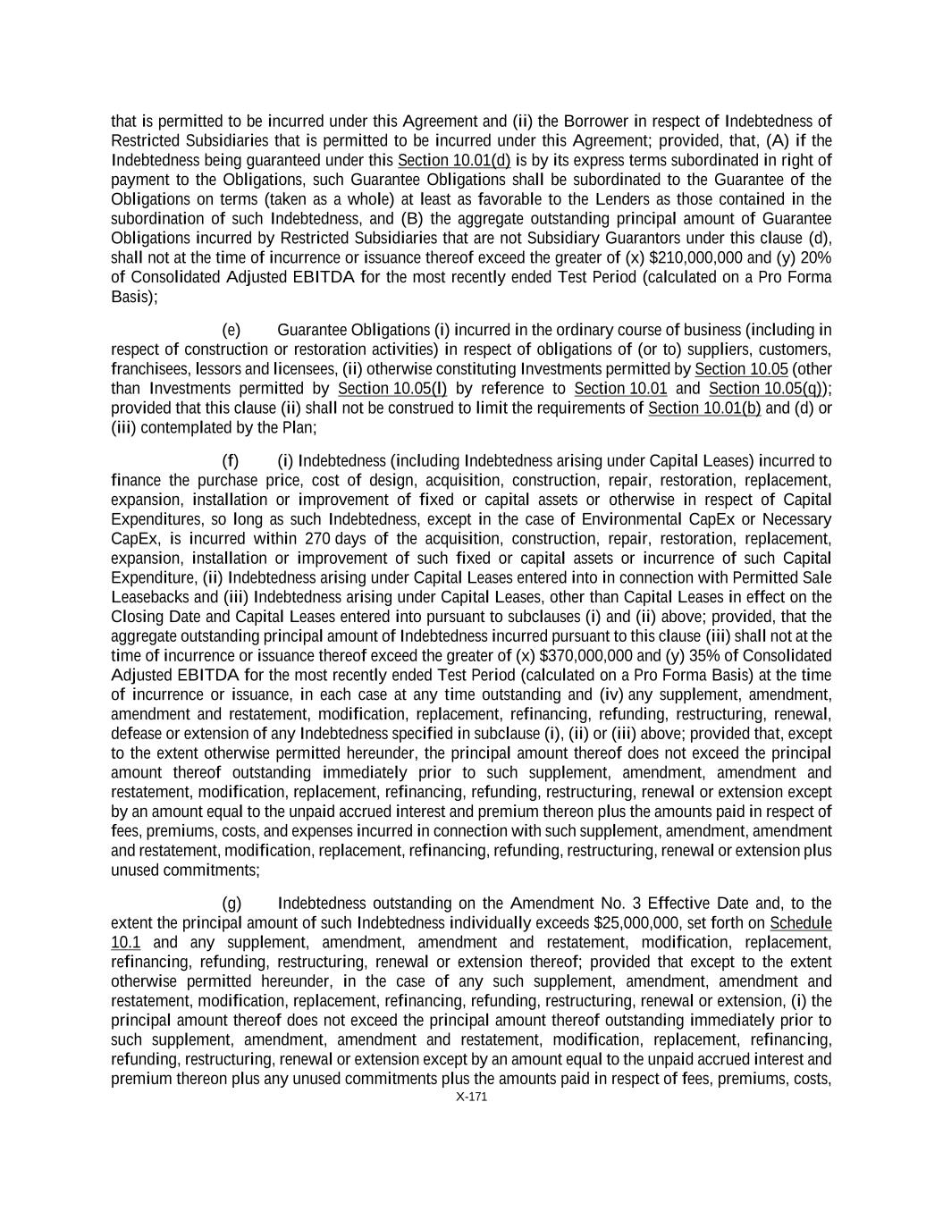 X-171 that is permitted to be incurred under this Agreement and (ii) the Borrower in respect of Indebtedness of Restricted Subsidiaries that is permitted to be incurred under this Agreement; provided, that, (A) if the Indebtedness being guaranteed under this Section 10.01(d) is by its express terms subordinated in right of payment to the Obligations, such Guarantee Obligations shall be subordinated to the Guarantee of the Obligations on terms (taken as a whole) at least as favorable to the Lenders as those contained in the subordination of such Indebtedness, and (B) the aggregate outstanding principal amount of Guarantee Obligations incurred by Restricted Subsidiaries that are not Subsidiary Guarantors under this clause (d), shall not at the time of incurrence or issuance thereof exceed the greater of (x) $210,000,000 and (y) 20% of Consolidated Adjusted EBITDA for the most recently ended Test Period (calculated on a Pro Forma Basis); (e) Guarantee Obligations (i) incurred in the ordinary course of business (including in respect of construction or restoration activities) in respect of obligations of (or to) suppliers, customers, franchisees, lessors and licensees, (ii) otherwise constituting Investments permitted by Section 10.05 (other than Investments permitted by Section 10.05(l) by reference to Section 10.01 and Section 10.05(q)); provided that this clause (ii) shall not be construed to limit the requirements of Section 10.01(b) and (d) or (iii) contemplated by the Plan; (f) (i) Indebtedness (including Indebtedness arising under Capital Leases) incurred to finance the purchase price, cost of design, acquisition, construction, repair, restoration, replacement, expansion, installation or improvement of fixed or capital assets or otherwise in respect of Capital Expenditures, so long as such Indebtedness, except in the case of Environmental CapEx or Necessary CapEx, is incurred within 270 days of the acquisition, construction, repair, restoration, replacement, expansion, installation or improvement of such fixed or capital assets or incurrence of such Capital Expenditure, (ii) Indebtedness arising under Capital Leases entered into in connection with Permitted Sale Leasebacks and (iii) Indebtedness arising under Capital Leases, other than Capital Leases in effect on the Closing Date and Capital Leases entered into pursuant to subclauses (i) and (ii) above; provided, that the aggregate outstanding principal amount of Indebtedness incurred pursuant to this clause (iii) shall not at the time of incurrence or issuance thereof exceed the greater of (x) $370,000,000 and (y) 35% of Consolidated Adjusted EBITDA for the most recently ended Test Period (calculated on a Pro Forma Basis) at the time of incurrence or issuance, in each case at any time outstanding and (iv) any supplement, amendment, amendment and restatement, modification, replacement, refinancing, refunding, restructuring, renewal, defease or extension of any Indebtedness specified in subclause (i), (ii) or (iii) above; provided that, except to the extent otherwise permitted hereunder, the principal amount thereof does not exceed the principal amount thereof outstanding immediately prior to such supplement, amendment, amendment and restatement, modification, replacement, refinancing, refunding, restructuring, renewal or extension except by an amount equal to the unpaid accrued interest and premium thereon plus the amounts paid in respect of fees, premiums, costs, and expenses incurred in connection with such supplement, amendment, amendment and restatement, modification, replacement, refinancing, refunding, restructuring, renewal or extension plus unused commitments; (g) Indebtedness outstanding on the Amendment No. 3 Effective Date and, to the extent the principal amount of such Indebtedness individually exceeds $25,000,000, set forth on Schedule 10.1 and any supplement, amendment, amendment and restatement, modification, replacement, refinancing, refunding, restructuring, renewal or extension thereof; provided that except to the extent otherwise permitted hereunder, in the case of any such supplement, amendment, amendment and restatement, modification, replacement, refinancing, refunding, restructuring, renewal or extension, (i) the principal amount thereof does not exceed the principal amount thereof outstanding immediately prior to such supplement, amendment, amendment and restatement, modification, replacement, refinancing, refunding, restructuring, renewal or extension except by an amount equal to the unpaid accrued interest and premium thereon plus any unused commitments plus the amounts paid in respect of fees, premiums, costs,