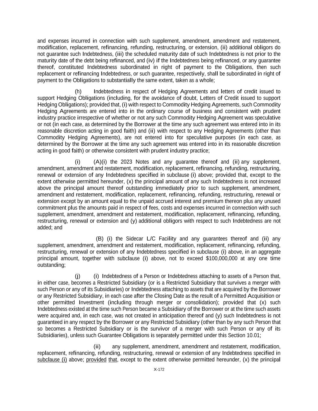 X-172 and expenses incurred in connection with such supplement, amendment, amendment and restatement, modification, replacement, refinancing, refunding, restructuring, or extension, (ii) additional obligors do not guarantee such Indebtedness, (iii) the scheduled maturity date of such Indebtedness is not prior to the maturity date of the debt being refinanced, and (iv) if the Indebtedness being refinanced, or any guarantee thereof, constituted Indebtedness subordinated in right of payment to the Obligations, then such replacement or refinancing Indebtedness, or such guarantee, respectively, shall be subordinated in right of payment to the Obligations to substantially the same extent, taken as a whole; (h) Indebtedness in respect of Hedging Agreements and letters of credit issued to support Hedging Obligations (including, for the avoidance of doubt, Letters of Credit issued to support Hedging Obligations); provided that, (i) with respect to Commodity Hedging Agreements, such Commodity Hedging Agreements are entered into in the ordinary course of business and consistent with prudent industry practice irrespective of whether or not any such Commodity Hedging Agreement was speculative or not (in each case, as determined by the Borrower at the time any such agreement was entered into in its reasonable discretion acting in good faith) and (ii) with respect to any Hedging Agreements (other than Commodity Hedging Agreements), are not entered into for speculative purposes (in each case, as determined by the Borrower at the time any such agreement was entered into in its reasonable discretion acting in good faith) or otherwise consistent with prudent industry practice; (i) (A)(i) the 2023 Notes and any guarantee thereof and (ii) any supplement, amendment, amendment and restatement, modification, replacement, refinancing, refunding, restructuring, renewal or extension of any Indebtedness specified in subclause (i) above; provided that, except to the extent otherwise permitted hereunder, (x) the principal amount of any such Indebtedness is not increased above the principal amount thereof outstanding immediately prior to such supplement, amendment, amendment and restatement, modification, replacement, refinancing, refunding, restructuring, renewal or extension except by an amount equal to the unpaid accrued interest and premium thereon plus any unused commitment plus the amounts paid in respect of fees, costs and expenses incurred in connection with such supplement, amendment, amendment and restatement, modification, replacement, refinancing, refunding, restructuring, renewal or extension and (y) additional obligors with respect to such Indebtedness are not added; and (B) (i) the Sidecar L/C Facility and any guarantees thereof and (ii) any supplement, amendment, amendment and restatement, modification, replacement, refinancing, refunding, restructuring, renewal or extension of any Indebtedness specified in subclause (i) above, in an aggregate principal amount, together with subclause (i) above, not to exceed $100,000,000 at any one time outstanding; (j) (i) Indebtedness of a Person or Indebtedness attaching to assets of a Person that, in either case, becomes a Restricted Subsidiary (or is a Restricted Subsidiary that survives a merger with such Person or any of its Subsidiaries) or Indebtedness attaching to assets that are acquired by the Borrower or any Restricted Subsidiary, in each case after the Closing Date as the result of a Permitted Acquisition or other permitted Investment (including through merger or consolidation); provided that (x) such Indebtedness existed at the time such Person became a Subsidiary of the Borrower or at the time such assets were acquired and, in each case, was not created in anticipation thereof and (y) such Indebtedness is not guaranteed in any respect by the Borrower or any Restricted Subsidiary (other than by any such Person that so becomes a Restricted Subsidiary or is the survivor of a merger with such Person or any of its Subsidiaries), unless such Guarantee Obligations is separately permitted under this Section 10.01; (ii) any supplement, amendment, amendment and restatement, modification, replacement, refinancing, refunding, restructuring, renewal or extension of any Indebtedness specified in subclause (i) above; provided that, except to the extent otherwise permitted hereunder, (x) the principal