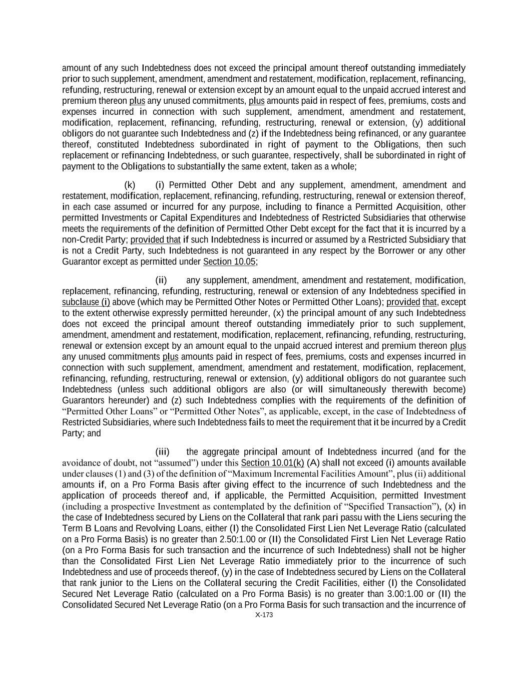 X-173 amount of any such Indebtedness does not exceed the principal amount thereof outstanding immediately prior to such supplement, amendment, amendment and restatement, modification, replacement, refinancing, refunding, restructuring, renewal or extension except by an amount equal to the unpaid accrued interest and premium thereon plus any unused commitments, plus amounts paid in respect of fees, premiums, costs and expenses incurred in connection with such supplement, amendment, amendment and restatement, modification, replacement, refinancing, refunding, restructuring, renewal or extension, (y) additional obligors do not guarantee such Indebtedness and (z) if the Indebtedness being refinanced, or any guarantee thereof, constituted Indebtedness subordinated in right of payment to the Obligations, then such replacement or refinancing Indebtedness, or such guarantee, respectively, shall be subordinated in right of payment to the Obligations to substantially the same extent, taken as a whole; (k) (i) Permitted Other Debt and any supplement, amendment, amendment and restatement, modification, replacement, refinancing, refunding, restructuring, renewal or extension thereof, in each case assumed or incurred for any purpose, including to finance a Permitted Acquisition, other permitted Investments or Capital Expenditures and Indebtedness of Restricted Subsidiaries that otherwise meets the requirements of the definition of Permitted Other Debt except for the fact that it is incurred by a non-Credit Party; provided that if such Indebtedness is incurred or assumed by a Restricted Subsidiary that is not a Credit Party, such Indebtedness is not guaranteed in any respect by the Borrower or any other Guarantor except as permitted under Section 10.05; (ii) any supplement, amendment, amendment and restatement, modification, replacement, refinancing, refunding, restructuring, renewal or extension of any Indebtedness specified in subclause (i) above (which may be Permitted Other Notes or Permitted Other Loans); provided that, except to the extent otherwise expressly permitted hereunder, (x) the principal amount of any such Indebtedness does not exceed the principal amount thereof outstanding immediately prior to such supplement, amendment, amendment and restatement, modification, replacement, refinancing, refunding, restructuring, renewal or extension except by an amount equal to the unpaid accrued interest and premium thereon plus any unused commitments plus amounts paid in respect of fees, premiums, costs and expenses incurred in connection with such supplement, amendment, amendment and restatement, modification, replacement, refinancing, refunding, restructuring, renewal or extension, (y) additional obligors do not guarantee such Indebtedness (unless such additional obligors are also (or will simultaneously therewith become) Guarantors hereunder) and (z) such Indebtedness complies with the requirements of the definition of “Permitted Other Loans” or “Permitted Other Notes”, as applicable, except, in the case of Indebtedness of Restricted Subsidiaries, where such Indebtedness fails to meet the requirement that it be incurred by a Credit Party; and (iii) the aggregate principal amount of Indebtedness incurred (and for the avoidance of doubt, not “assumed”) under this Section 10.01(k) (A) shall not exceed (i) amounts available under clauses (1) and (3) of the definition of “Maximum Incremental Facilities Amount”, plus (ii) additional amounts if, on a Pro Forma Basis after giving effect to the incurrence of such Indebtedness and the application of proceeds thereof and, if applicable, the Permitted Acquisition, permitted Investment (including a prospective Investment as contemplated by the definition of “Specified Transaction”), (x) in the case of Indebtedness secured by Liens on the Collateral that rank pari passu with the Liens securing the Term B Loans and Revolving Loans, either (I) the Consolidated First Lien Net Leverage Ratio (calculated on a Pro Forma Basis) is no greater than 2.50:1.00 or (II) the Consolidated First Lien Net Leverage Ratio (on a Pro Forma Basis for such transaction and the incurrence of such Indebtedness) shall not be higher than the Consolidated First Lien Net Leverage Ratio immediately prior to the incurrence of such Indebtedness and use of proceeds thereof, (y) in the case of Indebtedness secured by Liens on the Collateral that rank junior to the Liens on the Collateral securing the Credit Facilities, either (I) the Consolidated Secured Net Leverage Ratio (calculated on a Pro Forma Basis) is no greater than 3.00:1.00 or (II) the Consolidated Secured Net Leverage Ratio (on a Pro Forma Basis for such transaction and the incurrence of