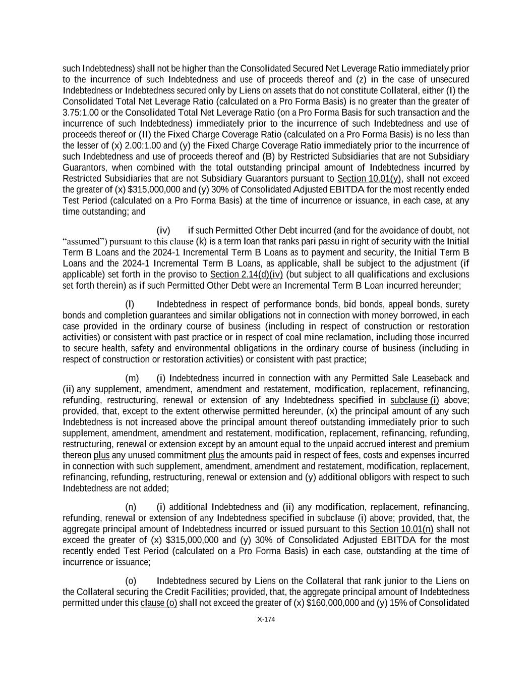X-174 such Indebtedness) shall not be higher than the Consolidated Secured Net Leverage Ratio immediately prior to the incurrence of such Indebtedness and use of proceeds thereof and (z) in the case of unsecured Indebtedness or Indebtedness secured only by Liens on assets that do not constitute Collateral, either (I) the Consolidated Total Net Leverage Ratio (calculated on a Pro Forma Basis) is no greater than the greater of 3.75:1.00 or the Consolidated Total Net Leverage Ratio (on a Pro Forma Basis for such transaction and the incurrence of such Indebtedness) immediately prior to the incurrence of such Indebtedness and use of proceeds thereof or (II) the Fixed Charge Coverage Ratio (calculated on a Pro Forma Basis) is no less than the lesser of (x) 2.00:1.00 and (y) the Fixed Charge Coverage Ratio immediately prior to the incurrence of such Indebtedness and use of proceeds thereof and (B) by Restricted Subsidiaries that are not Subsidiary Guarantors, when combined with the total outstanding principal amount of Indebtedness incurred by Restricted Subsidiaries that are not Subsidiary Guarantors pursuant to Section 10.01(y), shall not exceed the greater of (x) $315,000,000 and (y) 30% of Consolidated Adjusted EBITDA for the most recently ended Test Period (calculated on a Pro Forma Basis) at the time of incurrence or issuance, in each case, at any time outstanding; and (iv) if such Permitted Other Debt incurred (and for the avoidance of doubt, not “assumed”) pursuant to this clause (k) is a term loan that ranks pari passu in right of security with the Initial Term B Loans and the 2024-1 Incremental Term B Loans as to payment and security, the Initial Term B Loans and the 2024-1 Incremental Term B Loans, as applicable, shall be subject to the adjustment (if applicable) set forth in the proviso to Section 2.14(d)(iv) (but subject to all qualifications and exclusions set forth therein) as if such Permitted Other Debt were an Incremental Term B Loan incurred hereunder; (l) Indebtedness in respect of performance bonds, bid bonds, appeal bonds, surety bonds and completion guarantees and similar obligations not in connection with money borrowed, in each case provided in the ordinary course of business (including in respect of construction or restoration activities) or consistent with past practice or in respect of coal mine reclamation, including those incurred to secure health, safety and environmental obligations in the ordinary course of business (including in respect of construction or restoration activities) or consistent with past practice; (m) (i) Indebtedness incurred in connection with any Permitted Sale Leaseback and (ii) any supplement, amendment, amendment and restatement, modification, replacement, refinancing, refunding, restructuring, renewal or extension of any Indebtedness specified in subclause (i) above; provided, that, except to the extent otherwise permitted hereunder, (x) the principal amount of any such Indebtedness is not increased above the principal amount thereof outstanding immediately prior to such supplement, amendment, amendment and restatement, modification, replacement, refinancing, refunding, restructuring, renewal or extension except by an amount equal to the unpaid accrued interest and premium thereon plus any unused commitment plus the amounts paid in respect of fees, costs and expenses incurred in connection with such supplement, amendment, amendment and restatement, modification, replacement, refinancing, refunding, restructuring, renewal or extension and (y) additional obligors with respect to such Indebtedness are not added; (n) (i) additional Indebtedness and (ii) any modification, replacement, refinancing, refunding, renewal or extension of any Indebtedness specified in subclause (i) above; provided, that, the aggregate principal amount of Indebtedness incurred or issued pursuant to this Section 10.01(n) shall not exceed the greater of (x) $315,000,000 and (y) 30% of Consolidated Adjusted EBITDA for the most recently ended Test Period (calculated on a Pro Forma Basis) in each case, outstanding at the time of incurrence or issuance; (o) Indebtedness secured by Liens on the Collateral that rank junior to the Liens on the Collateral securing the Credit Facilities; provided, that, the aggregate principal amount of Indebtedness permitted under this clause (o) shall not exceed the greater of (x) $160,000,000 and (y) 15% of Consolidated