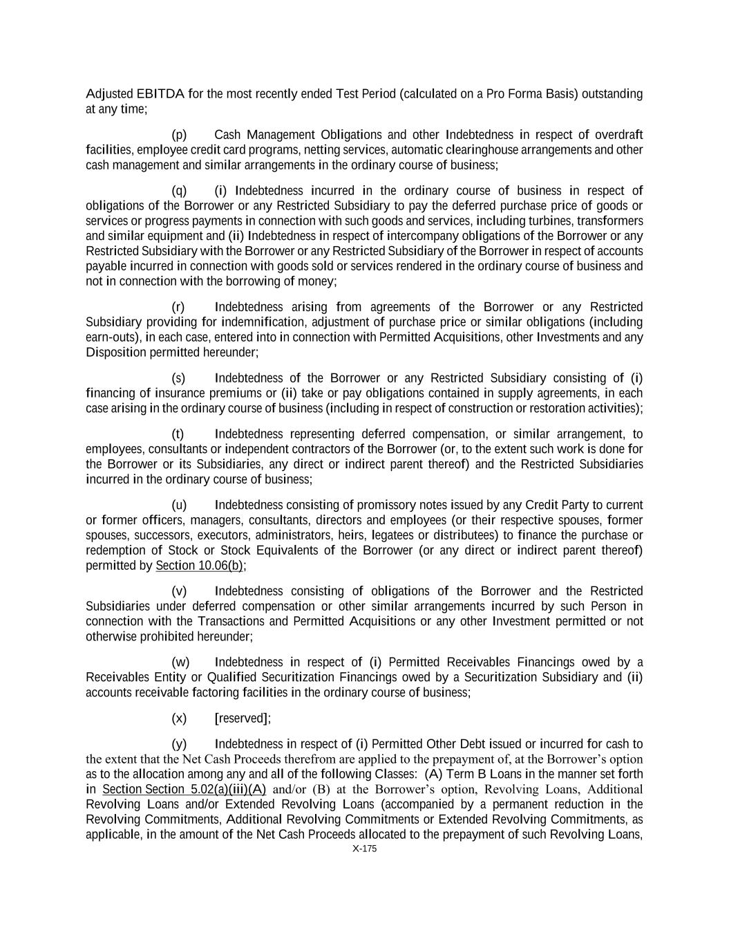 X-175 Adjusted EBITDA for the most recently ended Test Period (calculated on a Pro Forma Basis) outstanding at any time; (p) Cash Management Obligations and other Indebtedness in respect of overdraft facilities, employee credit card programs, netting services, automatic clearinghouse arrangements and other cash management and similar arrangements in the ordinary course of business; (q) (i) Indebtedness incurred in the ordinary course of business in respect of obligations of the Borrower or any Restricted Subsidiary to pay the deferred purchase price of goods or services or progress payments in connection with such goods and services, including turbines, transformers and similar equipment and (ii) Indebtedness in respect of intercompany obligations of the Borrower or any Restricted Subsidiary with the Borrower or any Restricted Subsidiary of the Borrower in respect of accounts payable incurred in connection with goods sold or services rendered in the ordinary course of business and not in connection with the borrowing of money; (r) Indebtedness arising from agreements of the Borrower or any Restricted Subsidiary providing for indemnification, adjustment of purchase price or similar obligations (including earn-outs), in each case, entered into in connection with Permitted Acquisitions, other Investments and any Disposition permitted hereunder; (s) Indebtedness of the Borrower or any Restricted Subsidiary consisting of (i) financing of insurance premiums or (ii) take or pay obligations contained in supply agreements, in each case arising in the ordinary course of business (including in respect of construction or restoration activities); (t) Indebtedness representing deferred compensation, or similar arrangement, to employees, consultants or independent contractors of the Borrower (or, to the extent such work is done for the Borrower or its Subsidiaries, any direct or indirect parent thereof) and the Restricted Subsidiaries incurred in the ordinary course of business; (u) Indebtedness consisting of promissory notes issued by any Credit Party to current or former officers, managers, consultants, directors and employees (or their respective spouses, former spouses, successors, executors, administrators, heirs, legatees or distributees) to finance the purchase or redemption of Stock or Stock Equivalents of the Borrower (or any direct or indirect parent thereof) permitted by Section 10.06(b); (v) Indebtedness consisting of obligations of the Borrower and the Restricted Subsidiaries under deferred compensation or other similar arrangements incurred by such Person in connection with the Transactions and Permitted Acquisitions or any other Investment permitted or not otherwise prohibited hereunder; (w) Indebtedness in respect of (i) Permitted Receivables Financings owed by a Receivables Entity or Qualified Securitization Financings owed by a Securitization Subsidiary and (ii) accounts receivable factoring facilities in the ordinary course of business; (x) [reserved]; (y) Indebtedness in respect of (i) Permitted Other Debt issued or incurred for cash to the extent that the Net Cash Proceeds therefrom are applied to the prepayment of, at the Borrower’s option as to the allocation among any and all of the following Classes: (A) Term B Loans in the manner set forth in Section Section 5.02(a)(iii)(A) and/or (B) at the Borrower’s option, Revolving Loans, Additional Revolving Loans and/or Extended Revolving Loans (accompanied by a permanent reduction in the Revolving Commitments, Additional Revolving Commitments or Extended Revolving Commitments, as applicable, in the amount of the Net Cash Proceeds allocated to the prepayment of such Revolving Loans,