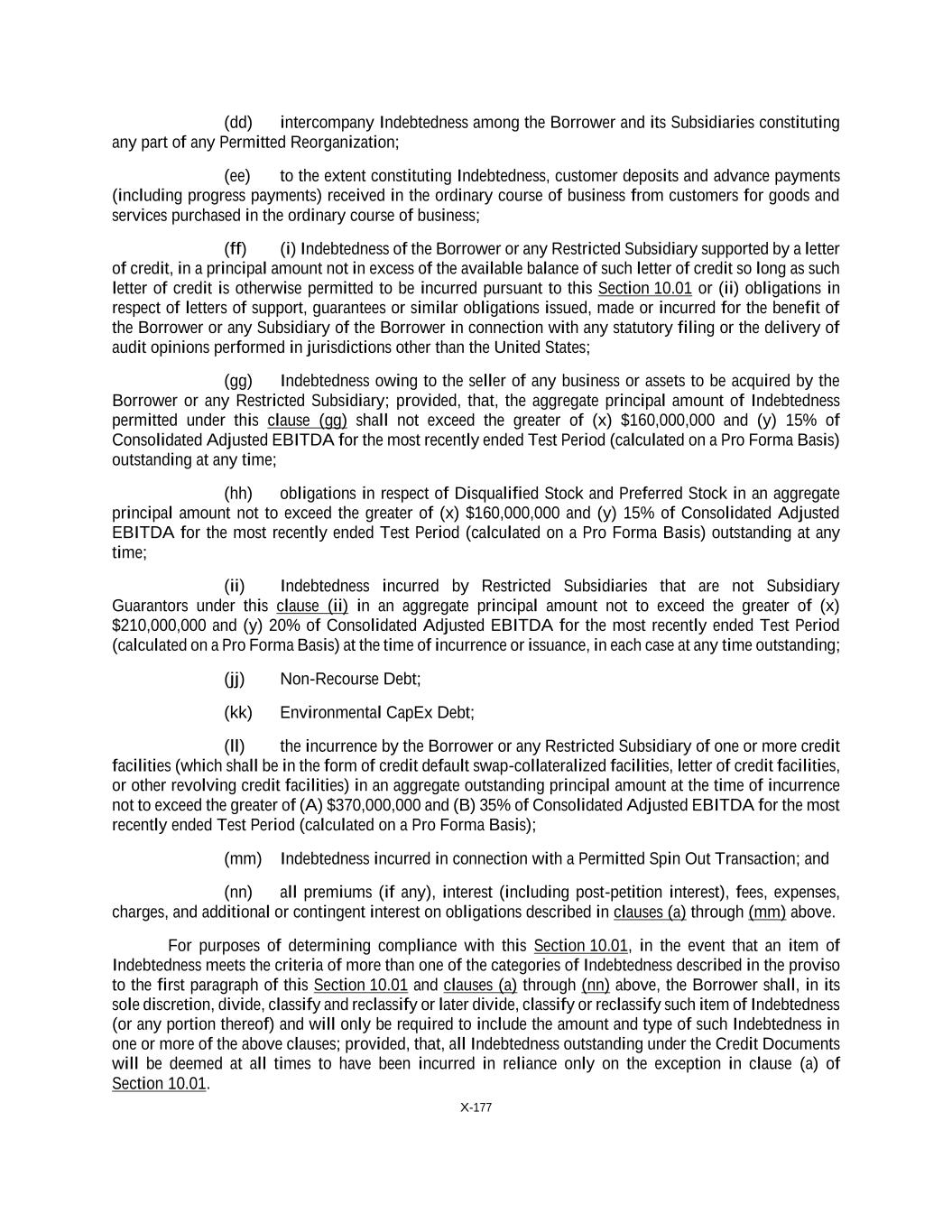 X-177 (dd) intercompany Indebtedness among the Borrower and its Subsidiaries constituting any part of any Permitted Reorganization; (ee) to the extent constituting Indebtedness, customer deposits and advance payments (including progress payments) received in the ordinary course of business from customers for goods and services purchased in the ordinary course of business; (ff) (i) Indebtedness of the Borrower or any Restricted Subsidiary supported by a letter of credit, in a principal amount not in excess of the available balance of such letter of credit so long as such letter of credit is otherwise permitted to be incurred pursuant to this Section 10.01 or (ii) obligations in respect of letters of support, guarantees or similar obligations issued, made or incurred for the benefit of the Borrower or any Subsidiary of the Borrower in connection with any statutory filing or the delivery of audit opinions performed in jurisdictions other than the United States; (gg) Indebtedness owing to the seller of any business or assets to be acquired by the Borrower or any Restricted Subsidiary; provided, that, the aggregate principal amount of Indebtedness permitted under this clause (gg) shall not exceed the greater of (x) $160,000,000 and (y) 15% of Consolidated Adjusted EBITDA for the most recently ended Test Period (calculated on a Pro Forma Basis) outstanding at any time; (hh) obligations in respect of Disqualified Stock and Preferred Stock in an aggregate principal amount not to exceed the greater of (x) $160,000,000 and (y) 15% of Consolidated Adjusted EBITDA for the most recently ended Test Period (calculated on a Pro Forma Basis) outstanding at any time; (ii) Indebtedness incurred by Restricted Subsidiaries that are not Subsidiary Guarantors under this clause (ii) in an aggregate principal amount not to exceed the greater of (x) $210,000,000 and (y) 20% of Consolidated Adjusted EBITDA for the most recently ended Test Period (calculated on a Pro Forma Basis) at the time of incurrence or issuance, in each case at any time outstanding; (jj) Non-Recourse Debt; (kk) Environmental CapEx Debt; (ll) the incurrence by the Borrower or any Restricted Subsidiary of one or more credit facilities (which shall be in the form of credit default swap-collateralized facilities, letter of credit facilities, or other revolving credit facilities) in an aggregate outstanding principal amount at the time of incurrence not to exceed the greater of (A) $370,000,000 and (B) 35% of Consolidated Adjusted EBITDA for the most recently ended Test Period (calculated on a Pro Forma Basis); (mm) Indebtedness incurred in connection with a Permitted Spin Out Transaction; and (nn) all premiums (if any), interest (including post-petition interest), fees, expenses, charges, and additional or contingent interest on obligations described in clauses (a) through (mm) above. For purposes of determining compliance with this Section 10.01, in the event that an item of Indebtedness meets the criteria of more than one of the categories of Indebtedness described in the proviso to the first paragraph of this Section 10.01 and clauses (a) through (nn) above, the Borrower shall, in its sole discretion, divide, classify and reclassify or later divide, classify or reclassify such item of Indebtedness (or any portion thereof) and will only be required to include the amount and type of such Indebtedness in one or more of the above clauses; provided, that, all Indebtedness outstanding under the Credit Documents will be deemed at all times to have been incurred in reliance only on the exception in clause (a) of Section 10.01.
