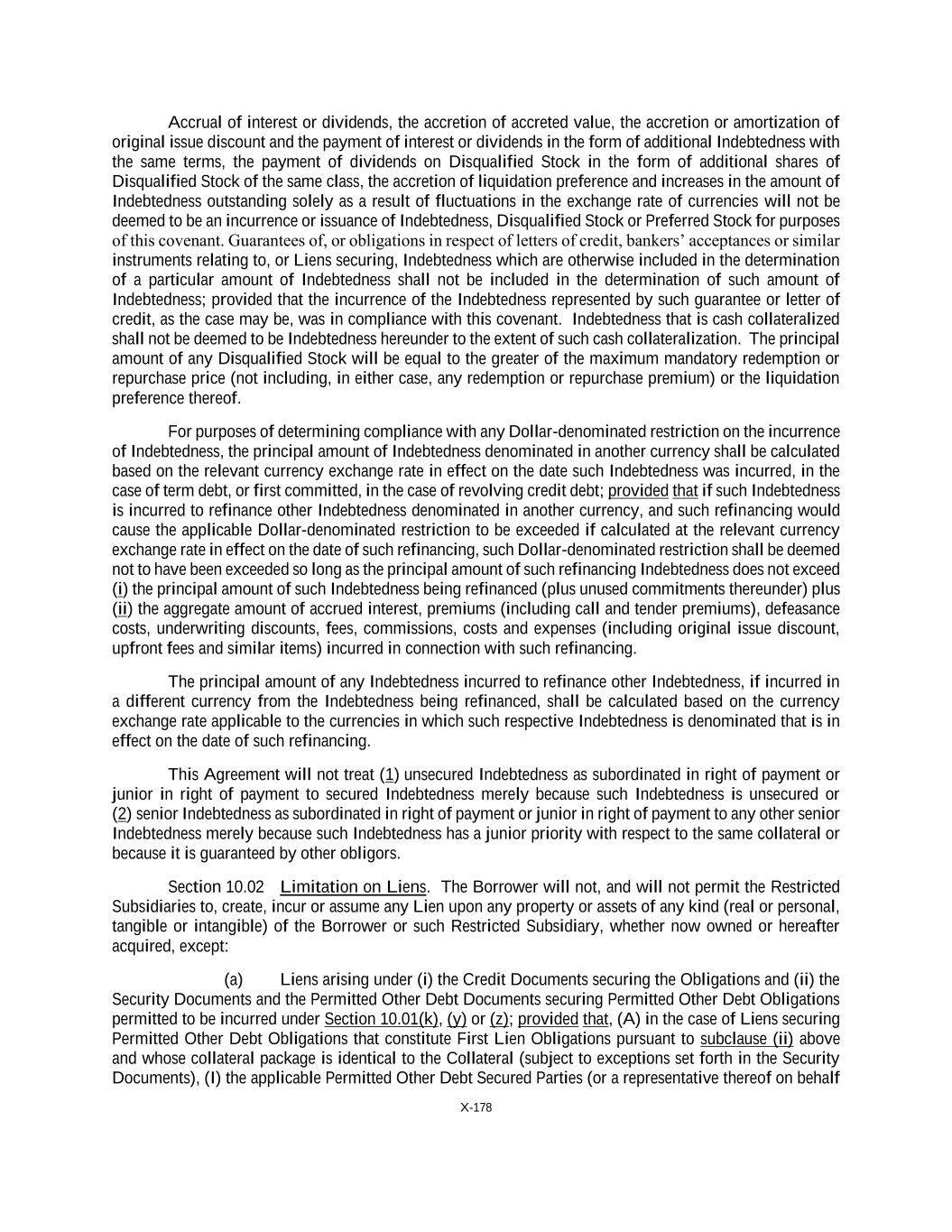 X-178 Accrual of interest or dividends, the accretion of accreted value, the accretion or amortization of original issue discount and the payment of interest or dividends in the form of additional Indebtedness with the same terms, the payment of dividends on Disqualified Stock in the form of additional shares of Disqualified Stock of the same class, the accretion of liquidation preference and increases in the amount of Indebtedness outstanding solely as a result of fluctuations in the exchange rate of currencies will not be deemed to be an incurrence or issuance of Indebtedness, Disqualified Stock or Preferred Stock for purposes of this covenant. Guarantees of, or obligations in respect of letters of credit, bankers’ acceptances or similar instruments relating to, or Liens securing, Indebtedness which are otherwise included in the determination of a particular amount of Indebtedness shall not be included in the determination of such amount of Indebtedness; provided that the incurrence of the Indebtedness represented by such guarantee or letter of credit, as the case may be, was in compliance with this covenant. Indebtedness that is cash collateralized shall not be deemed to be Indebtedness hereunder to the extent of such cash collateralization. The principal amount of any Disqualified Stock will be equal to the greater of the maximum mandatory redemption or repurchase price (not including, in either case, any redemption or repurchase premium) or the liquidation preference thereof. For purposes of determining compliance with any Dollar-denominated restriction on the incurrence of Indebtedness, the principal amount of Indebtedness denominated in another currency shall be calculated based on the relevant currency exchange rate in effect on the date such Indebtedness was incurred, in the case of term debt, or first committed, in the case of revolving credit debt; provided that if such Indebtedness is incurred to refinance other Indebtedness denominated in another currency, and such refinancing would cause the applicable Dollar-denominated restriction to be exceeded if calculated at the relevant currency exchange rate in effect on the date of such refinancing, such Dollar-denominated restriction shall be deemed not to have been exceeded so long as the principal amount of such refinancing Indebtedness does not exceed (i) the principal amount of such Indebtedness being refinanced (plus unused commitments thereunder) plus (ii) the aggregate amount of accrued interest, premiums (including call and tender premiums), defeasance costs, underwriting discounts, fees, commissions, costs and expenses (including original issue discount, upfront fees and similar items) incurred in connection with such refinancing. The principal amount of any Indebtedness incurred to refinance other Indebtedness, if incurred in a different currency from the Indebtedness being refinanced, shall be calculated based on the currency exchange rate applicable to the currencies in which such respective Indebtedness is denominated that is in effect on the date of such refinancing. This Agreement will not treat (1) unsecured Indebtedness as subordinated in right of payment or junior in right of payment to secured Indebtedness merely because such Indebtedness is unsecured or (2) senior Indebtedness as subordinated in right of payment or junior in right of payment to any other senior Indebtedness merely because such Indebtedness has a junior priority with respect to the same collateral or because it is guaranteed by other obligors. Section 10.02 Limitation on Liens. The Borrower will not, and will not permit the Restricted Subsidiaries to, create, incur or assume any Lien upon any property or assets of any kind (real or personal, tangible or intangible) of the Borrower or such Restricted Subsidiary, whether now owned or hereafter acquired, except: (a) Liens arising under (i) the Credit Documents securing the Obligations and (ii) the Security Documents and the Permitted Other Debt Documents securing Permitted Other Debt Obligations permitted to be incurred under Section 10.01(k), (y) or (z); provided that, (A) in the case of Liens securing Permitted Other Debt Obligations that constitute First Lien Obligations pursuant to subclause (ii) above and whose collateral package is identical to the Collateral (subject to exceptions set forth in the Security Documents), (I) the applicable Permitted Other Debt Secured Parties (or a representative thereof on behalf