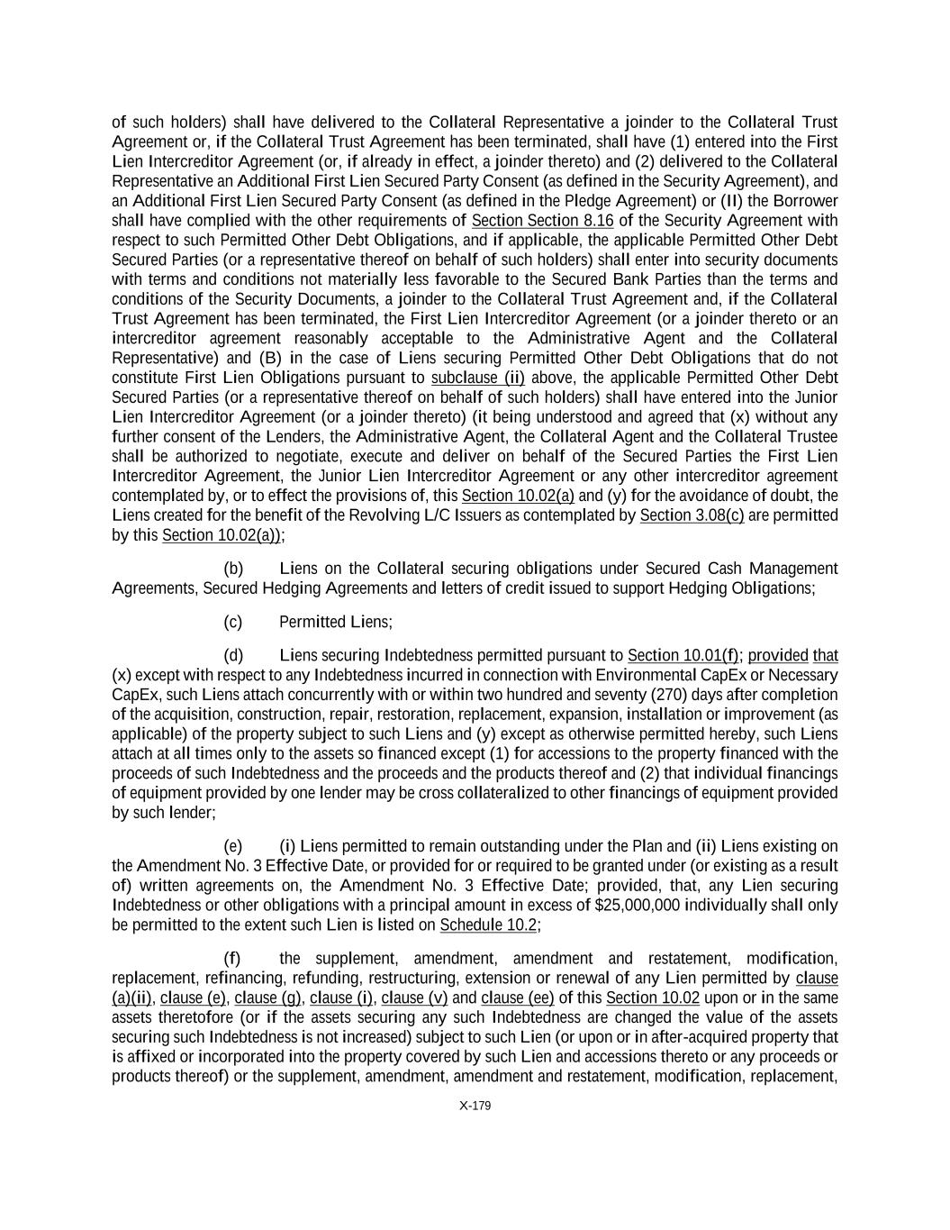 X-179 of such holders) shall have delivered to the Collateral Representative a joinder to the Collateral Trust Agreement or, if the Collateral Trust Agreement has been terminated, shall have (1) entered into the First Lien Intercreditor Agreement (or, if already in effect, a joinder thereto) and (2) delivered to the Collateral Representative an Additional First Lien Secured Party Consent (as defined in the Security Agreement), and an Additional First Lien Secured Party Consent (as defined in the Pledge Agreement) or (II) the Borrower shall have complied with the other requirements of Section Section 8.16 of the Security Agreement with respect to such Permitted Other Debt Obligations, and if applicable, the applicable Permitted Other Debt Secured Parties (or a representative thereof on behalf of such holders) shall enter into security documents with terms and conditions not materially less favorable to the Secured Bank Parties than the terms and conditions of the Security Documents, a joinder to the Collateral Trust Agreement and, if the Collateral Trust Agreement has been terminated, the First Lien Intercreditor Agreement (or a joinder thereto or an intercreditor agreement reasonably acceptable to the Administrative Agent and the Collateral Representative) and (B) in the case of Liens securing Permitted Other Debt Obligations that do not constitute First Lien Obligations pursuant to subclause (ii) above, the applicable Permitted Other Debt Secured Parties (or a representative thereof on behalf of such holders) shall have entered into the Junior Lien Intercreditor Agreement (or a joinder thereto) (it being understood and agreed that (x) without any further consent of the Lenders, the Administrative Agent, the Collateral Agent and the Collateral Trustee shall be authorized to negotiate, execute and deliver on behalf of the Secured Parties the First Lien Intercreditor Agreement, the Junior Lien Intercreditor Agreement or any other intercreditor agreement contemplated by, or to effect the provisions of, this Section 10.02(a) and (y) for the avoidance of doubt, the Liens created for the benefit of the Revolving L/C Issuers as contemplated by Section 3.08(c) are permitted by this Section 10.02(a)); (b) Liens on the Collateral securing obligations under Secured Cash Management Agreements, Secured Hedging Agreements and letters of credit issued to support Hedging Obligations; (c) Permitted Liens; (d) Liens securing Indebtedness permitted pursuant to Section 10.01(f); provided that (x) except with respect to any Indebtedness incurred in connection with Environmental CapEx or Necessary CapEx, such Liens attach concurrently with or within two hundred and seventy (270) days after completion of the acquisition, construction, repair, restoration, replacement, expansion, installation or improvement (as applicable) of the property subject to such Liens and (y) except as otherwise permitted hereby, such Liens attach at all times only to the assets so financed except (1) for accessions to the property financed with the proceeds of such Indebtedness and the proceeds and the products thereof and (2) that individual financings of equipment provided by one lender may be cross collateralized to other financings of equipment provided by such lender; (e) (i) Liens permitted to remain outstanding under the Plan and (ii) Liens existing on the Amendment No. 3 Effective Date, or provided for or required to be granted under (or existing as a result of) written agreements on, the Amendment No. 3 Effective Date; provided, that, any Lien securing Indebtedness or other obligations with a principal amount in excess of $25,000,000 individually shall only be permitted to the extent such Lien is listed on Schedule 10.2; (f) the supplement, amendment, amendment and restatement, modification, replacement, refinancing, refunding, restructuring, extension or renewal of any Lien permitted by clause (a)(ii), clause (e), clause (g), clause (i), clause (v) and clause (ee) of this Section 10.02 upon or in the same assets theretofore (or if the assets securing any such Indebtedness are changed the value of the assets securing such Indebtedness is not increased) subject to such Lien (or upon or in after-acquired property that is affixed or incorporated into the property covered by such Lien and accessions thereto or any proceeds or products thereof) or the supplement, amendment, amendment and restatement, modification, replacement,