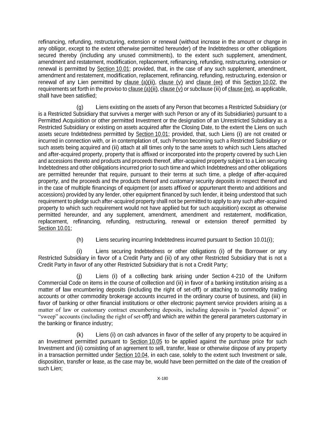 X-180 refinancing, refunding, restructuring, extension or renewal (without increase in the amount or change in any obligor, except to the extent otherwise permitted hereunder) of the Indebtedness or other obligations secured thereby (including any unused commitments), to the extent such supplement, amendment, amendment and restatement, modification, replacement, refinancing, refunding, restructuring, extension or renewal is permitted by Section 10.01; provided, that, in the case of any such supplement, amendment, amendment and restatement, modification, replacement, refinancing, refunding, restructuring, extension or renewal of any Lien permitted by clause (a)(ii), clause (v) and clause (ee) of this Section 10.02, the requirements set forth in the proviso to clause (a)(ii), clause (v) or subclause (ii) of clause (ee), as applicable, shall have been satisfied; (g) Liens existing on the assets of any Person that becomes a Restricted Subsidiary (or is a Restricted Subsidiary that survives a merger with such Person or any of its Subsidiaries) pursuant to a Permitted Acquisition or other permitted Investment or the designation of an Unrestricted Subsidiary as a Restricted Subsidiary or existing on assets acquired after the Closing Date, to the extent the Liens on such assets secure Indebtedness permitted by Section 10.01; provided, that, such Liens (i) are not created or incurred in connection with, or in contemplation of, such Person becoming such a Restricted Subsidiary or such assets being acquired and (ii) attach at all times only to the same assets to which such Liens attached and after-acquired property, property that is affixed or incorporated into the property covered by such Lien and accessions thereto and products and proceeds thereof, after-acquired property subject to a Lien securing Indebtedness and other obligations incurred prior to such time and which Indebtedness and other obligations are permitted hereunder that require, pursuant to their terms at such time, a pledge of after-acquired property, and the proceeds and the products thereof and customary security deposits in respect thereof and in the case of multiple financings of equipment (or assets affixed or appurtenant thereto and additions and accessions) provided by any lender, other equipment financed by such lender, it being understood that such requirement to pledge such after-acquired property shall not be permitted to apply to any such after-acquired property to which such requirement would not have applied but for such acquisition) except as otherwise permitted hereunder, and any supplement, amendment, amendment and restatement, modification, replacement, refinancing, refunding, restructuring, renewal or extension thereof permitted by Section 10.01; (h) Liens securing incurring Indebtedness incurred pursuant to Section 10.01(i); (i) Liens securing Indebtedness or other obligations (i) of the Borrower or any Restricted Subsidiary in favor of a Credit Party and (ii) of any other Restricted Subsidiary that is not a Credit Party in favor of any other Restricted Subsidiary that is not a Credit Party; (j) Liens (i) of a collecting bank arising under Section 4-210 of the Uniform Commercial Code on items in the course of collection and (ii) in favor of a banking institution arising as a matter of law encumbering deposits (including the right of set-off) or attaching to commodity trading accounts or other commodity brokerage accounts incurred in the ordinary course of business, and (iii) in favor of banking or other financial institutions or other electronic payment service providers arising as a matter of law or customary contract encumbering deposits, including deposits in “pooled deposit” or “sweep” accounts (including the right of set-off) and which are within the general parameters customary in the banking or finance industry; (k) Liens (i) on cash advances in favor of the seller of any property to be acquired in an Investment permitted pursuant to Section 10.05 to be applied against the purchase price for such Investment and (ii) consisting of an agreement to sell, transfer, lease or otherwise dispose of any property in a transaction permitted under Section 10.04, in each case, solely to the extent such Investment or sale, disposition, transfer or lease, as the case may be, would have been permitted on the date of the creation of such Lien;