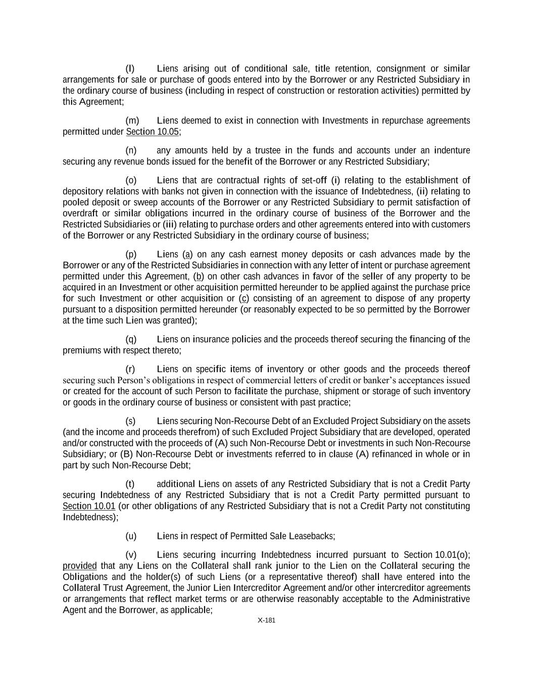 X-181 (l) Liens arising out of conditional sale, title retention, consignment or similar arrangements for sale or purchase of goods entered into by the Borrower or any Restricted Subsidiary in the ordinary course of business (including in respect of construction or restoration activities) permitted by this Agreement; (m) Liens deemed to exist in connection with Investments in repurchase agreements permitted under Section 10.05; (n) any amounts held by a trustee in the funds and accounts under an indenture securing any revenue bonds issued for the benefit of the Borrower or any Restricted Subsidiary; (o) Liens that are contractual rights of set-off (i) relating to the establishment of depository relations with banks not given in connection with the issuance of Indebtedness, (ii) relating to pooled deposit or sweep accounts of the Borrower or any Restricted Subsidiary to permit satisfaction of overdraft or similar obligations incurred in the ordinary course of business of the Borrower and the Restricted Subsidiaries or (iii) relating to purchase orders and other agreements entered into with customers of the Borrower or any Restricted Subsidiary in the ordinary course of business; (p) Liens (a) on any cash earnest money deposits or cash advances made by the Borrower or any of the Restricted Subsidiaries in connection with any letter of intent or purchase agreement permitted under this Agreement, (b) on other cash advances in favor of the seller of any property to be acquired in an Investment or other acquisition permitted hereunder to be applied against the purchase price for such Investment or other acquisition or (c) consisting of an agreement to dispose of any property pursuant to a disposition permitted hereunder (or reasonably expected to be so permitted by the Borrower at the time such Lien was granted); (q) Liens on insurance policies and the proceeds thereof securing the financing of the premiums with respect thereto; (r) Liens on specific items of inventory or other goods and the proceeds thereof securing such Person’s obligations in respect of commercial letters of credit or banker’s acceptances issued or created for the account of such Person to facilitate the purchase, shipment or storage of such inventory or goods in the ordinary course of business or consistent with past practice; (s) Liens securing Non-Recourse Debt of an Excluded Project Subsidiary on the assets (and the income and proceeds therefrom) of such Excluded Project Subsidiary that are developed, operated and/or constructed with the proceeds of (A) such Non-Recourse Debt or investments in such Non-Recourse Subsidiary; or (B) Non-Recourse Debt or investments referred to in clause (A) refinanced in whole or in part by such Non-Recourse Debt; (t) additional Liens on assets of any Restricted Subsidiary that is not a Credit Party securing Indebtedness of any Restricted Subsidiary that is not a Credit Party permitted pursuant to Section 10.01 (or other obligations of any Restricted Subsidiary that is not a Credit Party not constituting Indebtedness); (u) Liens in respect of Permitted Sale Leasebacks; (v) Liens securing incurring Indebtedness incurred pursuant to Section 10.01(o); provided that any Liens on the Collateral shall rank junior to the Lien on the Collateral securing the Obligations and the holder(s) of such Liens (or a representative thereof) shall have entered into the Collateral Trust Agreement, the Junior Lien Intercreditor Agreement and/or other intercreditor agreements or arrangements that reflect market terms or are otherwise reasonably acceptable to the Administrative Agent and the Borrower, as applicable;