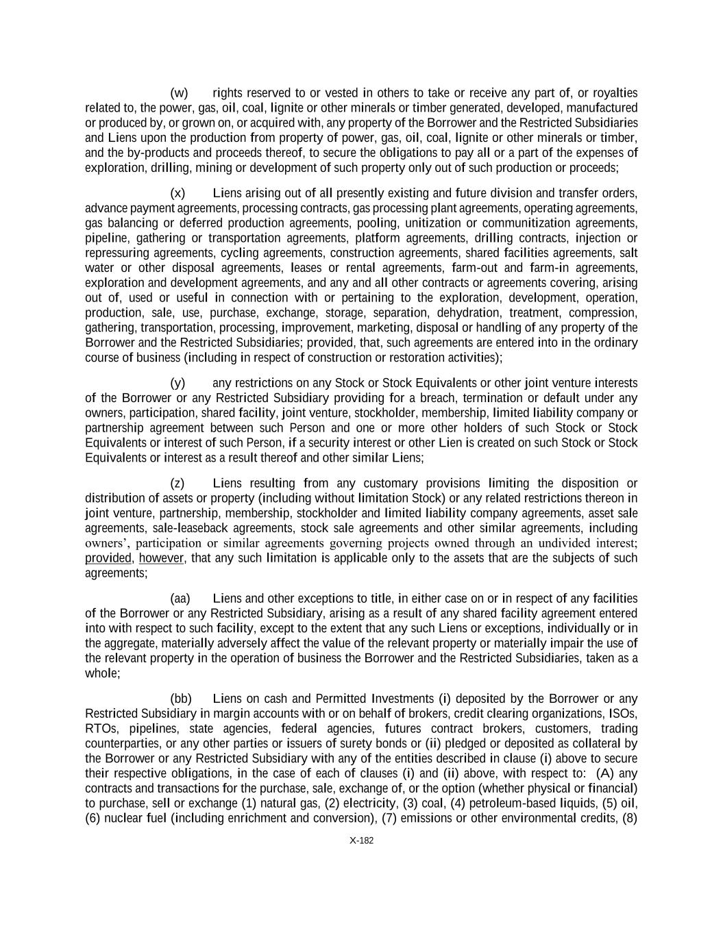 X-182 (w) rights reserved to or vested in others to take or receive any part of, or royalties related to, the power, gas, oil, coal, lignite or other minerals or timber generated, developed, manufactured or produced by, or grown on, or acquired with, any property of the Borrower and the Restricted Subsidiaries and Liens upon the production from property of power, gas, oil, coal, lignite or other minerals or timber, and the by-products and proceeds thereof, to secure the obligations to pay all or a part of the expenses of exploration, drilling, mining or development of such property only out of such production or proceeds; (x) Liens arising out of all presently existing and future division and transfer orders, advance payment agreements, processing contracts, gas processing plant agreements, operating agreements, gas balancing or deferred production agreements, pooling, unitization or communitization agreements, pipeline, gathering or transportation agreements, platform agreements, drilling contracts, injection or repressuring agreements, cycling agreements, construction agreements, shared facilities agreements, salt water or other disposal agreements, leases or rental agreements, farm-out and farm-in agreements, exploration and development agreements, and any and all other contracts or agreements covering, arising out of, used or useful in connection with or pertaining to the exploration, development, operation, production, sale, use, purchase, exchange, storage, separation, dehydration, treatment, compression, gathering, transportation, processing, improvement, marketing, disposal or handling of any property of the Borrower and the Restricted Subsidiaries; provided, that, such agreements are entered into in the ordinary course of business (including in respect of construction or restoration activities); (y) any restrictions on any Stock or Stock Equivalents or other joint venture interests of the Borrower or any Restricted Subsidiary providing for a breach, termination or default under any owners, participation, shared facility, joint venture, stockholder, membership, limited liability company or partnership agreement between such Person and one or more other holders of such Stock or Stock Equivalents or interest of such Person, if a security interest or other Lien is created on such Stock or Stock Equivalents or interest as a result thereof and other similar Liens; (z) Liens resulting from any customary provisions limiting the disposition or distribution of assets or property (including without limitation Stock) or any related restrictions thereon in joint venture, partnership, membership, stockholder and limited liability company agreements, asset sale agreements, sale-leaseback agreements, stock sale agreements and other similar agreements, including owners’, participation or similar agreements governing projects owned through an undivided interest; provided, however, that any such limitation is applicable only to the assets that are the subjects of such agreements; (aa) Liens and other exceptions to title, in either case on or in respect of any facilities of the Borrower or any Restricted Subsidiary, arising as a result of any shared facility agreement entered into with respect to such facility, except to the extent that any such Liens or exceptions, individually or in the aggregate, materially adversely affect the value of the relevant property or materially impair the use of the relevant property in the operation of business the Borrower and the Restricted Subsidiaries, taken as a whole; (bb) Liens on cash and Permitted Investments (i) deposited by the Borrower or any Restricted Subsidiary in margin accounts with or on behalf of brokers, credit clearing organizations, ISOs, RTOs, pipelines, state agencies, federal agencies, futures contract brokers, customers, trading counterparties, or any other parties or issuers of surety bonds or (ii) pledged or deposited as collateral by the Borrower or any Restricted Subsidiary with any of the entities described in clause (i) above to secure their respective obligations, in the case of each of clauses (i) and (ii) above, with respect to: (A) any contracts and transactions for the purchase, sale, exchange of, or the option (whether physical or financial) to purchase, sell or exchange (1) natural gas, (2) electricity, (3) coal, (4) petroleum-based liquids, (5) oil, (6) nuclear fuel (including enrichment and conversion), (7) emissions or other environmental credits, (8)