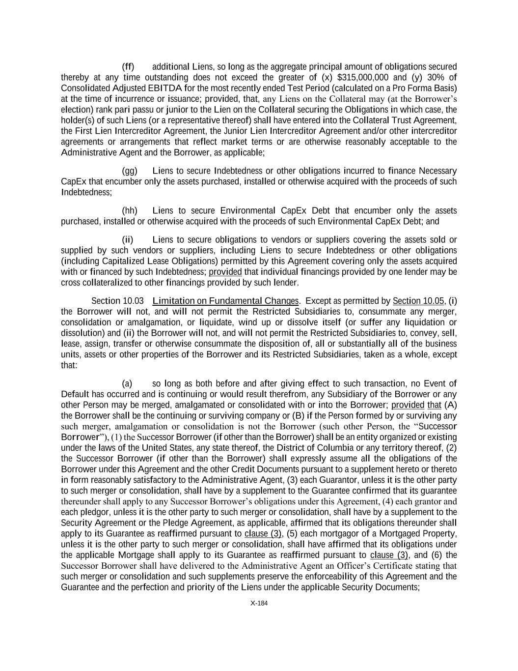 X-184 (ff) additional Liens, so long as the aggregate principal amount of obligations secured thereby at any time outstanding does not exceed the greater of (x) $315,000,000 and (y) 30% of Consolidated Adjusted EBITDA for the most recently ended Test Period (calculated on a Pro Forma Basis) at the time of incurrence or issuance; provided, that, any Liens on the Collateral may (at the Borrower’s election) rank pari passu or junior to the Lien on the Collateral securing the Obligations in which case, the holder(s) of such Liens (or a representative thereof) shall have entered into the Collateral Trust Agreement, the First Lien Intercreditor Agreement, the Junior Lien Intercreditor Agreement and/or other intercreditor agreements or arrangements that reflect market terms or are otherwise reasonably acceptable to the Administrative Agent and the Borrower, as applicable; (gg) Liens to secure Indebtedness or other obligations incurred to finance Necessary CapEx that encumber only the assets purchased, installed or otherwise acquired with the proceeds of such Indebtedness; (hh) Liens to secure Environmental CapEx Debt that encumber only the assets purchased, installed or otherwise acquired with the proceeds of such Environmental CapEx Debt; and (ii) Liens to secure obligations to vendors or suppliers covering the assets sold or supplied by such vendors or suppliers, including Liens to secure Indebtedness or other obligations (including Capitalized Lease Obligations) permitted by this Agreement covering only the assets acquired with or financed by such Indebtedness; provided that individual financings provided by one lender may be cross collateralized to other financings provided by such lender. Section 10.03 Limitation on Fundamental Changes. Except as permitted by Section 10.05, (i) the Borrower will not, and will not permit the Restricted Subsidiaries to, consummate any merger, consolidation or amalgamation, or liquidate, wind up or dissolve itself (or suffer any liquidation or dissolution) and (ii) the Borrower will not, and will not permit the Restricted Subsidiaries to, convey, sell, lease, assign, transfer or otherwise consummate the disposition of, all or substantially all of the business units, assets or other properties of the Borrower and its Restricted Subsidiaries, taken as a whole, except that: (a) so long as both before and after giving effect to such transaction, no Event of Default has occurred and is continuing or would result therefrom, any Subsidiary of the Borrower or any other Person may be merged, amalgamated or consolidated with or into the Borrower; provided that (A) the Borrower shall be the continuing or surviving company or (B) if the Person formed by or surviving any such merger, amalgamation or consolidation is not the Borrower (such other Person, the “Successor Borrower”), (1) the Successor Borrower (if other than the Borrower) shall be an entity organized or existing under the laws of the United States, any state thereof, the District of Columbia or any territory thereof, (2) the Successor Borrower (if other than the Borrower) shall expressly assume all the obligations of the Borrower under this Agreement and the other Credit Documents pursuant to a supplement hereto or thereto in form reasonably satisfactory to the Administrative Agent, (3) each Guarantor, unless it is the other party to such merger or consolidation, shall have by a supplement to the Guarantee confirmed that its guarantee thereunder shall apply to any Successor Borrower’s obligations under this Agreement, (4) each grantor and each pledgor, unless it is the other party to such merger or consolidation, shall have by a supplement to the Security Agreement or the Pledge Agreement, as applicable, affirmed that its obligations thereunder shall apply to its Guarantee as reaffirmed pursuant to clause (3), (5) each mortgagor of a Mortgaged Property, unless it is the other party to such merger or consolidation, shall have affirmed that its obligations under the applicable Mortgage shall apply to its Guarantee as reaffirmed pursuant to clause (3), and (6) the Successor Borrower shall have delivered to the Administrative Agent an Officer’s Certificate stating that such merger or consolidation and such supplements preserve the enforceability of this Agreement and the Guarantee and the perfection and priority of the Liens under the applicable Security Documents;