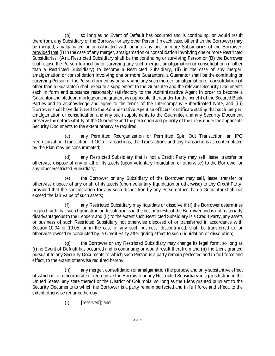 X-185 (b) so long as no Event of Default has occurred and is continuing, or would result therefrom, any Subsidiary of the Borrower or any other Person (in each case, other than the Borrower) may be merged, amalgamated or consolidated with or into any one or more Subsidiaries of the Borrower; provided that (i) in the case of any merger, amalgamation or consolidation involving one or more Restricted Subsidiaries, (A) a Restricted Subsidiary shall be the continuing or surviving Person or (B) the Borrower shall cause the Person formed by or surviving any such merger, amalgamation or consolidation (if other than a Restricted Subsidiary) to become a Restricted Subsidiary, (ii) in the case of any merger, amalgamation or consolidation involving one or more Guarantors, a Guarantor shall be the continuing or surviving Person or the Person formed by or surviving any such merger, amalgamation or consolidation (if other than a Guarantor) shall execute a supplement to the Guarantee and the relevant Security Documents each in form and substance reasonably satisfactory to the Administrative Agent in order to become a Guarantor and pledgor, mortgagor and grantor, as applicable, thereunder for the benefit of the Secured Bank Parties and to acknowledge and agree to the terms of the Intercompany Subordinated Note, and (iii) Borrower shall have delivered to the Administrative Agent an officers’ certificate stating that such merger, amalgamation or consolidation and any such supplements to the Guarantee and any Security Document preserve the enforceability of the Guarantee and the perfection and priority of the Liens under the applicable Security Documents to the extent otherwise required; (c) any Permitted Reorganization or Permitted Spin Out Transaction, an IPO Reorganization Transaction, IPOCo Transactions, the Transactions and any transactions as contemplated by the Plan may be consummated; (d) any Restricted Subsidiary that is not a Credit Party may sell, lease, transfer or otherwise dispose of any or all of its assets (upon voluntary liquidation or otherwise) to the Borrower or any other Restricted Subsidiary; (e) the Borrower or any Subsidiary of the Borrower may sell, lease, transfer or otherwise dispose of any or all of its assets (upon voluntary liquidation or otherwise) to any Credit Party; provided that the consideration for any such disposition by any Person other than a Guarantor shall not exceed the fair value of such assets; (f) any Restricted Subsidiary may liquidate or dissolve if (i) the Borrower determines in good faith that such liquidation or dissolution is in the best interests of the Borrower and is not materially disadvantageous to the Lenders and (ii) to the extent such Restricted Subsidiary is a Credit Party, any assets or business of such Restricted Subsidiary not otherwise disposed of or transferred in accordance with Section 10.04 or 10.05, or in the case of any such business, discontinued, shall be transferred to, or otherwise owned or conducted by, a Credit Party after giving effect to such liquidation or dissolution; (g) the Borrower or any Restricted Subsidiary may change its legal form, so long as (i) no Event of Default has occurred and is continuing or would result therefrom and (ii) the Liens granted pursuant to any Security Documents to which such Person is a party remain perfected and in full force and effect, to the extent otherwise required hereby; (h) any merger, consolidation or amalgamation the purpose and only substantive effect of which is to reincorporate or reorganize the Borrower or any Restricted Subsidiary in a jurisdiction in the United States, any state thereof or the District of Columbia, so long as the Liens granted pursuant to the Security Documents to which the Borrower is a party remain perfected and in full force and effect, to the extent otherwise required hereby; (i) [reserved]; and