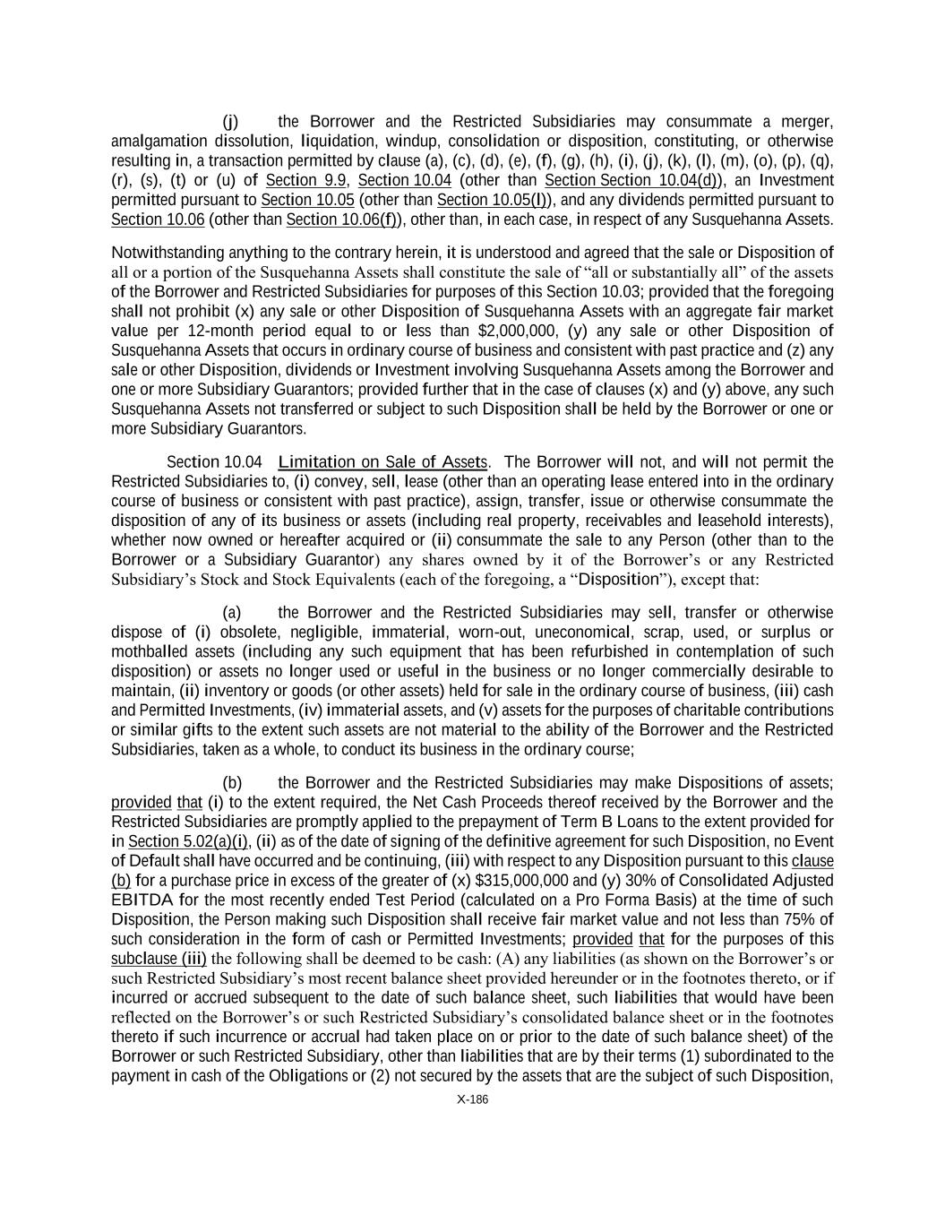 X-186 (j) the Borrower and the Restricted Subsidiaries may consummate a merger, amalgamation dissolution, liquidation, windup, consolidation or disposition, constituting, or otherwise resulting in, a transaction permitted by clause (a), (c), (d), (e), (f), (g), (h), (i), (j), (k), (l), (m), (o), (p), (q), (r), (s), (t) or (u) of Section 9.9, Section 10.04 (other than Section Section 10.04(d)), an Investment permitted pursuant to Section 10.05 (other than Section 10.05(l)), and any dividends permitted pursuant to Section 10.06 (other than Section 10.06(f)), other than, in each case, in respect of any Susquehanna Assets. Notwithstanding anything to the contrary herein, it is understood and agreed that the sale or Disposition of all or a portion of the Susquehanna Assets shall constitute the sale of “all or substantially all” of the assets of the Borrower and Restricted Subsidiaries for purposes of this Section 10.03; provided that the foregoing shall not prohibit (x) any sale or other Disposition of Susquehanna Assets with an aggregate fair market value per 12-month period equal to or less than $2,000,000, (y) any sale or other Disposition of Susquehanna Assets that occurs in ordinary course of business and consistent with past practice and (z) any sale or other Disposition, dividends or Investment involving Susquehanna Assets among the Borrower and one or more Subsidiary Guarantors; provided further that in the case of clauses (x) and (y) above, any such Susquehanna Assets not transferred or subject to such Disposition shall be held by the Borrower or one or more Subsidiary Guarantors. Section 10.04 Limitation on Sale of Assets. The Borrower will not, and will not permit the Restricted Subsidiaries to, (i) convey, sell, lease (other than an operating lease entered into in the ordinary course of business or consistent with past practice), assign, transfer, issue or otherwise consummate the disposition of any of its business or assets (including real property, receivables and leasehold interests), whether now owned or hereafter acquired or (ii) consummate the sale to any Person (other than to the Borrower or a Subsidiary Guarantor) any shares owned by it of the Borrower’s or any Restricted Subsidiary’s Stock and Stock Equivalents (each of the foregoing, a “Disposition”), except that: (a) the Borrower and the Restricted Subsidiaries may sell, transfer or otherwise dispose of (i) obsolete, negligible, immaterial, worn-out, uneconomical, scrap, used, or surplus or mothballed assets (including any such equipment that has been refurbished in contemplation of such disposition) or assets no longer used or useful in the business or no longer commercially desirable to maintain, (ii) inventory or goods (or other assets) held for sale in the ordinary course of business, (iii) cash and Permitted Investments, (iv) immaterial assets, and (v) assets for the purposes of charitable contributions or similar gifts to the extent such assets are not material to the ability of the Borrower and the Restricted Subsidiaries, taken as a whole, to conduct its business in the ordinary course; (b) the Borrower and the Restricted Subsidiaries may make Dispositions of assets; provided that (i) to the extent required, the Net Cash Proceeds thereof received by the Borrower and the Restricted Subsidiaries are promptly applied to the prepayment of Term B Loans to the extent provided for in Section 5.02(a)(i), (ii) as of the date of signing of the definitive agreement for such Disposition, no Event of Default shall have occurred and be continuing, (iii) with respect to any Disposition pursuant to this clause (b) for a purchase price in excess of the greater of (x) $315,000,000 and (y) 30% of Consolidated Adjusted EBITDA for the most recently ended Test Period (calculated on a Pro Forma Basis) at the time of such Disposition, the Person making such Disposition shall receive fair market value and not less than 75% of such consideration in the form of cash or Permitted Investments; provided that for the purposes of this subclause (iii) the following shall be deemed to be cash: (A) any liabilities (as shown on the Borrower’s or such Restricted Subsidiary’s most recent balance sheet provided hereunder or in the footnotes thereto, or if incurred or accrued subsequent to the date of such balance sheet, such liabilities that would have been reflected on the Borrower’s or such Restricted Subsidiary’s consolidated balance sheet or in the footnotes thereto if such incurrence or accrual had taken place on or prior to the date of such balance sheet) of the Borrower or such Restricted Subsidiary, other than liabilities that are by their terms (1) subordinated to the payment in cash of the Obligations or (2) not secured by the assets that are the subject of such Disposition,