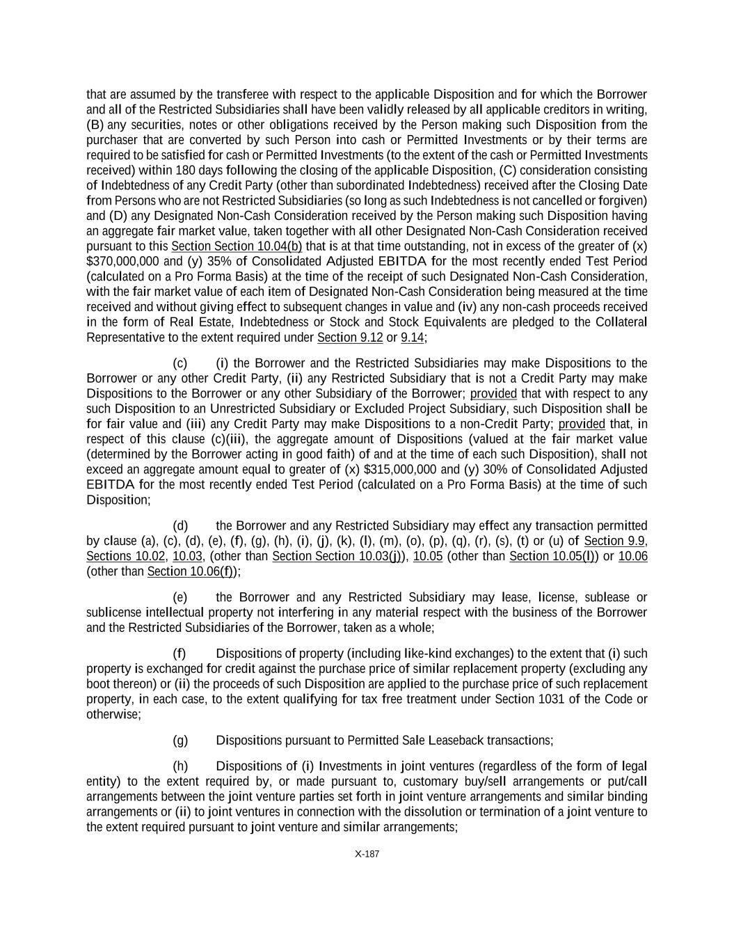 X-187 that are assumed by the transferee with respect to the applicable Disposition and for which the Borrower and all of the Restricted Subsidiaries shall have been validly released by all applicable creditors in writing, (B) any securities, notes or other obligations received by the Person making such Disposition from the purchaser that are converted by such Person into cash or Permitted Investments or by their terms are required to be satisfied for cash or Permitted Investments (to the extent of the cash or Permitted Investments received) within 180 days following the closing of the applicable Disposition, (C) consideration consisting of Indebtedness of any Credit Party (other than subordinated Indebtedness) received after the Closing Date from Persons who are not Restricted Subsidiaries (so long as such Indebtedness is not cancelled or forgiven) and (D) any Designated Non-Cash Consideration received by the Person making such Disposition having an aggregate fair market value, taken together with all other Designated Non-Cash Consideration received pursuant to this Section Section 10.04(b) that is at that time outstanding, not in excess of the greater of (x) $370,000,000 and (y) 35% of Consolidated Adjusted EBITDA for the most recently ended Test Period (calculated on a Pro Forma Basis) at the time of the receipt of such Designated Non-Cash Consideration, with the fair market value of each item of Designated Non-Cash Consideration being measured at the time received and without giving effect to subsequent changes in value and (iv) any non-cash proceeds received in the form of Real Estate, Indebtedness or Stock and Stock Equivalents are pledged to the Collateral Representative to the extent required under Section 9.12 or 9.14; (c) (i) the Borrower and the Restricted Subsidiaries may make Dispositions to the Borrower or any other Credit Party, (ii) any Restricted Subsidiary that is not a Credit Party may make Dispositions to the Borrower or any other Subsidiary of the Borrower; provided that with respect to any such Disposition to an Unrestricted Subsidiary or Excluded Project Subsidiary, such Disposition shall be for fair value and (iii) any Credit Party may make Dispositions to a non-Credit Party; provided that, in respect of this clause (c)(iii), the aggregate amount of Dispositions (valued at the fair market value (determined by the Borrower acting in good faith) of and at the time of each such Disposition), shall not exceed an aggregate amount equal to greater of (x) $315,000,000 and (y) 30% of Consolidated Adjusted EBITDA for the most recently ended Test Period (calculated on a Pro Forma Basis) at the time of such Disposition; (d) the Borrower and any Restricted Subsidiary may effect any transaction permitted by clause (a), (c), (d), (e), (f), (g), (h), (i), (j), (k), (l), (m), (o), (p), (q), (r), (s), (t) or (u) of Section 9.9, Sections 10.02, 10.03, (other than Section Section 10.03(j)), 10.05 (other than Section 10.05(l)) or 10.06 (other than Section 10.06(f)); (e) the Borrower and any Restricted Subsidiary may lease, license, sublease or sublicense intellectual property not interfering in any material respect with the business of the Borrower and the Restricted Subsidiaries of the Borrower, taken as a whole; (f) Dispositions of property (including like-kind exchanges) to the extent that (i) such property is exchanged for credit against the purchase price of similar replacement property (excluding any boot thereon) or (ii) the proceeds of such Disposition are applied to the purchase price of such replacement property, in each case, to the extent qualifying for tax free treatment under Section 1031 of the Code or otherwise; (g) Dispositions pursuant to Permitted Sale Leaseback transactions; (h) Dispositions of (i) Investments in joint ventures (regardless of the form of legal entity) to the extent required by, or made pursuant to, customary buy/sell arrangements or put/call arrangements between the joint venture parties set forth in joint venture arrangements and similar binding arrangements or (ii) to joint ventures in connection with the dissolution or termination of a joint venture to the extent required pursuant to joint venture and similar arrangements;
