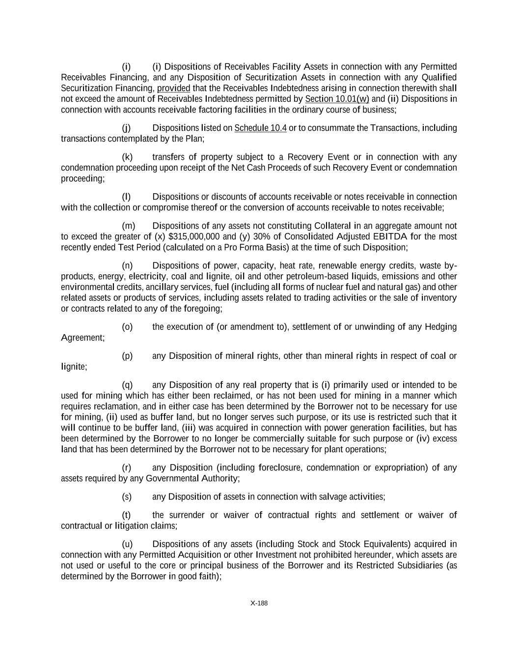 X-188 (i) (i) Dispositions of Receivables Facility Assets in connection with any Permitted Receivables Financing, and any Disposition of Securitization Assets in connection with any Qualified Securitization Financing, provided that the Receivables Indebtedness arising in connection therewith shall not exceed the amount of Receivables Indebtedness permitted by Section 10.01(w) and (ii) Dispositions in connection with accounts receivable factoring facilities in the ordinary course of business; (j) Dispositions listed on Schedule 10.4 or to consummate the Transactions, including transactions contemplated by the Plan; (k) transfers of property subject to a Recovery Event or in connection with any condemnation proceeding upon receipt of the Net Cash Proceeds of such Recovery Event or condemnation proceeding; (l) Dispositions or discounts of accounts receivable or notes receivable in connection with the collection or compromise thereof or the conversion of accounts receivable to notes receivable; (m) Dispositions of any assets not constituting Collateral in an aggregate amount not to exceed the greater of (x) $315,000,000 and (y) 30% of Consolidated Adjusted EBITDA for the most recently ended Test Period (calculated on a Pro Forma Basis) at the time of such Disposition; (n) Dispositions of power, capacity, heat rate, renewable energy credits, waste by- products, energy, electricity, coal and lignite, oil and other petroleum-based liquids, emissions and other environmental credits, ancillary services, fuel (including all forms of nuclear fuel and natural gas) and other related assets or products of services, including assets related to trading activities or the sale of inventory or contracts related to any of the foregoing; (o) the execution of (or amendment to), settlement of or unwinding of any Hedging Agreement; (p) any Disposition of mineral rights, other than mineral rights in respect of coal or lignite; (q) any Disposition of any real property that is (i) primarily used or intended to be used for mining which has either been reclaimed, or has not been used for mining in a manner which requires reclamation, and in either case has been determined by the Borrower not to be necessary for use for mining, (ii) used as buffer land, but no longer serves such purpose, or its use is restricted such that it will continue to be buffer land, (iii) was acquired in connection with power generation facilities, but has been determined by the Borrower to no longer be commercially suitable for such purpose or (iv) excess land that has been determined by the Borrower not to be necessary for plant operations; (r) any Disposition (including foreclosure, condemnation or expropriation) of any assets required by any Governmental Authority; (s) any Disposition of assets in connection with salvage activities; (t) the surrender or waiver of contractual rights and settlement or waiver of contractual or litigation claims; (u) Dispositions of any assets (including Stock and Stock Equivalents) acquired in connection with any Permitted Acquisition or other Investment not prohibited hereunder, which assets are not used or useful to the core or principal business of the Borrower and its Restricted Subsidiaries (as determined by the Borrower in good faith);
