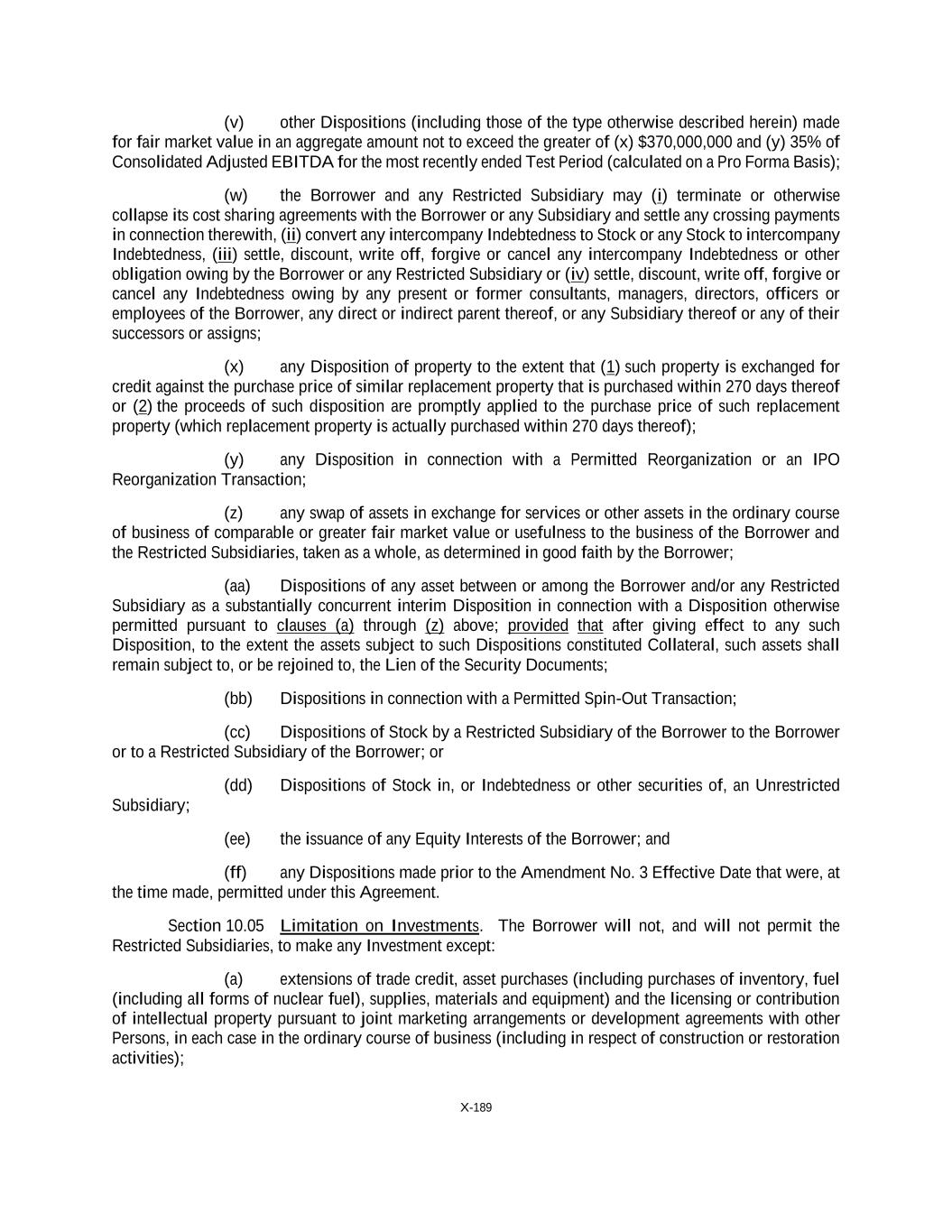 X-189 (v) other Dispositions (including those of the type otherwise described herein) made for fair market value in an aggregate amount not to exceed the greater of (x) $370,000,000 and (y) 35% of Consolidated Adjusted EBITDA for the most recently ended Test Period (calculated on a Pro Forma Basis); (w) the Borrower and any Restricted Subsidiary may (i) terminate or otherwise collapse its cost sharing agreements with the Borrower or any Subsidiary and settle any crossing payments in connection therewith, (ii) convert any intercompany Indebtedness to Stock or any Stock to intercompany Indebtedness, (iii) settle, discount, write off, forgive or cancel any intercompany Indebtedness or other obligation owing by the Borrower or any Restricted Subsidiary or (iv) settle, discount, write off, forgive or cancel any Indebtedness owing by any present or former consultants, managers, directors, officers or employees of the Borrower, any direct or indirect parent thereof, or any Subsidiary thereof or any of their successors or assigns; (x) any Disposition of property to the extent that (1) such property is exchanged for credit against the purchase price of similar replacement property that is purchased within 270 days thereof or (2) the proceeds of such disposition are promptly applied to the purchase price of such replacement property (which replacement property is actually purchased within 270 days thereof); (y) any Disposition in connection with a Permitted Reorganization or an IPO Reorganization Transaction; (z) any swap of assets in exchange for services or other assets in the ordinary course of business of comparable or greater fair market value or usefulness to the business of the Borrower and the Restricted Subsidiaries, taken as a whole, as determined in good faith by the Borrower; (aa) Dispositions of any asset between or among the Borrower and/or any Restricted Subsidiary as a substantially concurrent interim Disposition in connection with a Disposition otherwise permitted pursuant to clauses (a) through (z) above; provided that after giving effect to any such Disposition, to the extent the assets subject to such Dispositions constituted Collateral, such assets shall remain subject to, or be rejoined to, the Lien of the Security Documents; (bb) Dispositions in connection with a Permitted Spin-Out Transaction; (cc) Dispositions of Stock by a Restricted Subsidiary of the Borrower to the Borrower or to a Restricted Subsidiary of the Borrower; or (dd) Dispositions of Stock in, or Indebtedness or other securities of, an Unrestricted Subsidiary; (ee) the issuance of any Equity Interests of the Borrower; and (ff) any Dispositions made prior to the Amendment No. 3 Effective Date that were, at the time made, permitted under this Agreement. Section 10.05 Limitation on Investments. The Borrower will not, and will not permit the Restricted Subsidiaries, to make any Investment except: (a) extensions of trade credit, asset purchases (including purchases of inventory, fuel (including all forms of nuclear fuel), supplies, materials and equipment) and the licensing or contribution of intellectual property pursuant to joint marketing arrangements or development agreements with other Persons, in each case in the ordinary course of business (including in respect of construction or restoration activities);
