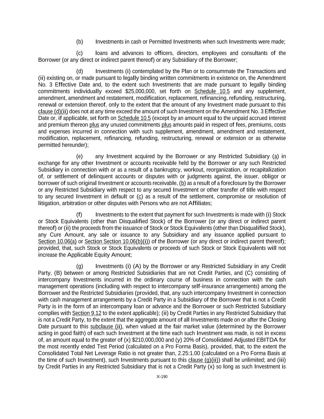 X-190 (b) Investments in cash or Permitted Investments when such Investments were made; (c) loans and advances to officers, directors, employees and consultants of the Borrower (or any direct or indirect parent thereof) or any Subsidiary of the Borrower; (d) Investments (i) contemplated by the Plan or to consummate the Transactions and (ii) existing on, or made pursuant to legally binding written commitments in existence on, the Amendment No. 3 Effective Date and, to the extent such Investments that are made pursuant to legally binding commitments individually exceed $25,000,000, set forth on Schedule 10.5 and any supplement, amendment, amendment and restatement, modification, replacement, refinancing, refunding, restructuring, renewal or extension thereof, only to the extent that the amount of any Investment made pursuant to this clause (d)(ii) does not at any time exceed the amount of such Investment on the Amendment No. 3 Effective Date or, if applicable, set forth on Schedule 10.5 (except by an amount equal to the unpaid accrued interest and premium thereon plus any unused commitments plus amounts paid in respect of fees, premiums, costs and expenses incurred in connection with such supplement, amendment, amendment and restatement, modification, replacement, refinancing, refunding, restructuring, renewal or extension or as otherwise permitted hereunder); (e) any Investment acquired by the Borrower or any Restricted Subsidiary (a) in exchange for any other Investment or accounts receivable held by the Borrower or any such Restricted Subsidiary in connection with or as a result of a bankruptcy, workout, reorganization, or recapitalization of, or settlement of delinquent accounts or disputes with or judgments against, the issuer, obligor or borrower of such original Investment or accounts receivable, (b) as a result of a foreclosure by the Borrower or any Restricted Subsidiary with respect to any secured Investment or other transfer of title with respect to any secured Investment in default or (c) as a result of the settlement, compromise or resolution of litigation, arbitration or other disputes with Persons who are not Affiliates; (f) Investments to the extent that payment for such Investments is made with (i) Stock or Stock Equivalents (other than Disqualified Stock) of the Borrower (or any direct or indirect parent thereof) or (ii) the proceeds from the issuance of Stock or Stock Equivalents (other than Disqualified Stock), any Cure Amount, any sale or issuance to any Subsidiary and any issuance applied pursuant to Section 10.06(a) or Section Section 10.06(b)(i)) of the Borrower (or any direct or indirect parent thereof); provided, that, such Stock or Stock Equivalents or proceeds of such Stock or Stock Equivalents will not increase the Applicable Equity Amount; (g) Investments (i) (A) by the Borrower or any Restricted Subsidiary in any Credit Party, (B) between or among Restricted Subsidiaries that are not Credit Parties, and (C) consisting of intercompany Investments incurred in the ordinary course of business in connection with the cash management operations (including with respect to intercompany self-insurance arrangements) among the Borrower and the Restricted Subsidiaries (provided, that, any such intercompany Investment in connection with cash management arrangements by a Credit Party in a Subsidiary of the Borrower that is not a Credit Party is in the form of an intercompany loan or advance and the Borrower or such Restricted Subsidiary complies with Section 9.12 to the extent applicable); (ii) by Credit Parties in any Restricted Subsidiary that is not a Credit Party, to the extent that the aggregate amount of all Investments made on or after the Closing Date pursuant to this subclause (ii), when valued at the fair market value (determined by the Borrower acting in good faith) of each such Investment at the time each such Investment was made, is not in excess of, an amount equal to the greater of (x) $210,000,000 and (y) 20% of Consolidated Adjusted EBITDA for the most recently ended Test Period (calculated on a Pro Forma Basis), provided, that, to the extent the Consolidated Total Net Leverage Ratio is not greater than, 2.25:1.00 (calculated on a Pro Forma Basis at the time of such Investment), such Investments pursuant to this clause (g)(ii)) shall be unlimited; and (iii) by Credit Parties in any Restricted Subsidiary that is not a Credit Party (x) so long as such Investment is
