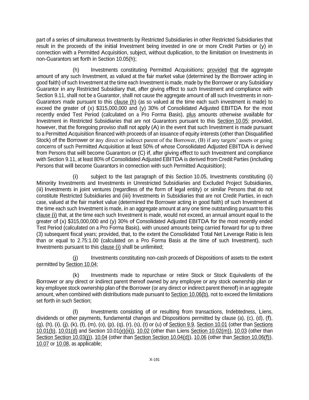 X-191 part of a series of simultaneous Investments by Restricted Subsidiaries in other Restricted Subsidiaries that result in the proceeds of the initial Investment being invested in one or more Credit Parties or (y) in connection with a Permitted Acquisition, subject, without duplication, to the limitation on Investments in non-Guarantors set forth in Section 10.05(h); (h) Investments constituting Permitted Acquisitions; provided that the aggregate amount of any such Investment, as valued at the fair market value (determined by the Borrower acting in good faith) of such Investment at the time each Investment is made, made by the Borrower or any Subsidiary Guarantor in any Restricted Subsidiary that, after giving effect to such Investment and compliance with Section 9.11, shall not be a Guarantor, shall not cause the aggregate amount of all such Investments in non- Guarantors made pursuant to this clause (h) (as so valued at the time each such investment is made) to exceed the greater of (x) $315,000,000 and (y) 30% of Consolidated Adjusted EBITDA for the most recently ended Test Period (calculated on a Pro Forma Basis), plus amounts otherwise available for Investment in Restricted Subsidiaries that are not Guarantors pursuant to this Section 10.05; provided, however, that the foregoing proviso shall not apply (A) in the event that such Investment is made pursuant to a Permitted Acquisition financed with proceeds of an issuance of equity interests (other than Disqualified Stock) of the Borrower or any direct or indirect parent of the Borrower, (B) if any targets’ assets or going concerns of such Permitted Acquisition at least 50% of whose Consolidated Adjusted EBITDA is derived from Persons that will become Guarantors or (C) if, after giving effect to such Investment and compliance with Section 9.11, at least 80% of Consolidated Adjusted EBITDA is derived from Credit Parties (including Persons that will become Guarantors in connection with such Permitted Acquisition); (i) subject to the last paragraph of this Section 10.05, Investments constituting (i) Minority Investments and Investments in Unrestricted Subsidiaries and Excluded Project Subsidiaries, (ii) Investments in joint ventures (regardless of the form of legal entity) or similar Persons that do not constitute Restricted Subsidiaries and (iii) Investments in Subsidiaries that are not Credit Parties, in each case, valued at the fair market value (determined the Borrower acting in good faith) of such Investment at the time each such Investment is made, in an aggregate amount at any one time outstanding pursuant to this clause (i) that, at the time each such Investment is made, would not exceed, an annual amount equal to the greater of (x) $315,000,000 and (y) 30% of Consolidated Adjusted EBITDA for the most recently ended Test Period (calculated on a Pro Forma Basis), with unused amounts being carried forward for up to three (3) subsequent fiscal years; provided, that, to the extent the Consolidated Total Net Leverage Ratio is less than or equal to 2.75:1.00 (calculated on a Pro Forma Basis at the time of such Investment), such Investments pursuant to this clause (i) shall be unlimited; (j) Investments constituting non-cash proceeds of Dispositions of assets to the extent permitted by Section 10.04; (k) Investments made to repurchase or retire Stock or Stock Equivalents of the Borrower or any direct or indirect parent thereof owned by any employee or any stock ownership plan or key employee stock ownership plan of the Borrower (or any direct or indirect parent thereof) in an aggregate amount, when combined with distributions made pursuant to Section 10.06(b), not to exceed the limitations set forth in such Section; (l) Investments consisting of or resulting from transactions, Indebtedness, Liens, dividends or other payments, fundamental changes and Dispositions permitted by clause (a), (c), (d), (f), (g), (h), (i), (j), (k), (l), (m), (o), (p), (q), (r), (s), (t) or (u) of Section 9.9, Section 10.01 (other than Sections 10.01(b), 10.01(d) and Section 10.01(e)(ii)), 10.02 (other than Liens Section 10.02(m)), 10.03 (other than Section Section 10.03(j)), 10.04 (other than Section Section 10.04(d)), 10.06 (other than Section 10.06(f)), 10.07 or 10.08, as applicable;