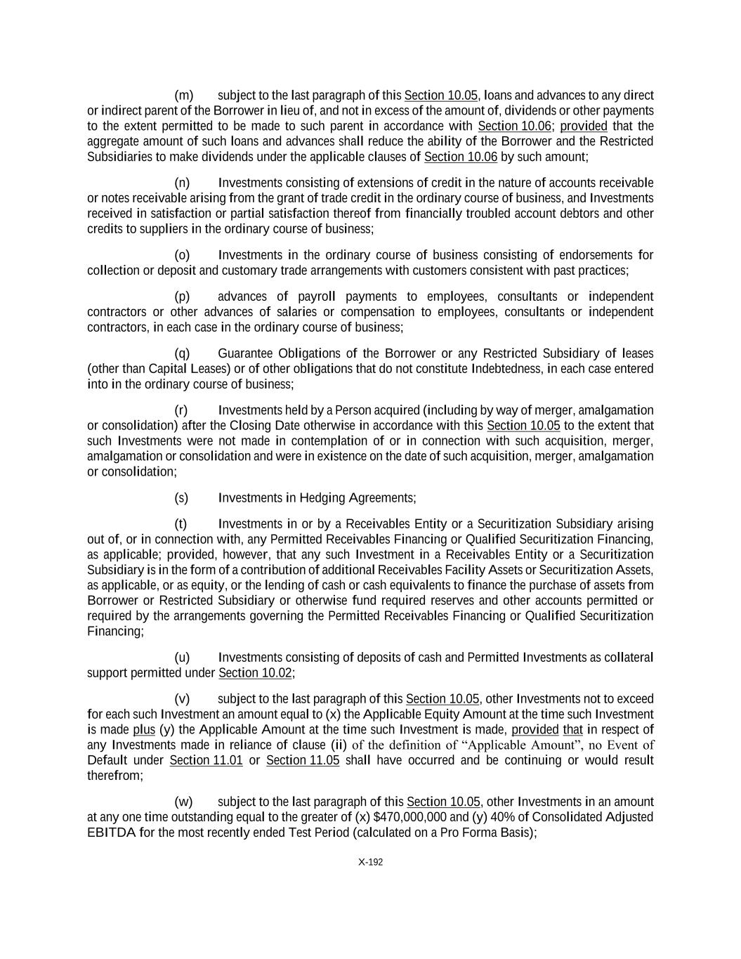 X-192 (m) subject to the last paragraph of this Section 10.05, loans and advances to any direct or indirect parent of the Borrower in lieu of, and not in excess of the amount of, dividends or other payments to the extent permitted to be made to such parent in accordance with Section 10.06; provided that the aggregate amount of such loans and advances shall reduce the ability of the Borrower and the Restricted Subsidiaries to make dividends under the applicable clauses of Section 10.06 by such amount; (n) Investments consisting of extensions of credit in the nature of accounts receivable or notes receivable arising from the grant of trade credit in the ordinary course of business, and Investments received in satisfaction or partial satisfaction thereof from financially troubled account debtors and other credits to suppliers in the ordinary course of business; (o) Investments in the ordinary course of business consisting of endorsements for collection or deposit and customary trade arrangements with customers consistent with past practices; (p) advances of payroll payments to employees, consultants or independent contractors or other advances of salaries or compensation to employees, consultants or independent contractors, in each case in the ordinary course of business; (q) Guarantee Obligations of the Borrower or any Restricted Subsidiary of leases (other than Capital Leases) or of other obligations that do not constitute Indebtedness, in each case entered into in the ordinary course of business; (r) Investments held by a Person acquired (including by way of merger, amalgamation or consolidation) after the Closing Date otherwise in accordance with this Section 10.05 to the extent that such Investments were not made in contemplation of or in connection with such acquisition, merger, amalgamation or consolidation and were in existence on the date of such acquisition, merger, amalgamation or consolidation; (s) Investments in Hedging Agreements; (t) Investments in or by a Receivables Entity or a Securitization Subsidiary arising out of, or in connection with, any Permitted Receivables Financing or Qualified Securitization Financing, as applicable; provided, however, that any such Investment in a Receivables Entity or a Securitization Subsidiary is in the form of a contribution of additional Receivables Facility Assets or Securitization Assets, as applicable, or as equity, or the lending of cash or cash equivalents to finance the purchase of assets from Borrower or Restricted Subsidiary or otherwise fund required reserves and other accounts permitted or required by the arrangements governing the Permitted Receivables Financing or Qualified Securitization Financing; (u) Investments consisting of deposits of cash and Permitted Investments as collateral support permitted under Section 10.02; (v) subject to the last paragraph of this Section 10.05, other Investments not to exceed for each such Investment an amount equal to (x) the Applicable Equity Amount at the time such Investment is made plus (y) the Applicable Amount at the time such Investment is made, provided that in respect of any Investments made in reliance of clause (ii) of the definition of “Applicable Amount”, no Event of Default under Section 11.01 or Section 11.05 shall have occurred and be continuing or would result therefrom; (w) subject to the last paragraph of this Section 10.05, other Investments in an amount at any one time outstanding equal to the greater of (x) $470,000,000 and (y) 40% of Consolidated Adjusted EBITDA for the most recently ended Test Period (calculated on a Pro Forma Basis);