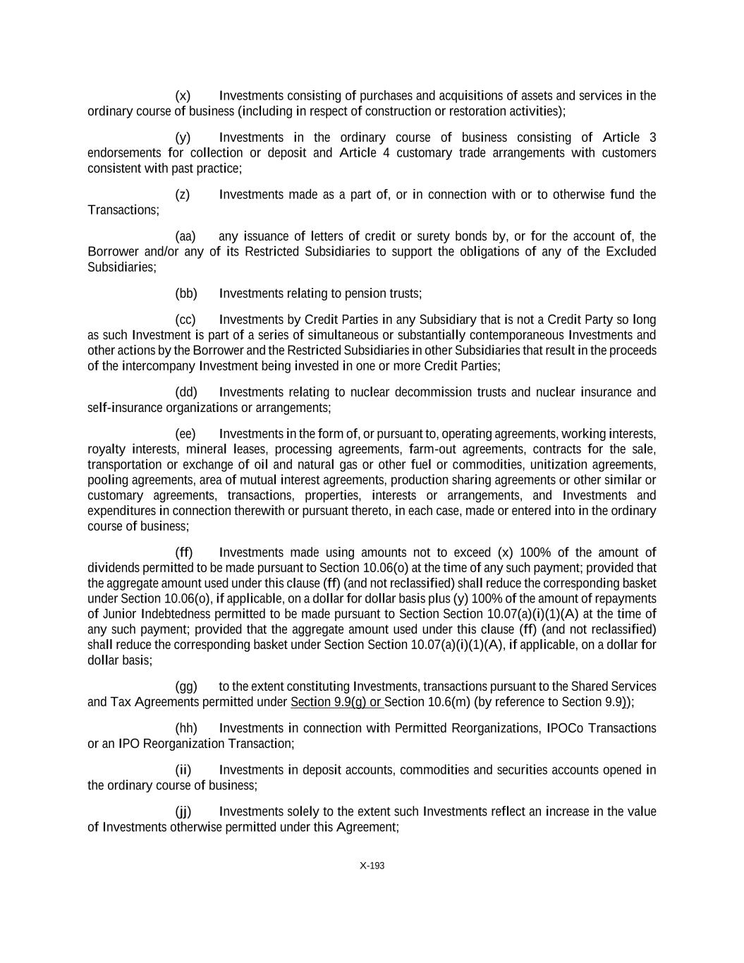 X-193 (x) Investments consisting of purchases and acquisitions of assets and services in the ordinary course of business (including in respect of construction or restoration activities); (y) Investments in the ordinary course of business consisting of Article 3 endorsements for collection or deposit and Article 4 customary trade arrangements with customers consistent with past practice; (z) Investments made as a part of, or in connection with or to otherwise fund the Transactions; (aa) any issuance of letters of credit or surety bonds by, or for the account of, the Borrower and/or any of its Restricted Subsidiaries to support the obligations of any of the Excluded Subsidiaries; (bb) Investments relating to pension trusts; (cc) Investments by Credit Parties in any Subsidiary that is not a Credit Party so long as such Investment is part of a series of simultaneous or substantially contemporaneous Investments and other actions by the Borrower and the Restricted Subsidiaries in other Subsidiaries that result in the proceeds of the intercompany Investment being invested in one or more Credit Parties; (dd) Investments relating to nuclear decommission trusts and nuclear insurance and self-insurance organizations or arrangements; (ee) Investments in the form of, or pursuant to, operating agreements, working interests, royalty interests, mineral leases, processing agreements, farm-out agreements, contracts for the sale, transportation or exchange of oil and natural gas or other fuel or commodities, unitization agreements, pooling agreements, area of mutual interest agreements, production sharing agreements or other similar or customary agreements, transactions, properties, interests or arrangements, and Investments and expenditures in connection therewith or pursuant thereto, in each case, made or entered into in the ordinary course of business; (ff) Investments made using amounts not to exceed (x) 100% of the amount of dividends permitted to be made pursuant to Section 10.06(o) at the time of any such payment; provided that the aggregate amount used under this clause (ff) (and not reclassified) shall reduce the corresponding basket under Section 10.06(o), if applicable, on a dollar for dollar basis plus (y) 100% of the amount of repayments of Junior Indebtedness permitted to be made pursuant to Section Section 10.07(a)(i)(1)(A) at the time of any such payment; provided that the aggregate amount used under this clause (ff) (and not reclassified) shall reduce the corresponding basket under Section Section 10.07(a)(i)(1)(A), if applicable, on a dollar for dollar basis; (gg) to the extent constituting Investments, transactions pursuant to the Shared Services and Tax Agreements permitted under Section 9.9(g) or Section 10.6(m) (by reference to Section 9.9)); (hh) Investments in connection with Permitted Reorganizations, IPOCo Transactions or an IPO Reorganization Transaction; (ii) Investments in deposit accounts, commodities and securities accounts opened in the ordinary course of business; (jj) Investments solely to the extent such Investments reflect an increase in the value of Investments otherwise permitted under this Agreement;