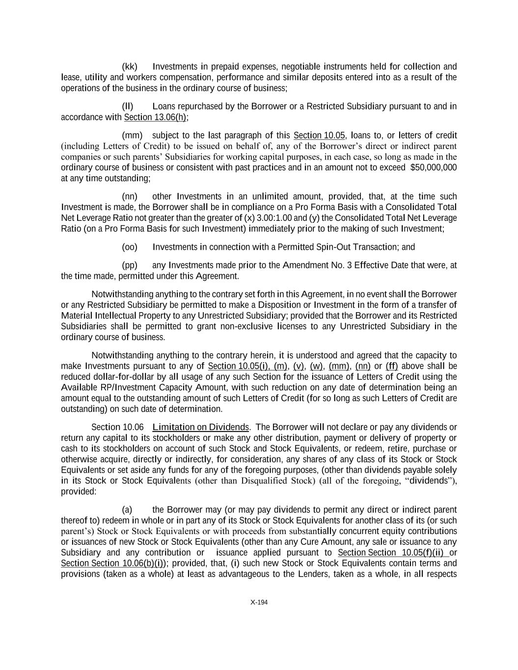 X-194 (kk) Investments in prepaid expenses, negotiable instruments held for collection and lease, utility and workers compensation, performance and similar deposits entered into as a result of the operations of the business in the ordinary course of business; (ll) Loans repurchased by the Borrower or a Restricted Subsidiary pursuant to and in accordance with Section 13.06(h); (mm) subject to the last paragraph of this Section 10.05, loans to, or letters of credit (including Letters of Credit) to be issued on behalf of, any of the Borrower’s direct or indirect parent companies or such parents’ Subsidiaries for working capital purposes, in each case, so long as made in the ordinary course of business or consistent with past practices and in an amount not to exceed $50,000,000 at any time outstanding; (nn) other Investments in an unlimited amount, provided, that, at the time such Investment is made, the Borrower shall be in compliance on a Pro Forma Basis with a Consolidated Total Net Leverage Ratio not greater than the greater of (x) 3.00:1.00 and (y) the Consolidated Total Net Leverage Ratio (on a Pro Forma Basis for such Investment) immediately prior to the making of such Investment; (oo) Investments in connection with a Permitted Spin-Out Transaction; and (pp) any Investments made prior to the Amendment No. 3 Effective Date that were, at the time made, permitted under this Agreement. Notwithstanding anything to the contrary set forth in this Agreement, in no event shall the Borrower or any Restricted Subsidiary be permitted to make a Disposition or Investment in the form of a transfer of Material Intellectual Property to any Unrestricted Subsidiary; provided that the Borrower and its Restricted Subsidiaries shall be permitted to grant non-exclusive licenses to any Unrestricted Subsidiary in the ordinary course of business. Notwithstanding anything to the contrary herein, it is understood and agreed that the capacity to make Investments pursuant to any of Section 10.05(i), (m), (v), (w), (mm), (nn) or (ff) above shall be reduced dollar-for-dollar by all usage of any such Section for the issuance of Letters of Credit using the Available RP/Investment Capacity Amount, with such reduction on any date of determination being an amount equal to the outstanding amount of such Letters of Credit (for so long as such Letters of Credit are outstanding) on such date of determination. Section 10.06 Limitation on Dividends. The Borrower will not declare or pay any dividends or return any capital to its stockholders or make any other distribution, payment or delivery of property or cash to its stockholders on account of such Stock and Stock Equivalents, or redeem, retire, purchase or otherwise acquire, directly or indirectly, for consideration, any shares of any class of its Stock or Stock Equivalents or set aside any funds for any of the foregoing purposes, (other than dividends payable solely in its Stock or Stock Equivalents (other than Disqualified Stock) (all of the foregoing, “dividends”), provided: (a) the Borrower may (or may pay dividends to permit any direct or indirect parent thereof to) redeem in whole or in part any of its Stock or Stock Equivalents for another class of its (or such parent’s) Stock or Stock Equivalents or with proceeds from substantially concurrent equity contributions or issuances of new Stock or Stock Equivalents (other than any Cure Amount, any sale or issuance to any Subsidiary and any contribution or issuance applied pursuant to Section Section 10.05(f)(ii) or Section Section 10.06(b)(i)); provided, that, (i) such new Stock or Stock Equivalents contain terms and provisions (taken as a whole) at least as advantageous to the Lenders, taken as a whole, in all respects