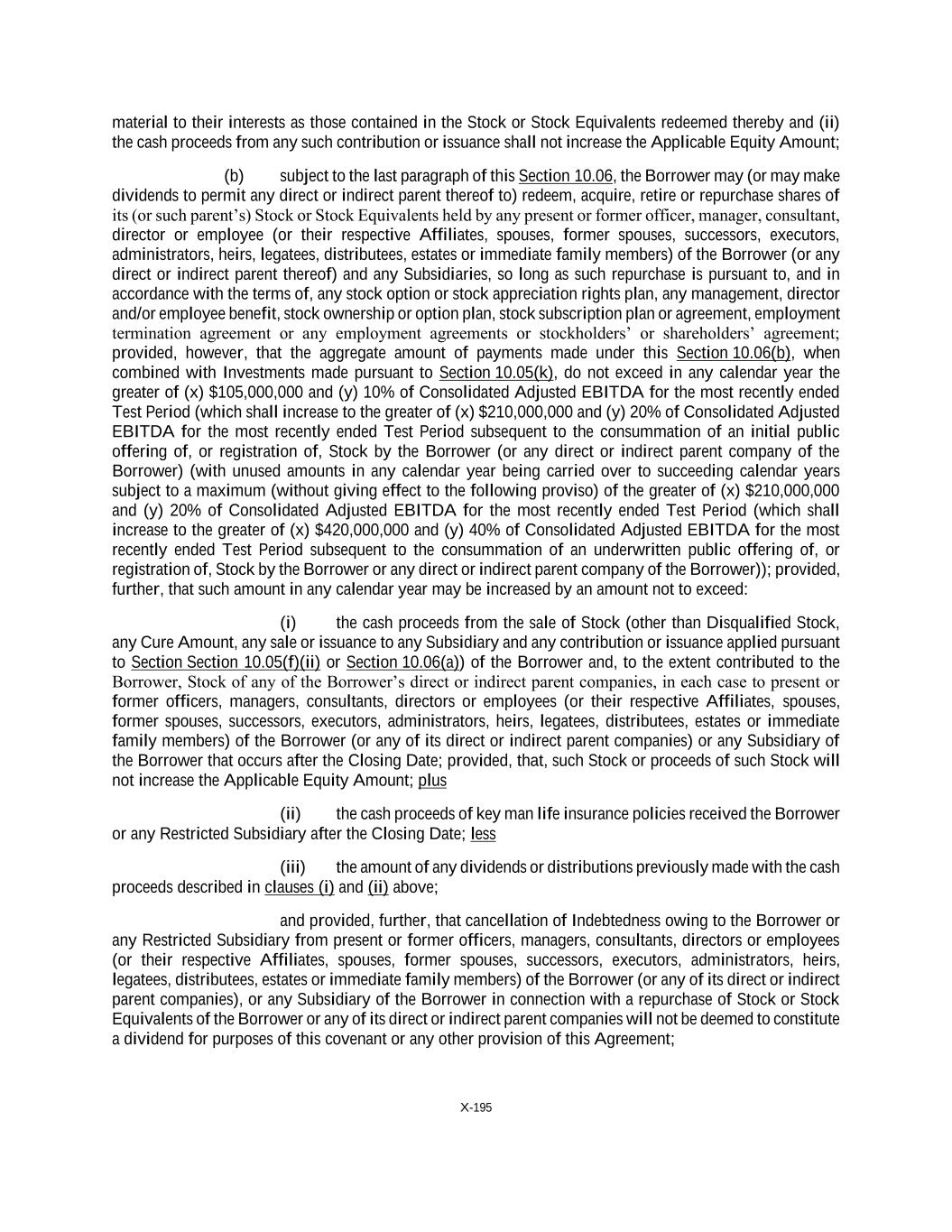 X-195 material to their interests as those contained in the Stock or Stock Equivalents redeemed thereby and (ii) the cash proceeds from any such contribution or issuance shall not increase the Applicable Equity Amount; (b) subject to the last paragraph of this Section 10.06, the Borrower may (or may make dividends to permit any direct or indirect parent thereof to) redeem, acquire, retire or repurchase shares of its (or such parent’s) Stock or Stock Equivalents held by any present or former officer, manager, consultant, director or employee (or their respective Affiliates, spouses, former spouses, successors, executors, administrators, heirs, legatees, distributees, estates or immediate family members) of the Borrower (or any direct or indirect parent thereof) and any Subsidiaries, so long as such repurchase is pursuant to, and in accordance with the terms of, any stock option or stock appreciation rights plan, any management, director and/or employee benefit, stock ownership or option plan, stock subscription plan or agreement, employment termination agreement or any employment agreements or stockholders’ or shareholders’ agreement; provided, however, that the aggregate amount of payments made under this Section 10.06(b), when combined with Investments made pursuant to Section 10.05(k), do not exceed in any calendar year the greater of (x) $105,000,000 and (y) 10% of Consolidated Adjusted EBITDA for the most recently ended Test Period (which shall increase to the greater of (x) $210,000,000 and (y) 20% of Consolidated Adjusted EBITDA for the most recently ended Test Period subsequent to the consummation of an initial public offering of, or registration of, Stock by the Borrower (or any direct or indirect parent company of the Borrower) (with unused amounts in any calendar year being carried over to succeeding calendar years subject to a maximum (without giving effect to the following proviso) of the greater of (x) $210,000,000 and (y) 20% of Consolidated Adjusted EBITDA for the most recently ended Test Period (which shall increase to the greater of (x) $420,000,000 and (y) 40% of Consolidated Adjusted EBITDA for the most recently ended Test Period subsequent to the consummation of an underwritten public offering of, or registration of, Stock by the Borrower or any direct or indirect parent company of the Borrower)); provided, further, that such amount in any calendar year may be increased by an amount not to exceed: (i) the cash proceeds from the sale of Stock (other than Disqualified Stock, any Cure Amount, any sale or issuance to any Subsidiary and any contribution or issuance applied pursuant to Section Section 10.05(f)(ii) or Section 10.06(a)) of the Borrower and, to the extent contributed to the Borrower, Stock of any of the Borrower’s direct or indirect parent companies, in each case to present or former officers, managers, consultants, directors or employees (or their respective Affiliates, spouses, former spouses, successors, executors, administrators, heirs, legatees, distributees, estates or immediate family members) of the Borrower (or any of its direct or indirect parent companies) or any Subsidiary of the Borrower that occurs after the Closing Date; provided, that, such Stock or proceeds of such Stock will not increase the Applicable Equity Amount; plus (ii) the cash proceeds of key man life insurance policies received the Borrower or any Restricted Subsidiary after the Closing Date; less (iii) the amount of any dividends or distributions previously made with the cash proceeds described in clauses (i) and (ii) above; and provided, further, that cancellation of Indebtedness owing to the Borrower or any Restricted Subsidiary from present or former officers, managers, consultants, directors or employees (or their respective Affiliates, spouses, former spouses, successors, executors, administrators, heirs, legatees, distributees, estates or immediate family members) of the Borrower (or any of its direct or indirect parent companies), or any Subsidiary of the Borrower in connection with a repurchase of Stock or Stock Equivalents of the Borrower or any of its direct or indirect parent companies will not be deemed to constitute a dividend for purposes of this covenant or any other provision of this Agreement;