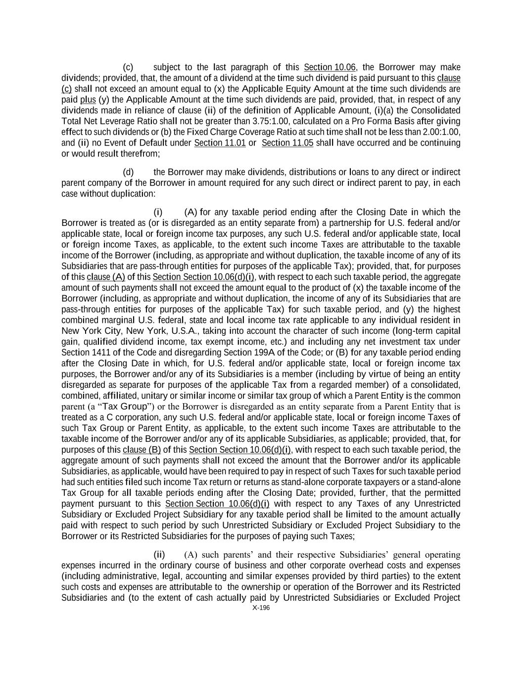 X-196 (c) subject to the last paragraph of this Section 10.06, the Borrower may make dividends; provided, that, the amount of a dividend at the time such dividend is paid pursuant to this clause (c) shall not exceed an amount equal to (x) the Applicable Equity Amount at the time such dividends are paid plus (y) the Applicable Amount at the time such dividends are paid, provided, that, in respect of any dividends made in reliance of clause (ii) of the definition of Applicable Amount, (i)(a) the Consolidated Total Net Leverage Ratio shall not be greater than 3.75:1.00, calculated on a Pro Forma Basis after giving effect to such dividends or (b) the Fixed Charge Coverage Ratio at such time shall not be less than 2.00:1.00, and (ii) no Event of Default under Section 11.01 or Section 11.05 shall have occurred and be continuing or would result therefrom; (d) the Borrower may make dividends, distributions or loans to any direct or indirect parent company of the Borrower in amount required for any such direct or indirect parent to pay, in each case without duplication: (i) (A) for any taxable period ending after the Closing Date in which the Borrower is treated as (or is disregarded as an entity separate from) a partnership for U.S. federal and/or applicable state, local or foreign income tax purposes, any such U.S. federal and/or applicable state, local or foreign income Taxes, as applicable, to the extent such income Taxes are attributable to the taxable income of the Borrower (including, as appropriate and without duplication, the taxable income of any of its Subsidiaries that are pass-through entities for purposes of the applicable Tax); provided, that, for purposes of this clause (A) of this Section Section 10.06(d)(i), with respect to each such taxable period, the aggregate amount of such payments shall not exceed the amount equal to the product of (x) the taxable income of the Borrower (including, as appropriate and without duplication, the income of any of its Subsidiaries that are pass-through entities for purposes of the applicable Tax) for such taxable period, and (y) the highest combined marginal U.S. federal, state and local income tax rate applicable to any individual resident in New York City, New York, U.S.A., taking into account the character of such income (long-term capital gain, qualified dividend income, tax exempt income, etc.) and including any net investment tax under Section 1411 of the Code and disregarding Section 199A of the Code; or (B) for any taxable period ending after the Closing Date in which, for U.S. federal and/or applicable state, local or foreign income tax purposes, the Borrower and/or any of its Subsidiaries is a member (including by virtue of being an entity disregarded as separate for purposes of the applicable Tax from a regarded member) of a consolidated, combined, affiliated, unitary or similar income or similar tax group of which a Parent Entity is the common parent (a “Tax Group”) or the Borrower is disregarded as an entity separate from a Parent Entity that is treated as a C corporation, any such U.S. federal and/or applicable state, local or foreign income Taxes of such Tax Group or Parent Entity, as applicable, to the extent such income Taxes are attributable to the taxable income of the Borrower and/or any of its applicable Subsidiaries, as applicable; provided, that, for purposes of this clause (B) of this Section Section 10.06(d)(i), with respect to each such taxable period, the aggregate amount of such payments shall not exceed the amount that the Borrower and/or its applicable Subsidiaries, as applicable, would have been required to pay in respect of such Taxes for such taxable period had such entities filed such income Tax return or returns as stand-alone corporate taxpayers or a stand-alone Tax Group for all taxable periods ending after the Closing Date; provided, further, that the permitted payment pursuant to this Section Section 10.06(d)(i) with respect to any Taxes of any Unrestricted Subsidiary or Excluded Project Subsidiary for any taxable period shall be limited to the amount actually paid with respect to such period by such Unrestricted Subsidiary or Excluded Project Subsidiary to the Borrower or its Restricted Subsidiaries for the purposes of paying such Taxes; (ii) (A) such parents’ and their respective Subsidiaries’ general operating expenses incurred in the ordinary course of business and other corporate overhead costs and expenses (including administrative, legal, accounting and similar expenses provided by third parties) to the extent such costs and expenses are attributable to the ownership or operation of the Borrower and its Restricted Subsidiaries and (to the extent of cash actually paid by Unrestricted Subsidiaries or Excluded Project