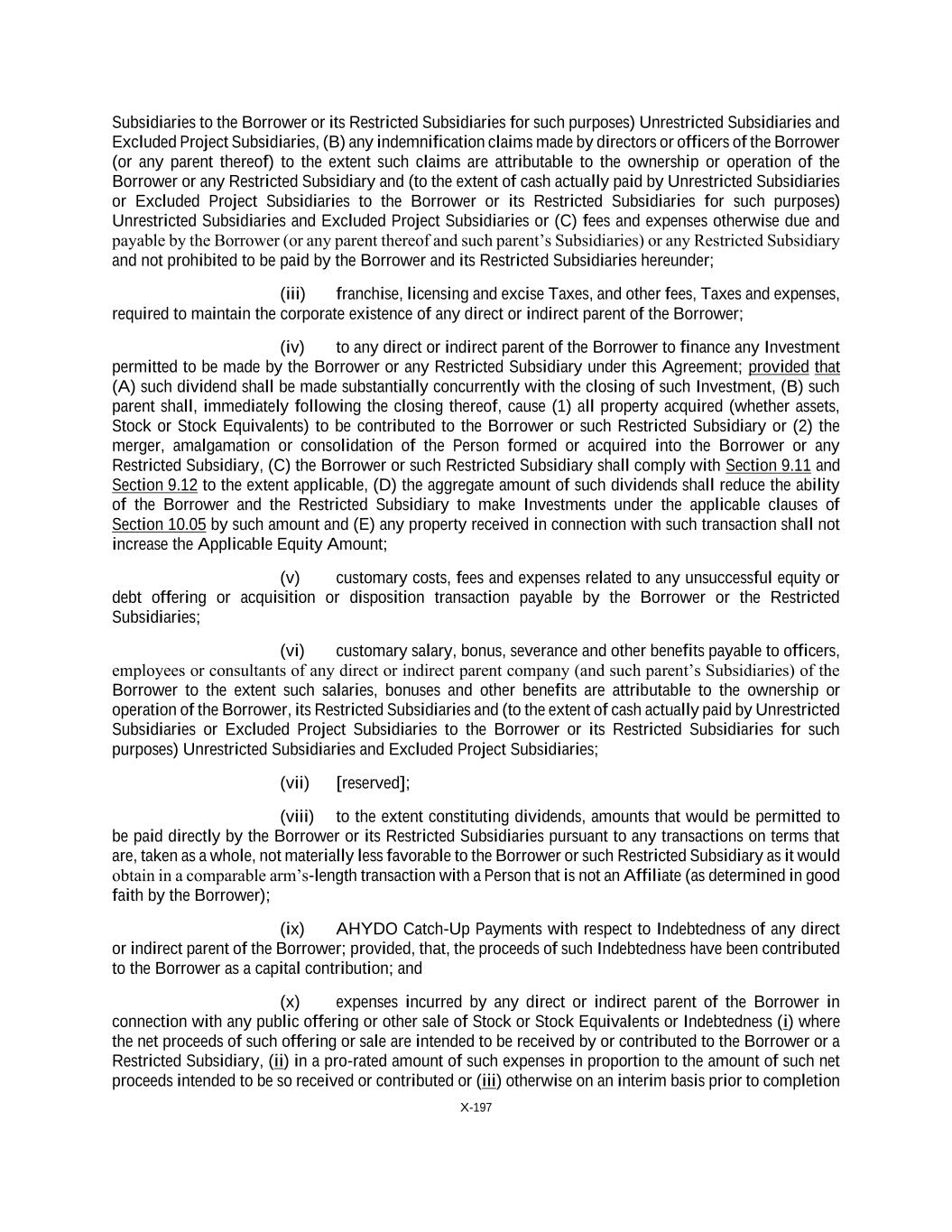 X-197 Subsidiaries to the Borrower or its Restricted Subsidiaries for such purposes) Unrestricted Subsidiaries and Excluded Project Subsidiaries, (B) any indemnification claims made by directors or officers of the Borrower (or any parent thereof) to the extent such claims are attributable to the ownership or operation of the Borrower or any Restricted Subsidiary and (to the extent of cash actually paid by Unrestricted Subsidiaries or Excluded Project Subsidiaries to the Borrower or its Restricted Subsidiaries for such purposes) Unrestricted Subsidiaries and Excluded Project Subsidiaries or (C) fees and expenses otherwise due and payable by the Borrower (or any parent thereof and such parent’s Subsidiaries) or any Restricted Subsidiary and not prohibited to be paid by the Borrower and its Restricted Subsidiaries hereunder; (iii) franchise, licensing and excise Taxes, and other fees, Taxes and expenses, required to maintain the corporate existence of any direct or indirect parent of the Borrower; (iv) to any direct or indirect parent of the Borrower to finance any Investment permitted to be made by the Borrower or any Restricted Subsidiary under this Agreement; provided that (A) such dividend shall be made substantially concurrently with the closing of such Investment, (B) such parent shall, immediately following the closing thereof, cause (1) all property acquired (whether assets, Stock or Stock Equivalents) to be contributed to the Borrower or such Restricted Subsidiary or (2) the merger, amalgamation or consolidation of the Person formed or acquired into the Borrower or any Restricted Subsidiary, (C) the Borrower or such Restricted Subsidiary shall comply with Section 9.11 and Section 9.12 to the extent applicable, (D) the aggregate amount of such dividends shall reduce the ability of the Borrower and the Restricted Subsidiary to make Investments under the applicable clauses of Section 10.05 by such amount and (E) any property received in connection with such transaction shall not increase the Applicable Equity Amount; (v) customary costs, fees and expenses related to any unsuccessful equity or debt offering or acquisition or disposition transaction payable by the Borrower or the Restricted Subsidiaries; (vi) customary salary, bonus, severance and other benefits payable to officers, employees or consultants of any direct or indirect parent company (and such parent’s Subsidiaries) of the Borrower to the extent such salaries, bonuses and other benefits are attributable to the ownership or operation of the Borrower, its Restricted Subsidiaries and (to the extent of cash actually paid by Unrestricted Subsidiaries or Excluded Project Subsidiaries to the Borrower or its Restricted Subsidiaries for such purposes) Unrestricted Subsidiaries and Excluded Project Subsidiaries; (vii) [reserved]; (viii) to the extent constituting dividends, amounts that would be permitted to be paid directly by the Borrower or its Restricted Subsidiaries pursuant to any transactions on terms that are, taken as a whole, not materially less favorable to the Borrower or such Restricted Subsidiary as it would obtain in a comparable arm’s-length transaction with a Person that is not an Affiliate (as determined in good faith by the Borrower); (ix) AHYDO Catch-Up Payments with respect to Indebtedness of any direct or indirect parent of the Borrower; provided, that, the proceeds of such Indebtedness have been contributed to the Borrower as a capital contribution; and (x) expenses incurred by any direct or indirect parent of the Borrower in connection with any public offering or other sale of Stock or Stock Equivalents or Indebtedness (i) where the net proceeds of such offering or sale are intended to be received by or contributed to the Borrower or a Restricted Subsidiary, (ii) in a pro-rated amount of such expenses in proportion to the amount of such net proceeds intended to be so received or contributed or (iii) otherwise on an interim basis prior to completion