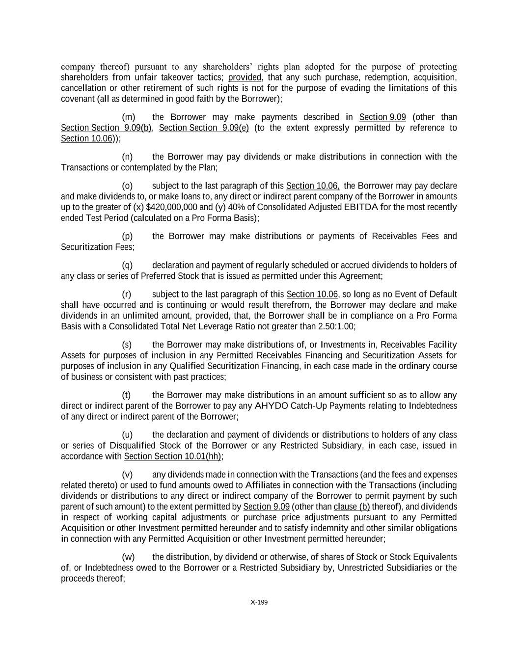 X-199 company thereof) pursuant to any shareholders’ rights plan adopted for the purpose of protecting shareholders from unfair takeover tactics; provided, that any such purchase, redemption, acquisition, cancellation or other retirement of such rights is not for the purpose of evading the limitations of this covenant (all as determined in good faith by the Borrower); (m) the Borrower may make payments described in Section 9.09 (other than Section Section 9.09(b), Section Section 9.09(e) (to the extent expressly permitted by reference to Section 10.06)); (n) the Borrower may pay dividends or make distributions in connection with the Transactions or contemplated by the Plan; (o) subject to the last paragraph of this Section 10.06, the Borrower may pay declare and make dividends to, or make loans to, any direct or indirect parent company of the Borrower in amounts up to the greater of (x) $420,000,000 and (y) 40% of Consolidated Adjusted EBITDA for the most recently ended Test Period (calculated on a Pro Forma Basis); (p) the Borrower may make distributions or payments of Receivables Fees and Securitization Fees; (q) declaration and payment of regularly scheduled or accrued dividends to holders of any class or series of Preferred Stock that is issued as permitted under this Agreement; (r) subject to the last paragraph of this Section 10.06, so long as no Event of Default shall have occurred and is continuing or would result therefrom, the Borrower may declare and make dividends in an unlimited amount, provided, that, the Borrower shall be in compliance on a Pro Forma Basis with a Consolidated Total Net Leverage Ratio not greater than 2.50:1.00; (s) the Borrower may make distributions of, or Investments in, Receivables Facility Assets for purposes of inclusion in any Permitted Receivables Financing and Securitization Assets for purposes of inclusion in any Qualified Securitization Financing, in each case made in the ordinary course of business or consistent with past practices; (t) the Borrower may make distributions in an amount sufficient so as to allow any direct or indirect parent of the Borrower to pay any AHYDO Catch-Up Payments relating to Indebtedness of any direct or indirect parent of the Borrower; (u) the declaration and payment of dividends or distributions to holders of any class or series of Disqualified Stock of the Borrower or any Restricted Subsidiary, in each case, issued in accordance with Section Section 10.01(hh); (v) any dividends made in connection with the Transactions (and the fees and expenses related thereto) or used to fund amounts owed to Affiliates in connection with the Transactions (including dividends or distributions to any direct or indirect company of the Borrower to permit payment by such parent of such amount) to the extent permitted by Section 9.09 (other than clause (b) thereof), and dividends in respect of working capital adjustments or purchase price adjustments pursuant to any Permitted Acquisition or other Investment permitted hereunder and to satisfy indemnity and other similar obligations in connection with any Permitted Acquisition or other Investment permitted hereunder; (w) the distribution, by dividend or otherwise, of shares of Stock or Stock Equivalents of, or Indebtedness owed to the Borrower or a Restricted Subsidiary by, Unrestricted Subsidiaries or the proceeds thereof;