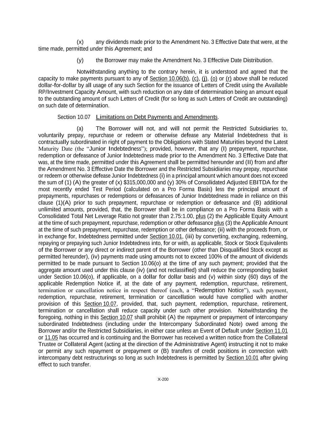 X-200 (x) any dividends made prior to the Amendment No. 3 Effective Date that were, at the time made, permitted under this Agreement; and (y) the Borrower may make the Amendment No. 3 Effective Date Distribution. Notwithstanding anything to the contrary herein, it is understood and agreed that the capacity to make payments pursuant to any of Section 10.06(b), (c), (j), (o) or (r) above shall be reduced dollar-for-dollar by all usage of any such Section for the issuance of Letters of Credit using the Available RP/Investment Capacity Amount, with such reduction on any date of determination being an amount equal to the outstanding amount of such Letters of Credit (for so long as such Letters of Credit are outstanding) on such date of determination. Section 10.07 Limitations on Debt Payments and Amendments. (a) The Borrower will not, and will not permit the Restricted Subsidiaries to, voluntarily prepay, repurchase or redeem or otherwise defease any Material Indebtedness that is contractually subordinated in right of payment to the Obligations with Stated Maturities beyond the Latest Maturity Date (the “Junior Indebtedness”); provided, however, that any (I) prepayment, repurchase, redemption or defeasance of Junior Indebtedness made prior to the Amendment No. 3 Effective Date that was, at the time made, permitted under this Agreement shall be permitted hereunder and (II) from and after the Amendment No. 3 Effective Date the Borrower and the Restricted Subsidiaries may prepay, repurchase or redeem or otherwise defease Junior Indebtedness (i) in a principal amount which amount does not exceed the sum of (1) (A) the greater of (x) $315,000,000 and (y) 30% of Consolidated Adjusted EBITDA for the most recently ended Test Period (calculated on a Pro Forma Basis) less the principal amount of prepayments, repurchases or redemptions or defeasances of Junior Indebtedness made in reliance on this clause (1)(A) prior to such prepayment, repurchase or redemption or defeasance and (B) additional unlimited amounts, provided, that, the Borrower shall be in compliance on a Pro Forma Basis with a Consolidated Total Net Leverage Ratio not greater than 2.75:1.00, plus (2) the Applicable Equity Amount at the time of such prepayment, repurchase, redemption or other defeasance plus (3) the Applicable Amount at the time of such prepayment, repurchase, redemption or other defeasance; (ii) with the proceeds from, or in exchange for, Indebtedness permitted under Section 10.01, (iii) by converting, exchanging, redeeming, repaying or prepaying such Junior Indebtedness into, for or with, as applicable, Stock or Stock Equivalents of the Borrower or any direct or indirect parent of the Borrower (other than Disqualified Stock except as permitted hereunder), (iv) payments made using amounts not to exceed 100% of the amount of dividends permitted to be made pursuant to Section 10.06(o) at the time of any such payment; provided that the aggregate amount used under this clause (iv) (and not reclassified) shall reduce the corresponding basket under Section 10.06(o), if applicable, on a dollar for dollar basis and (v) within sixty (60) days of the applicable Redemption Notice if, at the date of any payment, redemption, repurchase, retirement, termination or cancellation notice in respect thereof (each, a “Redemption Notice”), such payment, redemption, repurchase, retirement, termination or cancellation would have complied with another provision of this Section 10.07, provided, that, such payment, redemption, repurchase, retirement, termination or cancellation shall reduce capacity under such other provision. Notwithstanding the foregoing, nothing in this Section 10.07 shall prohibit (A) the repayment or prepayment of intercompany subordinated Indebtedness (including under the Intercompany Subordinated Note) owed among the Borrower and/or the Restricted Subsidiaries, in either case unless an Event of Default under Section 11.01 or 11.05 has occurred and is continuing and the Borrower has received a written notice from the Collateral Trustee or Collateral Agent (acting at the direction of the Administrative Agent) instructing it not to make or permit any such repayment or prepayment or (B) transfers of credit positions in connection with intercompany debt restructurings so long as such Indebtedness is permitted by Section 10.01 after giving effect to such transfer.